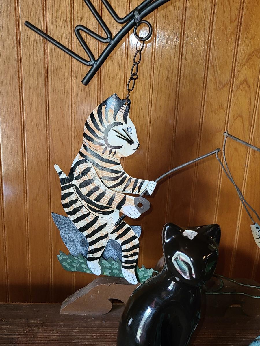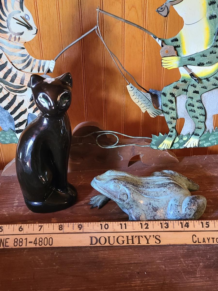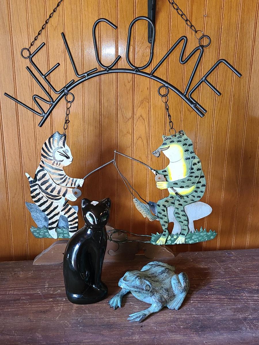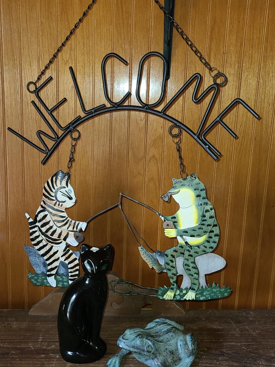 LOT 1234: Two Metal Signs (Cat/Frog Fishing)/Dept 56 Metal Frog/Ceramic Vintage Cat