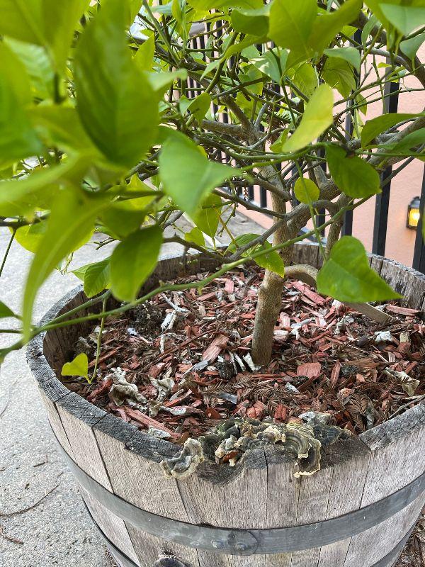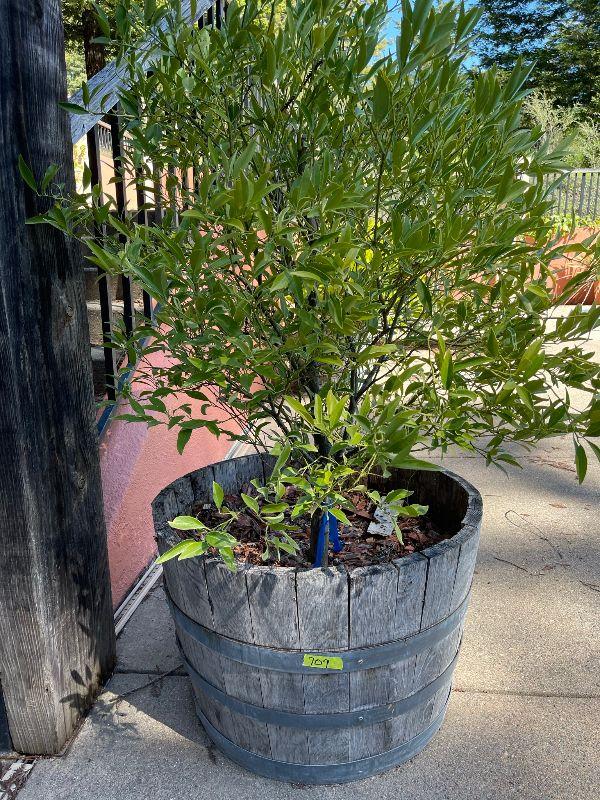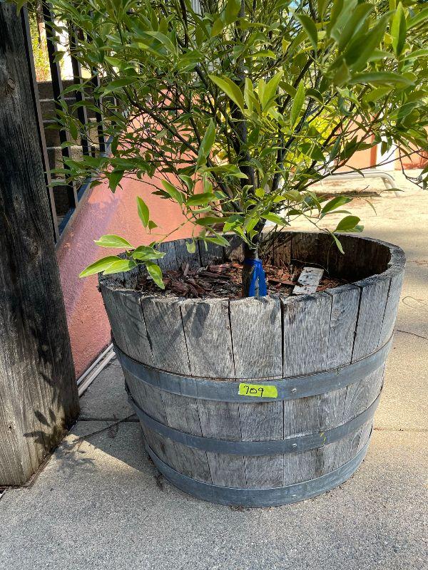 half wine barrel with olive tree
