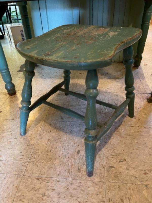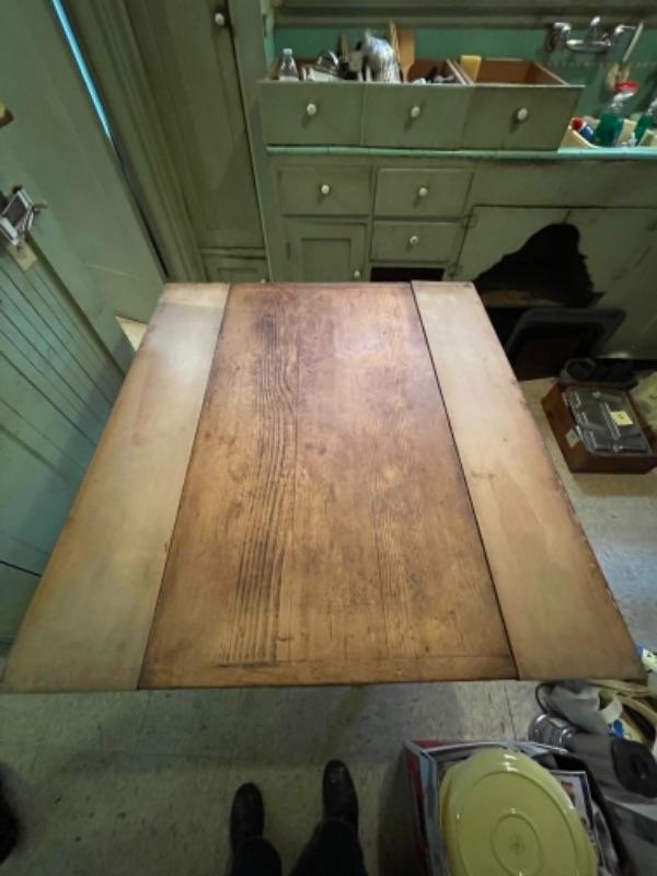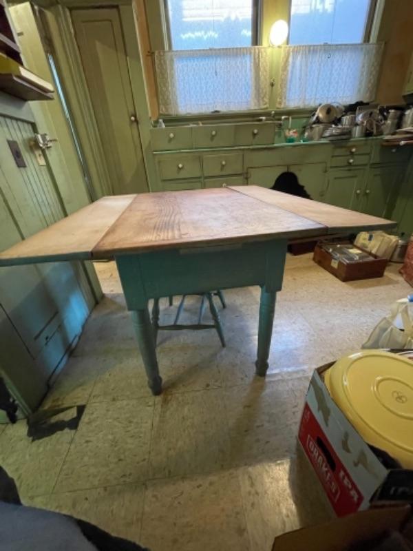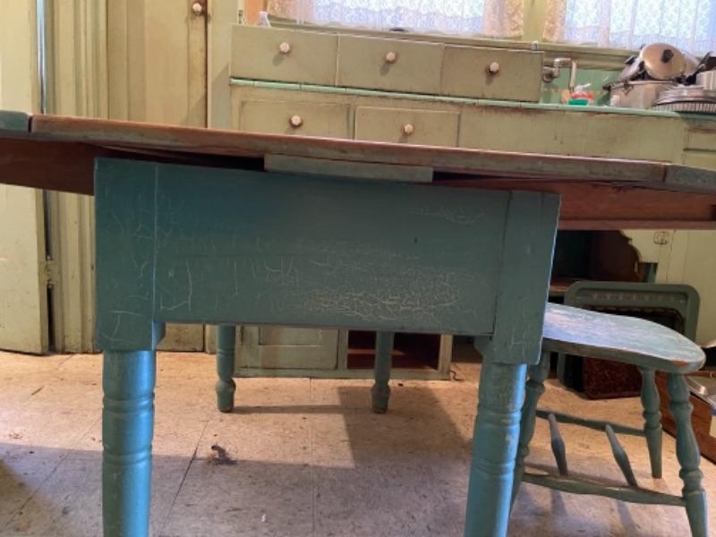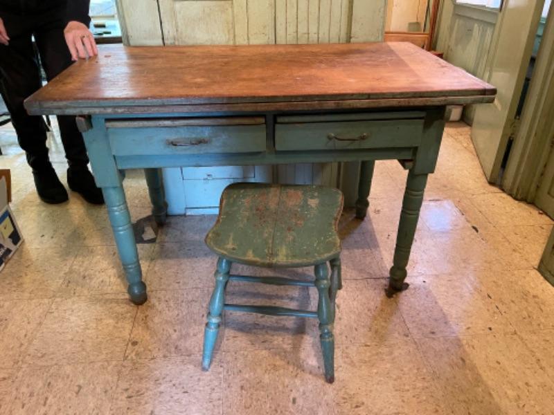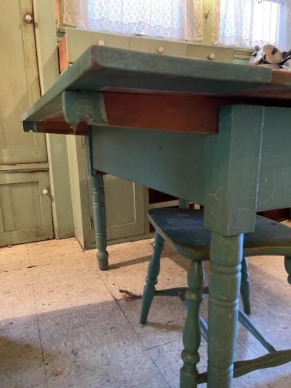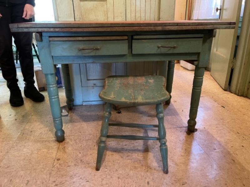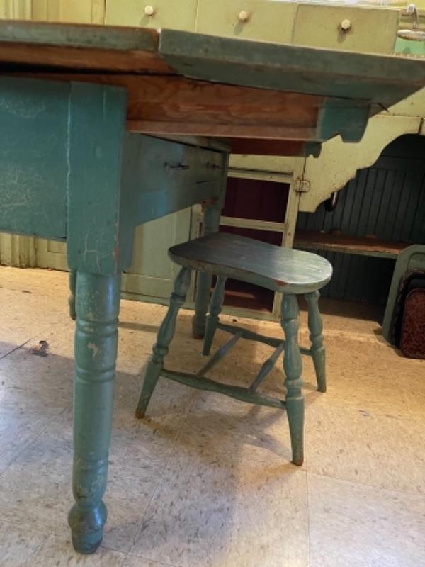 Lot 70K. Antique original sturdy green-painted pine kitchen table with drawers and pull-out shelves (45” x 48” when leaves extended; 26” x 48” closed; 30” high) with stool--$250