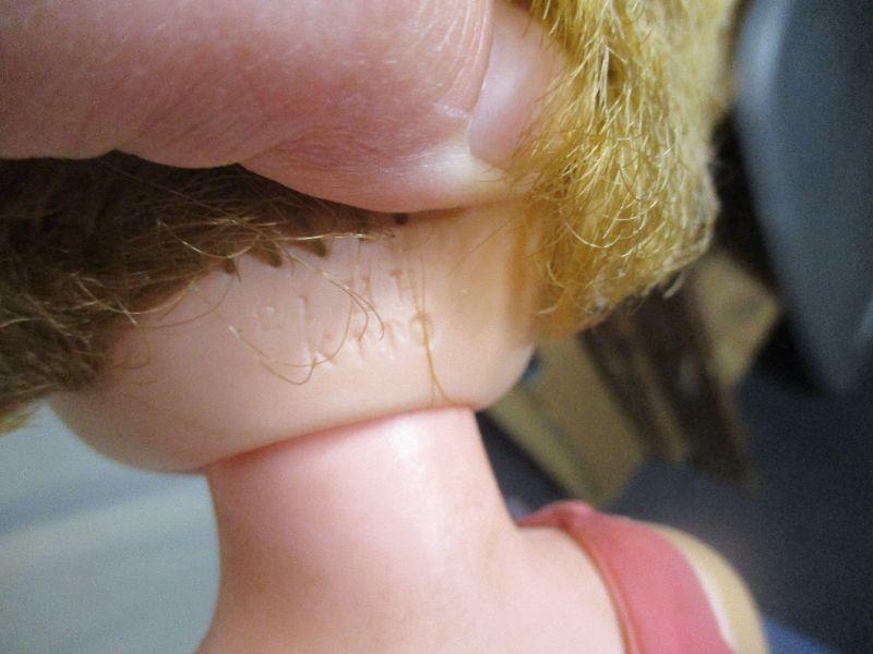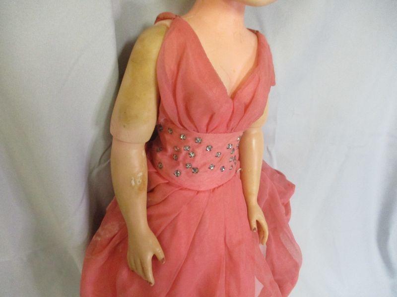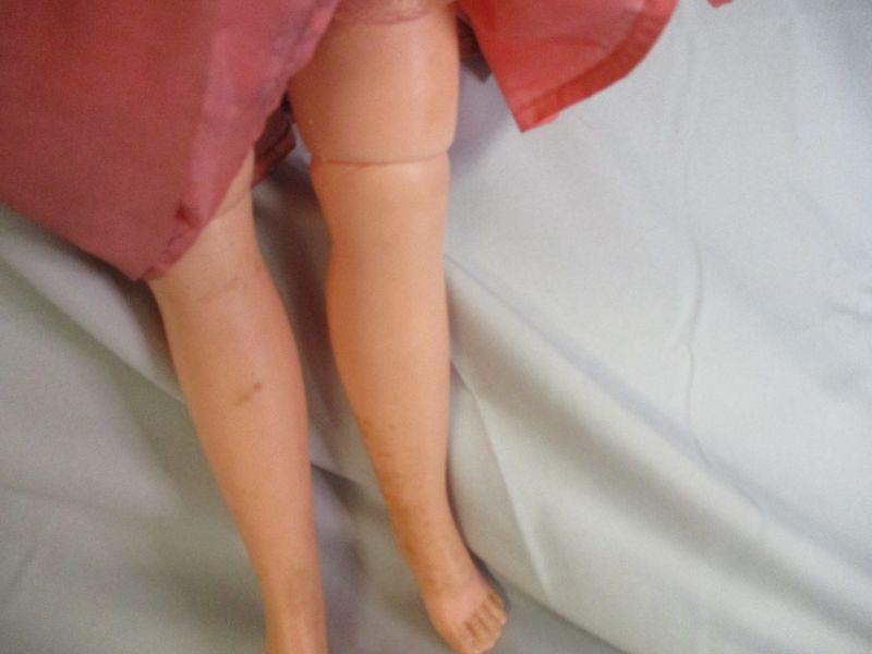 This doll is tall and has "joints" at her elbows and knees. Her knees seem to have better flexibility than mine. She is about 21.5" tall and ready to be cleaned up for an elegant dinner party. The markings on the back of her head are: "21 H H K 110" which I Googled and it is listed as belonging to a "Deluxe Reading Candy Doll"