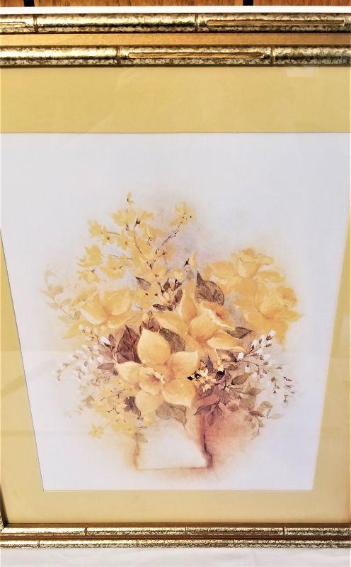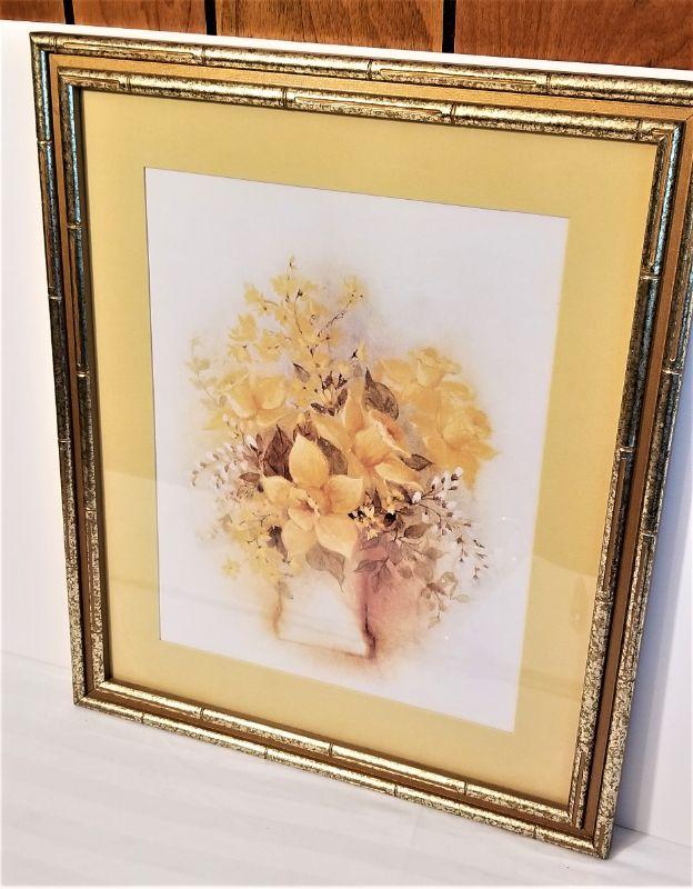 I think I've seen one like this in the Brady Bunch house.....Cheery Yellow Floral print...oh....so 70's! Good condition, measures 17" wide, 20" tall. Gilded Bamboo style frame.