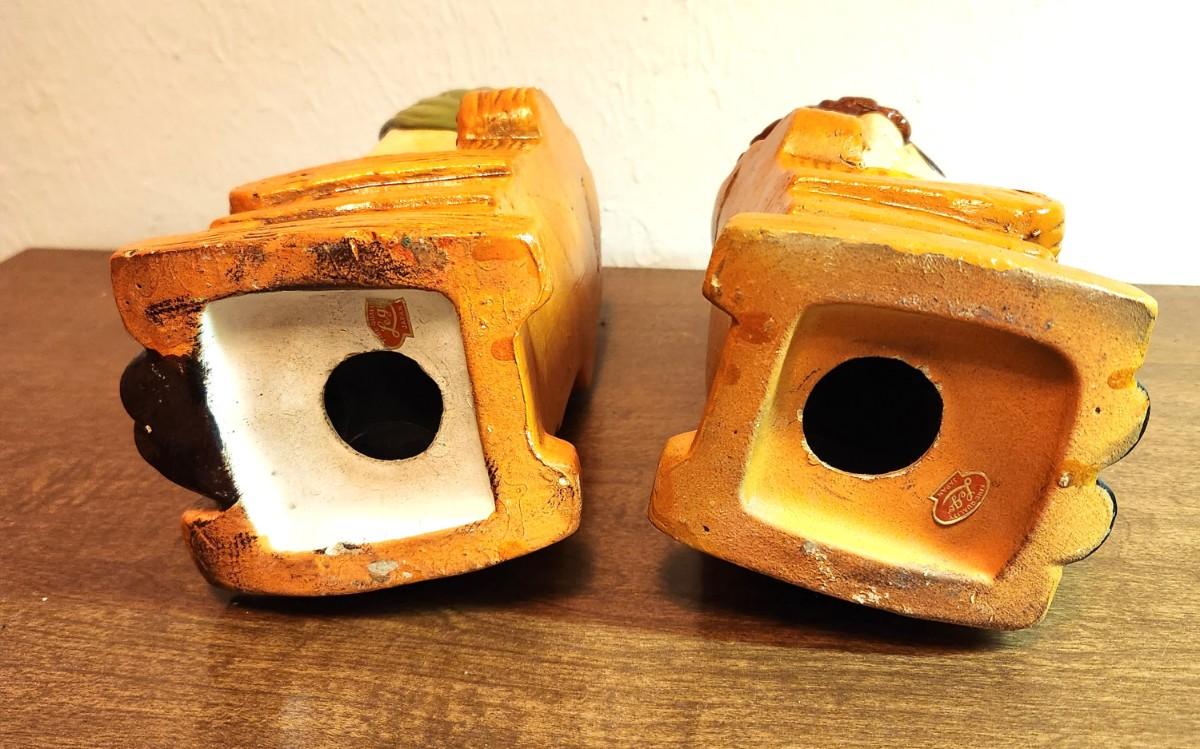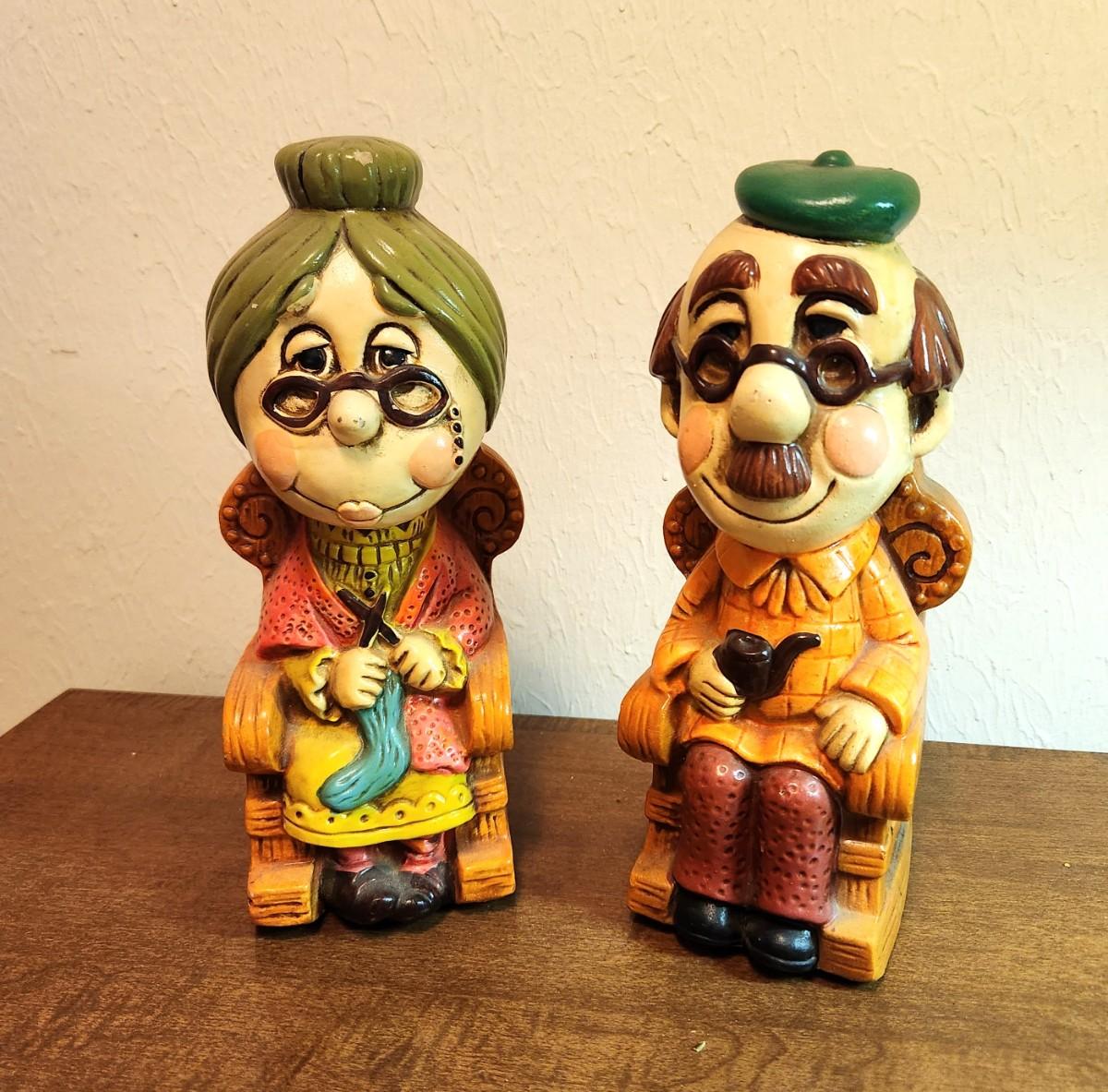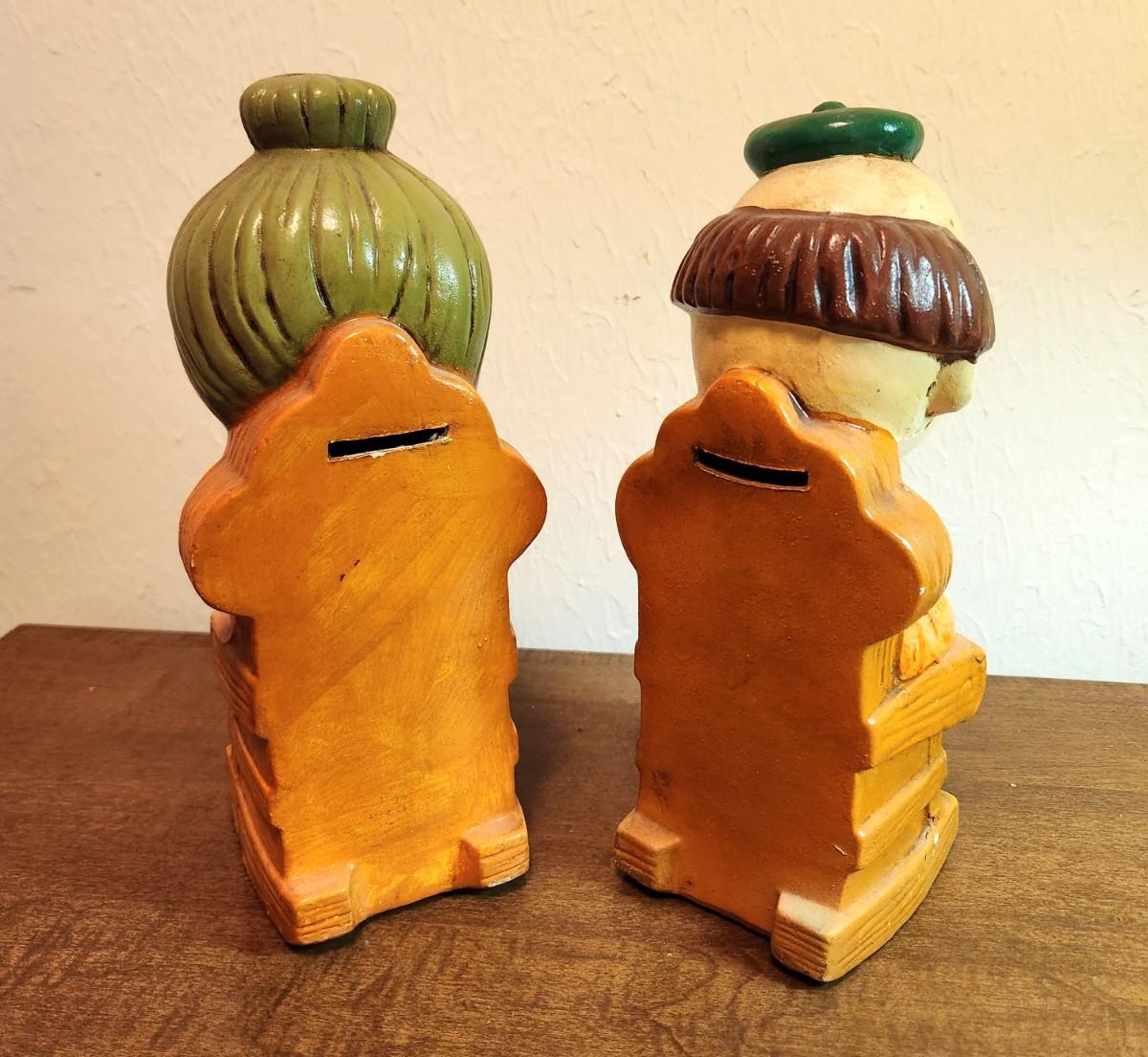 Scare pair from the 1970s - Grandma/Grandpa ceramic banks. Both have labels - no stoppers, 10.5" tall. Good vintage condition. These sell on line for more than you might think.