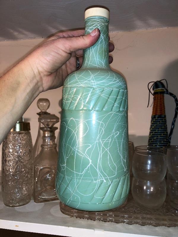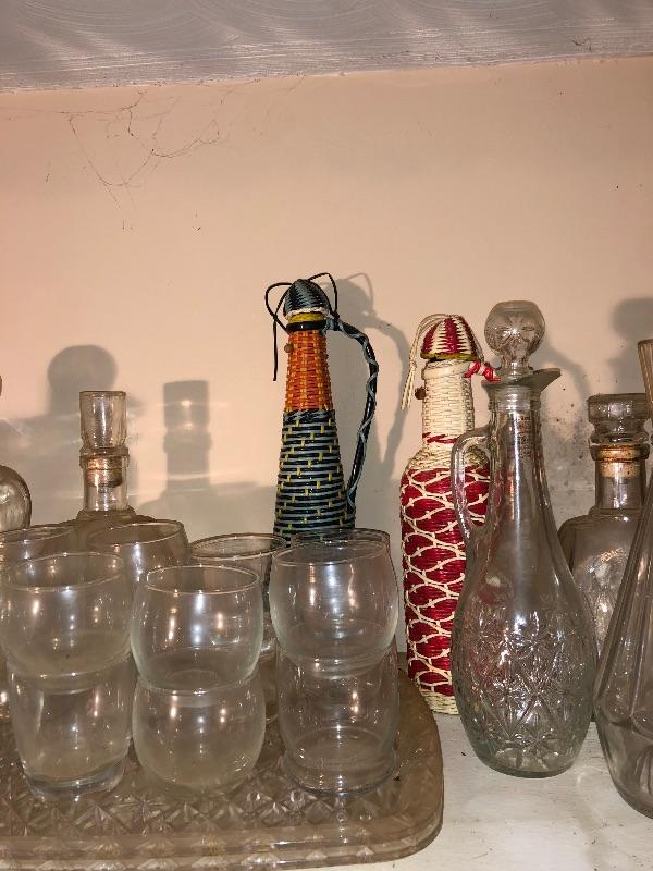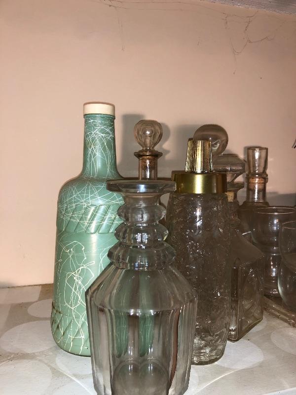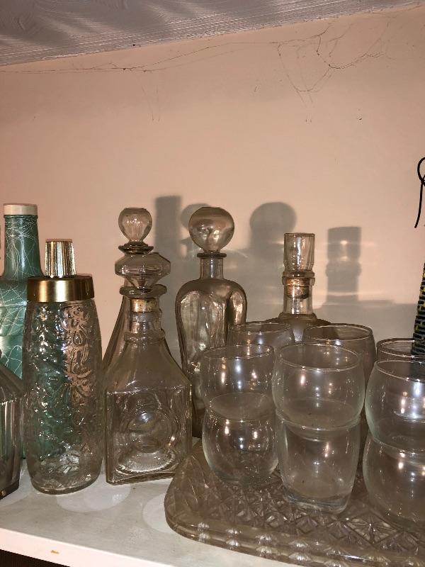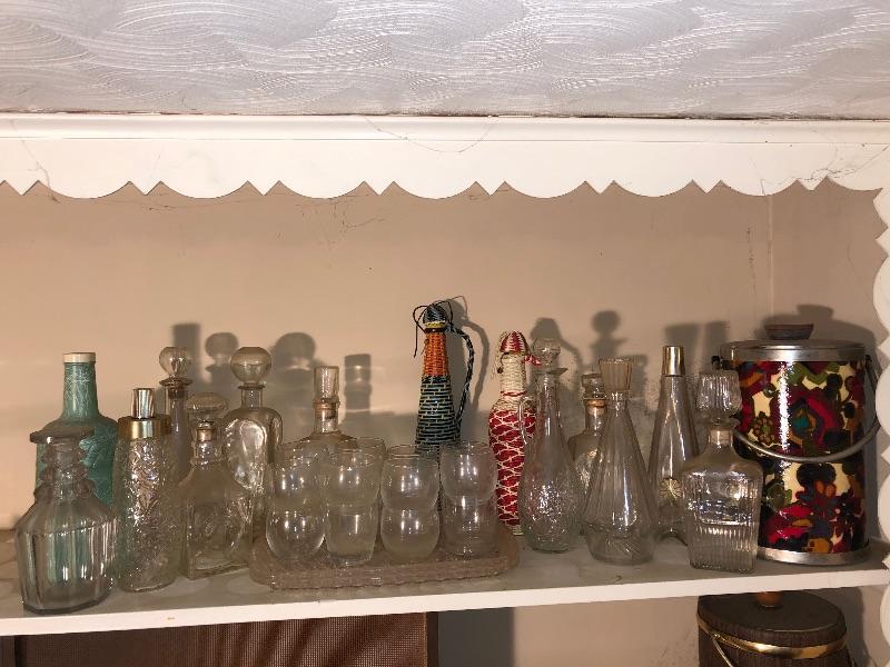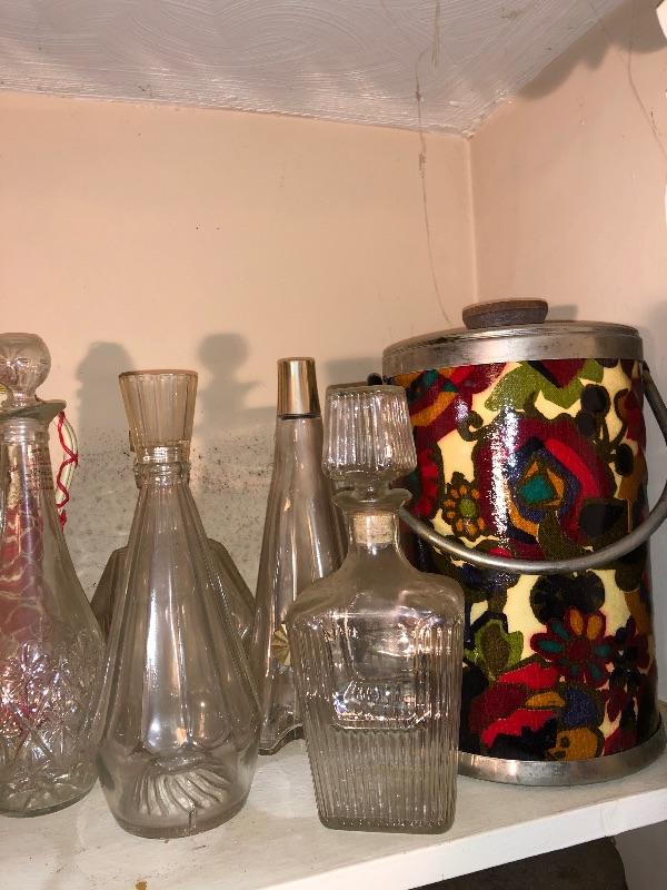 Lot 71 - Large Lot of  Painted Decanters, Plastic Trays, Glass Decanters, Large Ice Bucket and Hight Ball Cups