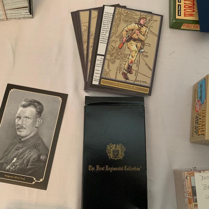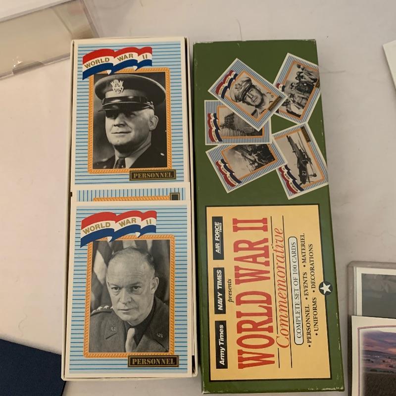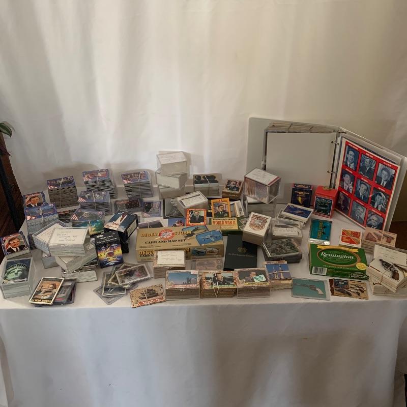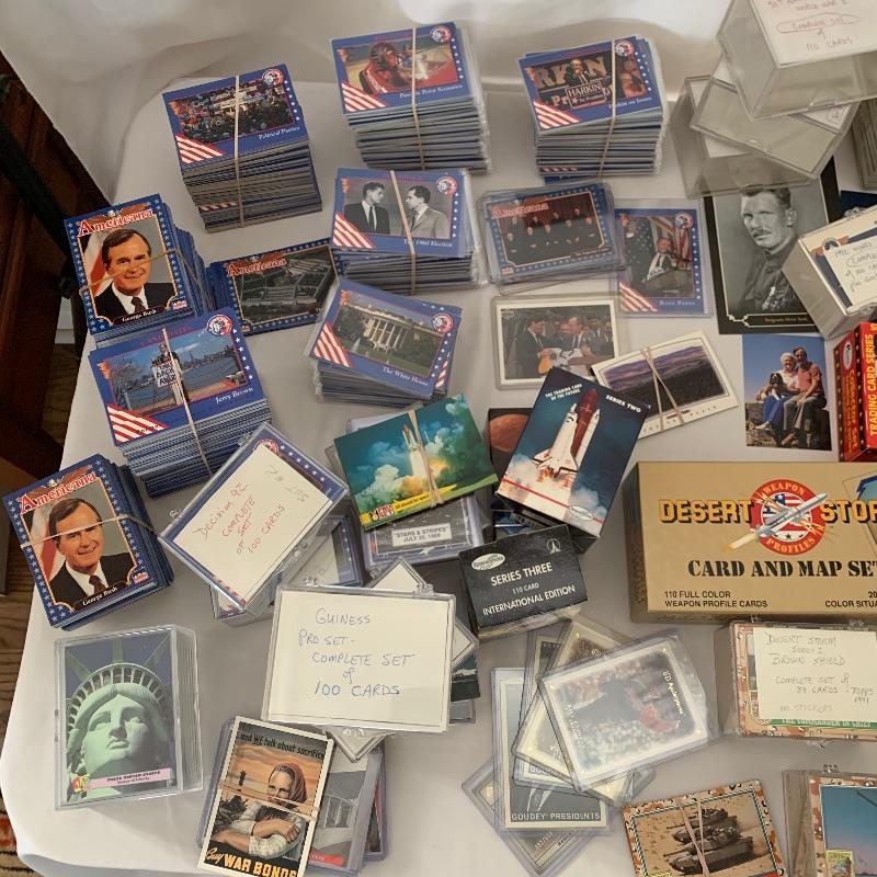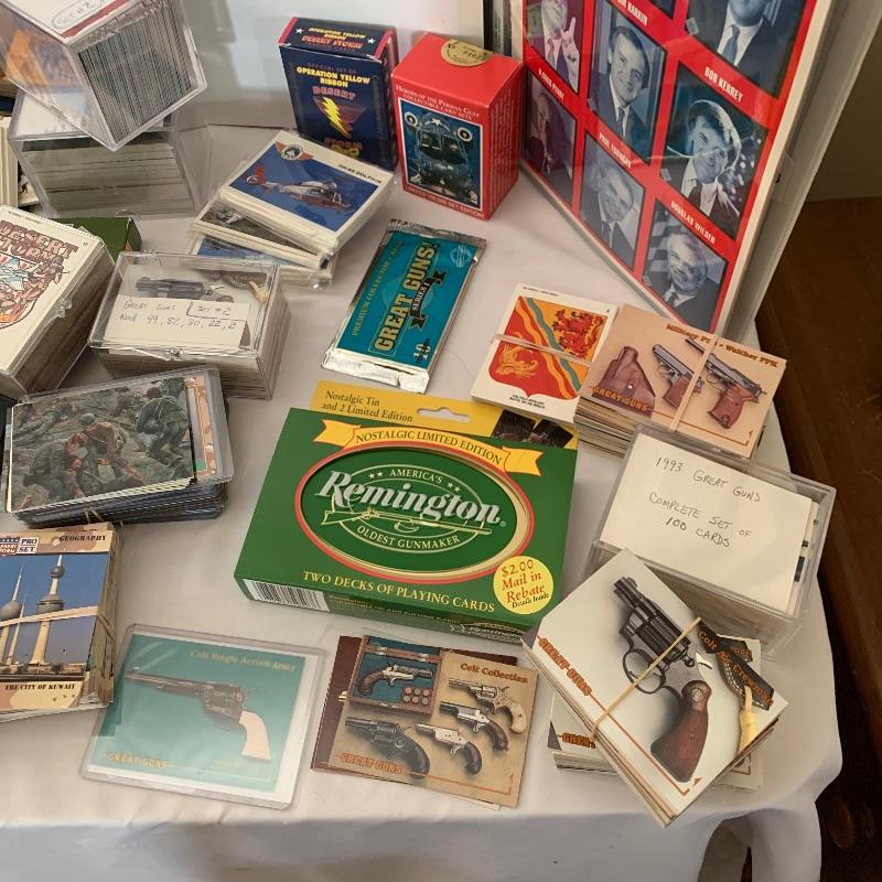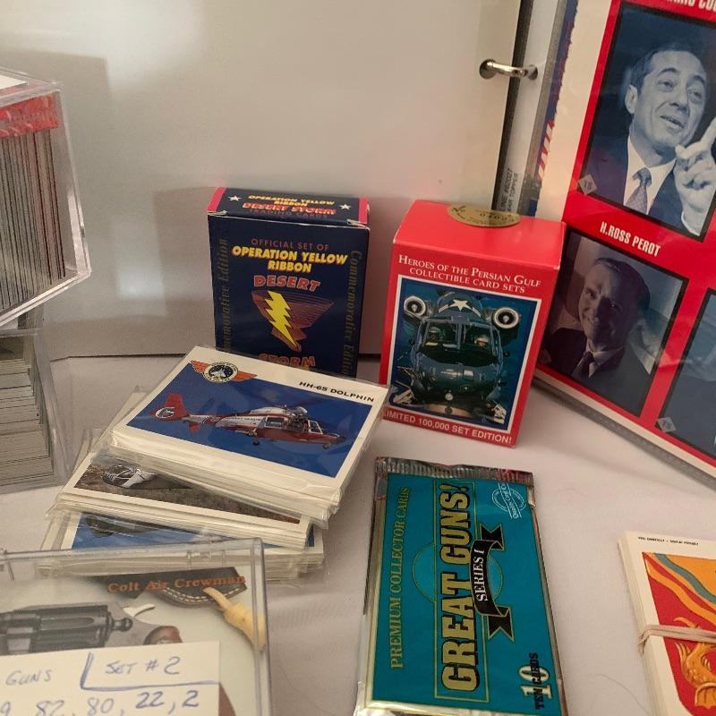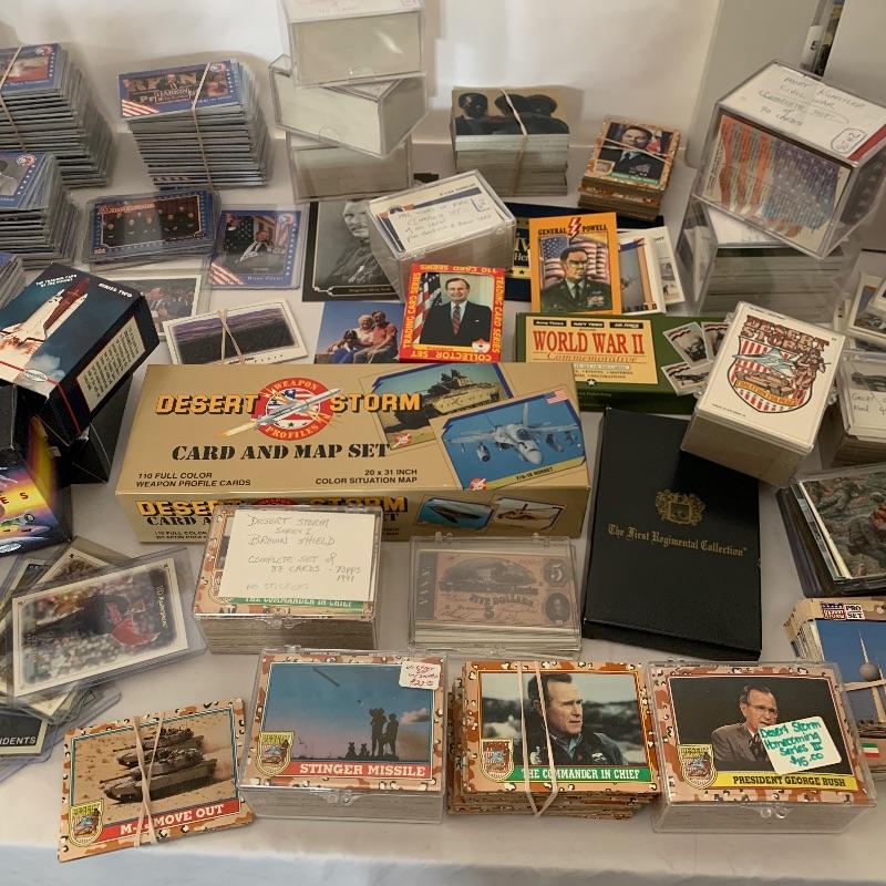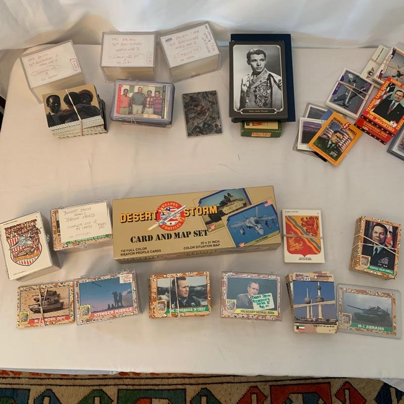Lot includes multiple Desert Storm collector card sets and extras including Desert Storm Series I Brown Shield, Desert Storm Home Coming Series III, Victory Set, Operation Desert Shield, official set of Operation Yellow Ribbon, Hero’s of the Persian Gulf 100,000 limited set and Desert Storm cards and map set. These are not verified sets. Lot also includes numerous Decision “˜92 card sets and extras. Sets are not verified. Also included are sets from Civil War and WWII Art collections by Mort Kunstler from the 1990’s. Mini bank note cards also included. This lot also has Great Guns Sets, Series II & III space Shots, Moon Mars and a Remington Collector tin with two sets of playing cards. Desert Storm poster is 16” x 20”