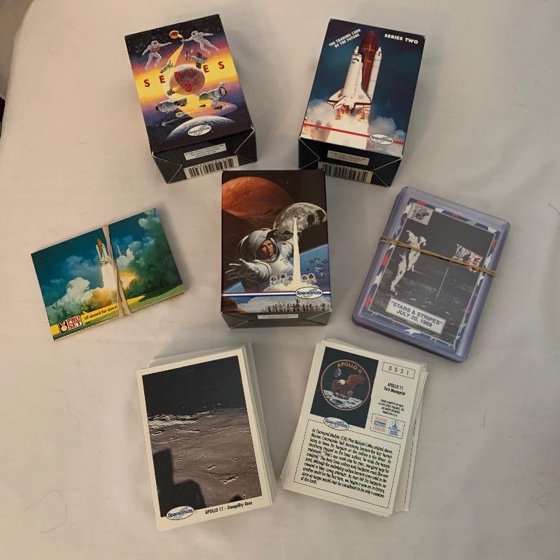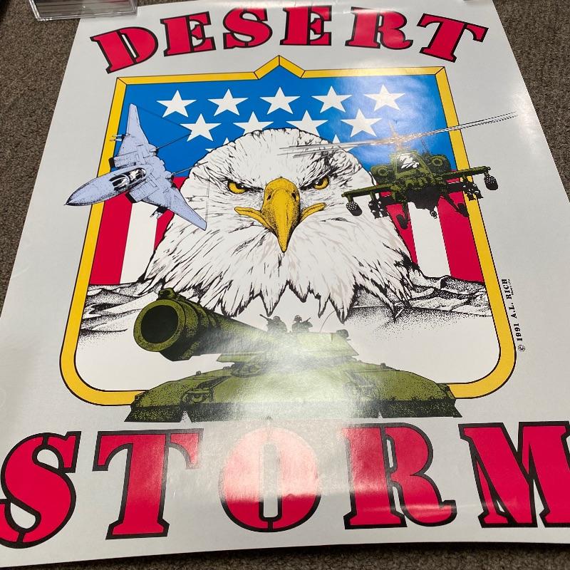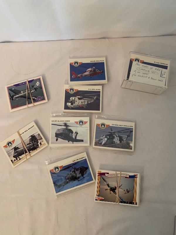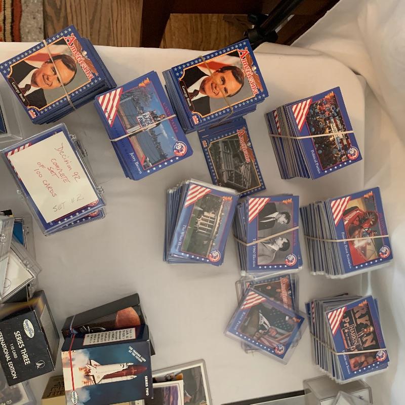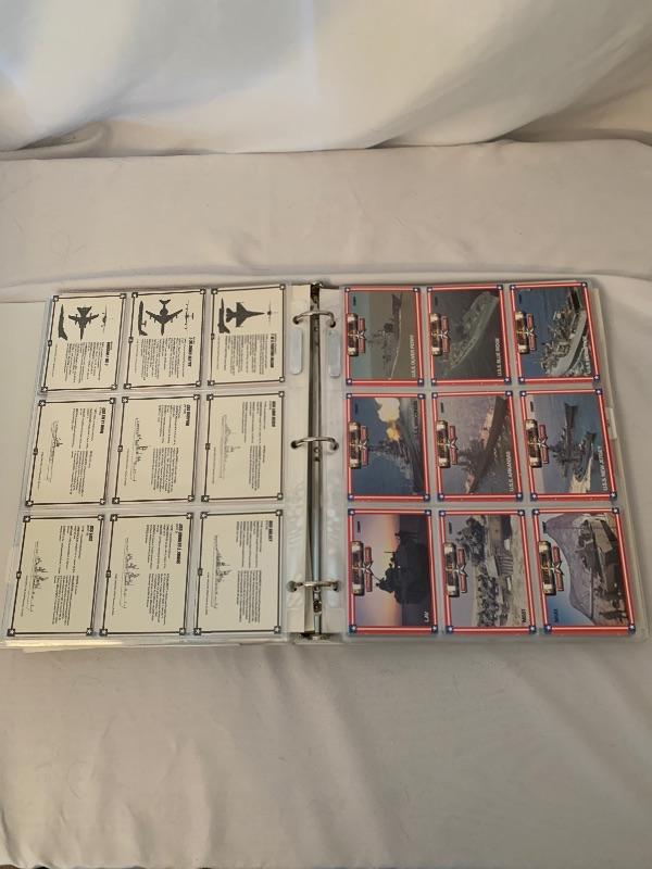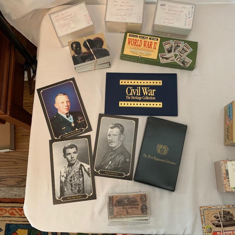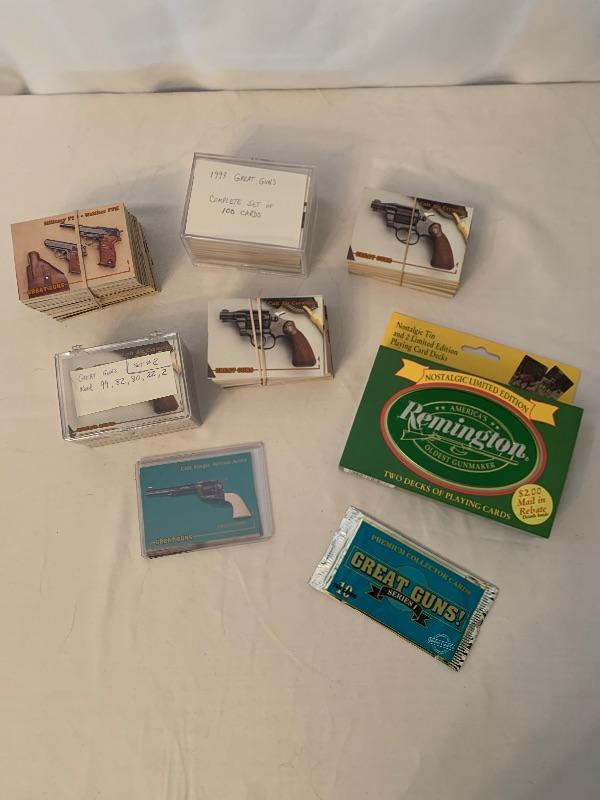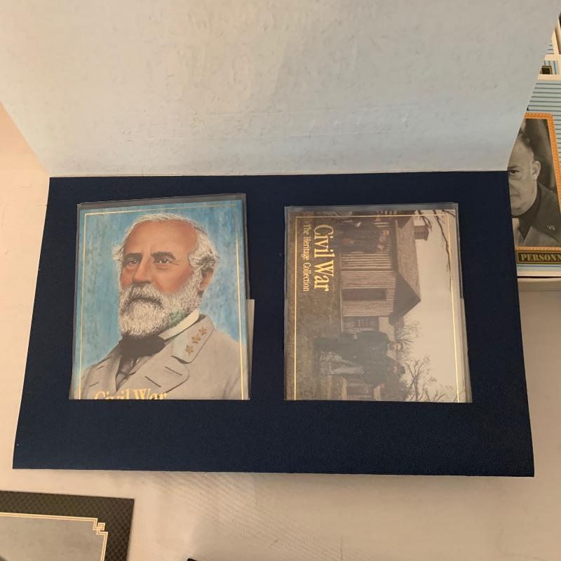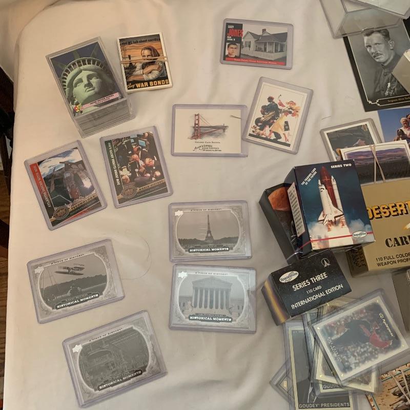 Lot includes multiple Desert Storm collector card sets and extras including Desert Storm Series I Brown Shield, Desert Storm Home Coming Series III, Victory Set, Operation Desert Shield, official set of Operation Yellow Ribbon, Hero’s of the Persian Gulf 100,000 limited set and Desert Storm cards and map set. These are not verified sets. Lot also includes numerous Decision “˜92 card sets and extras. Sets are not verified. Also included are sets from Civil War and WWII Art collections by Mort Kunstler from the 1990’s. Mini bank note cards also included. This lot also has Great Guns Sets, Series II & III space Shots, Moon Mars and a Remington Collector tin with two sets of playing cards. Desert Storm poster is 16” x 20”