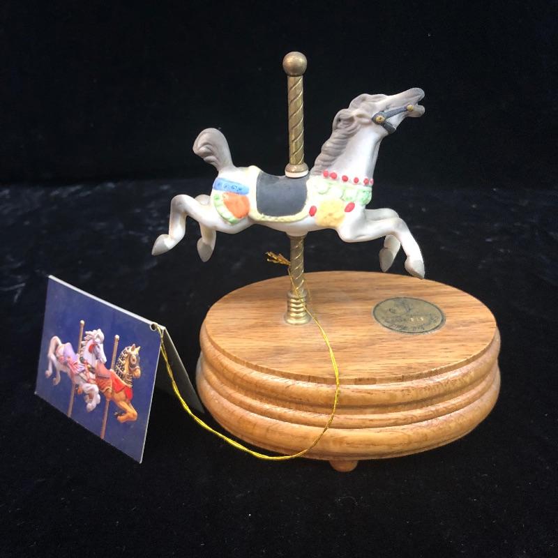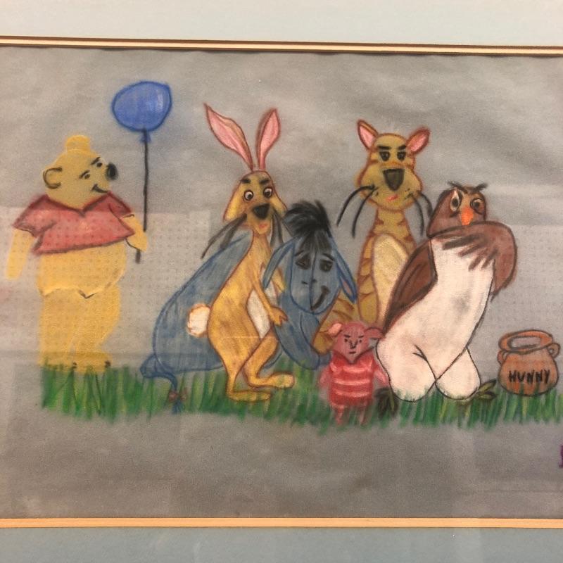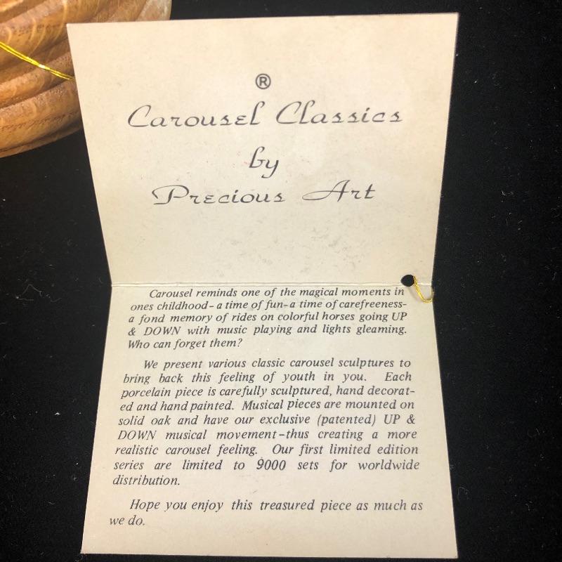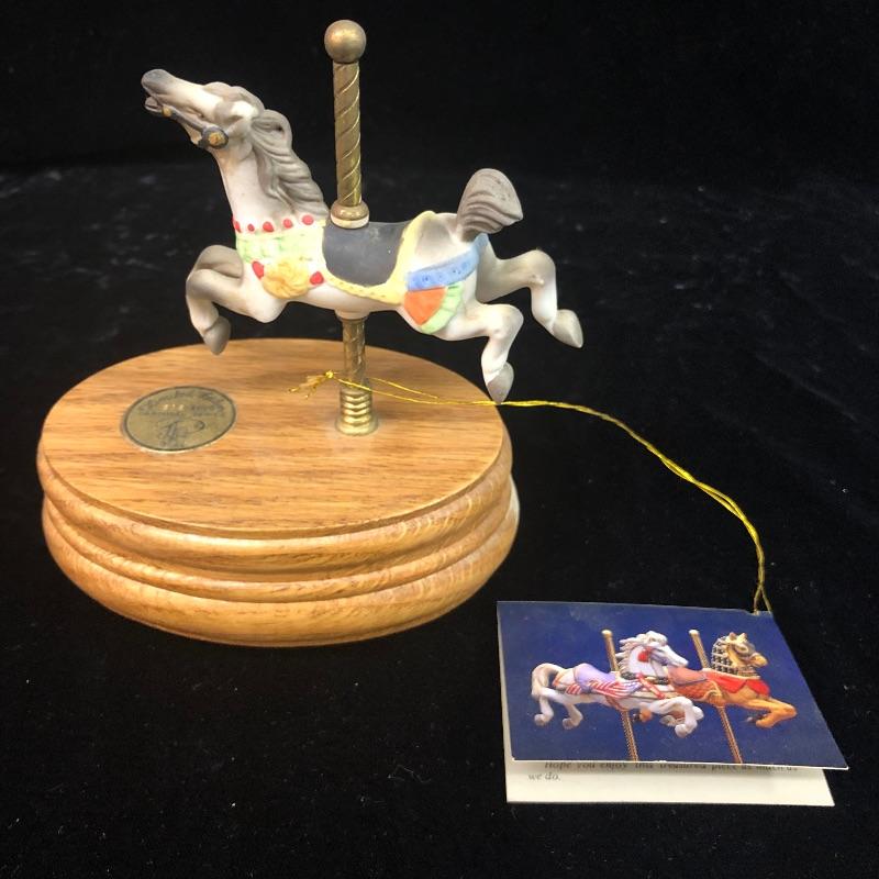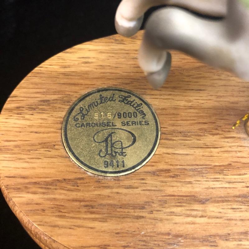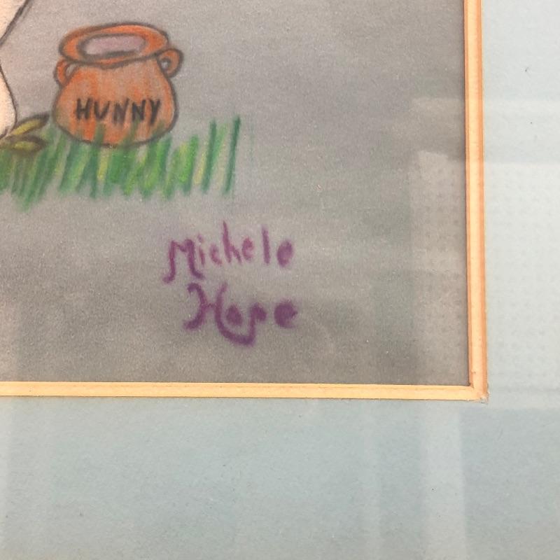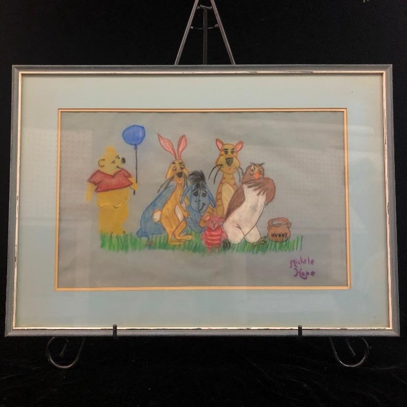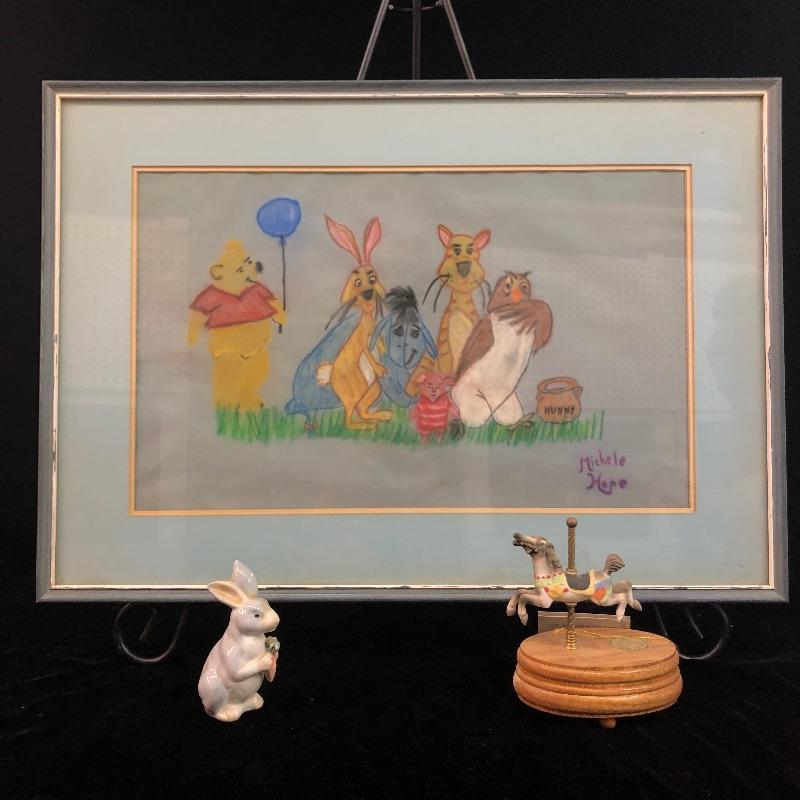This lovely pastel depicts Winnie the Pooh and friends, making this a great piece of art for any fan or children's room. The piece is signed and was done by the owner's daughter, Michele Hope. Included in this lot is also a limited edition "Carousel Classic" piece. This carousel has a functioning music box in the wooden platform. The horse does not currently spin as probably initially intended, but it might be a simply fix when opened up. Finally, this lot includes an adorable ceramic rabbit statue.