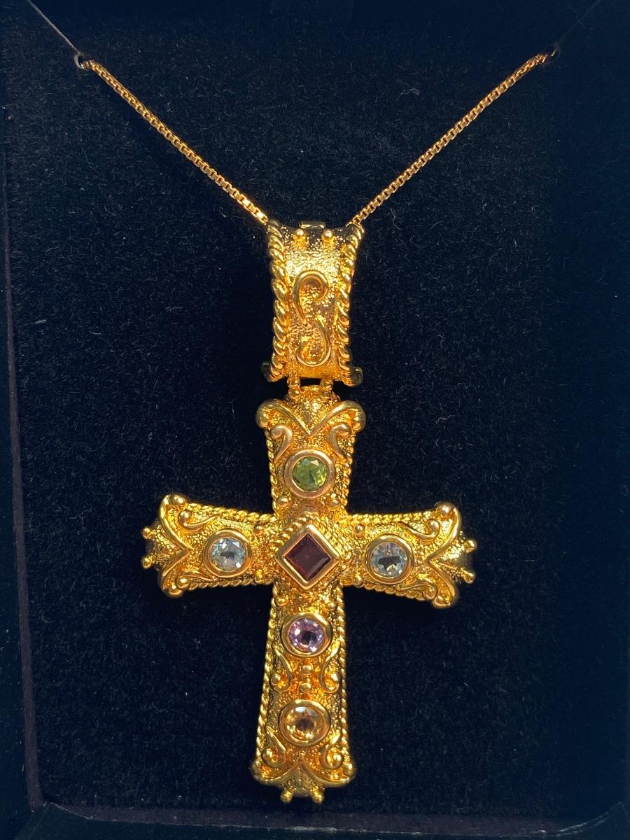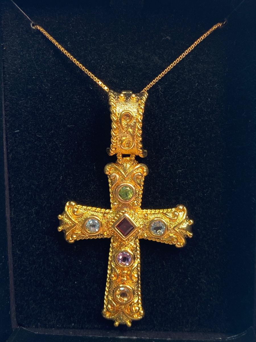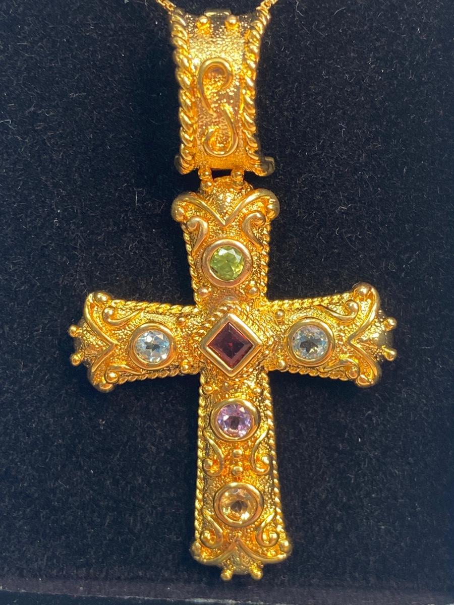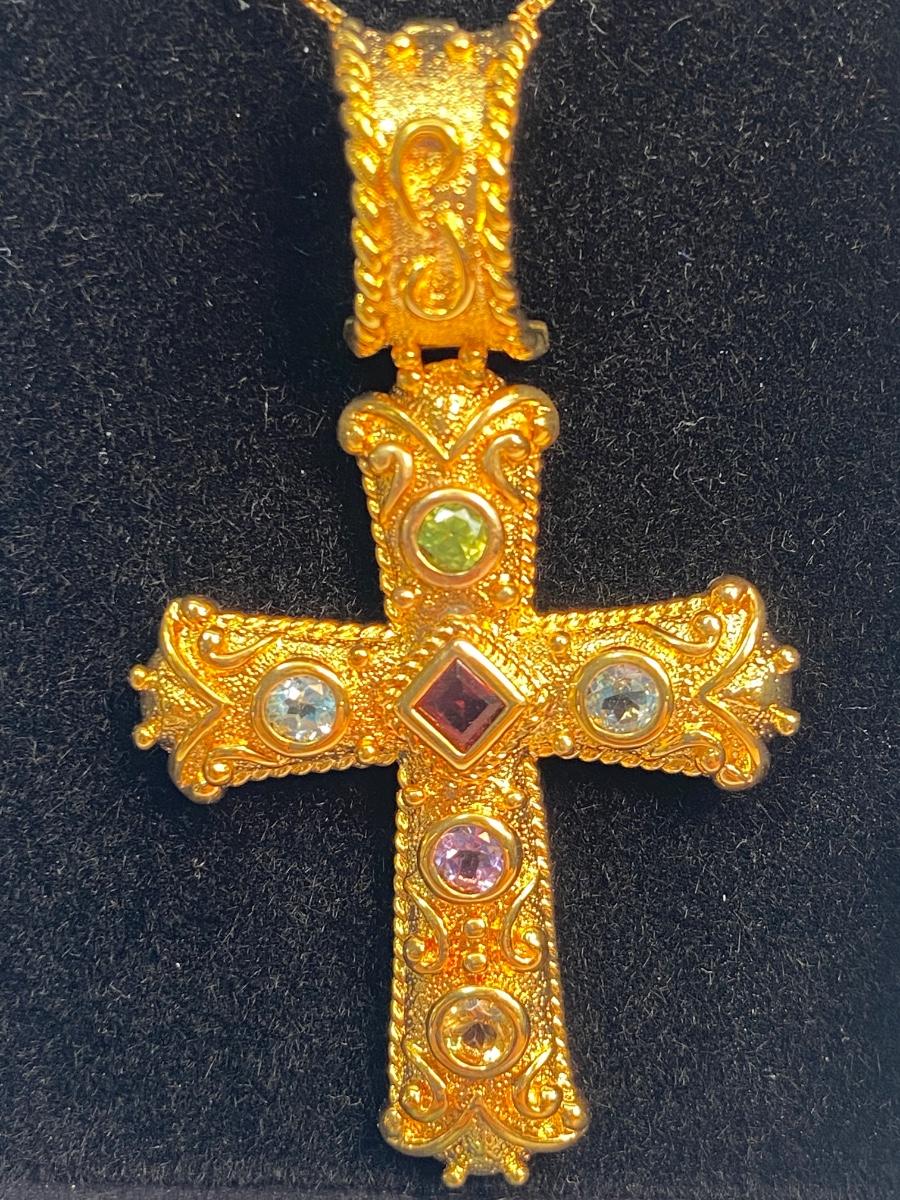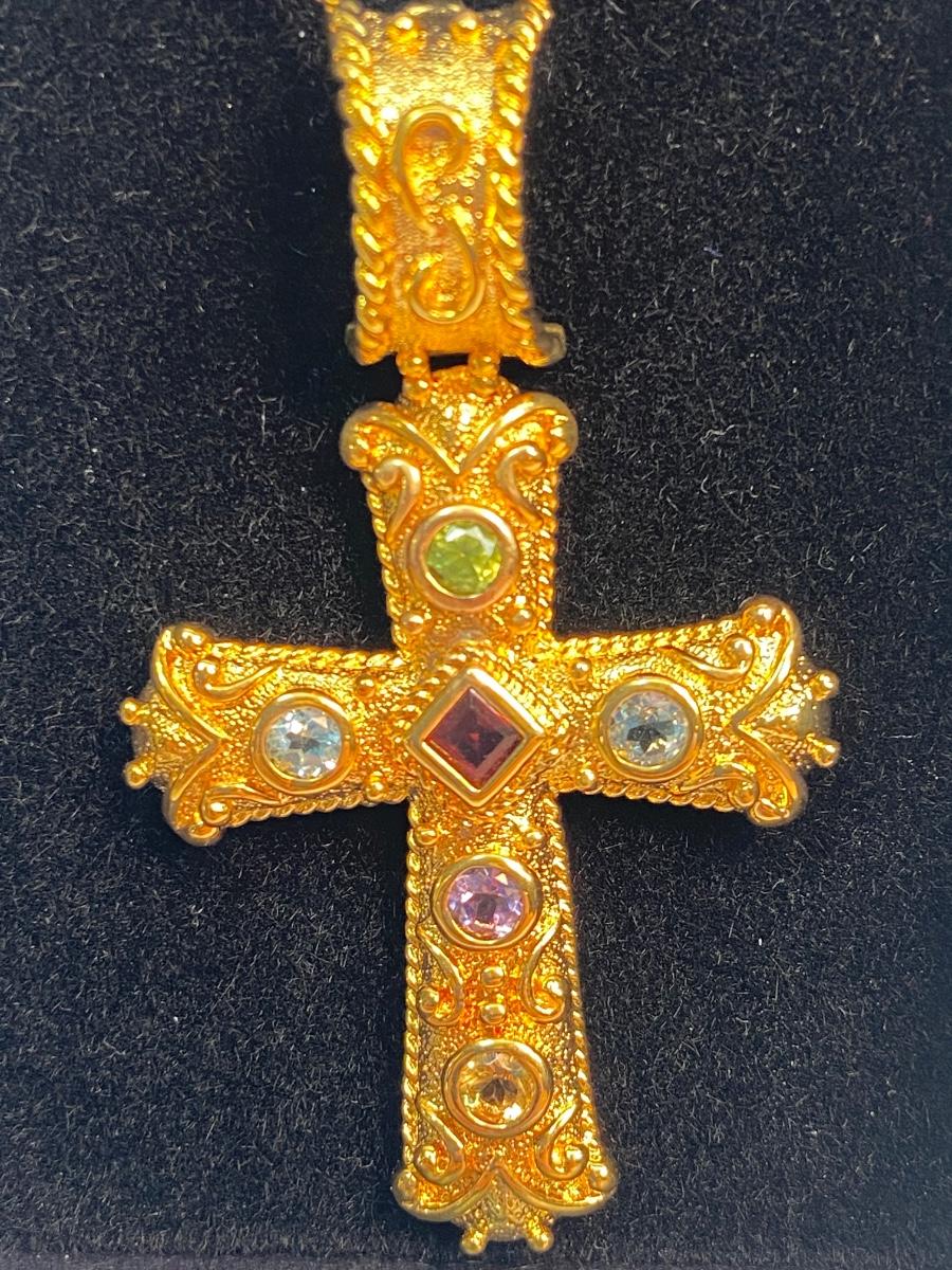 Beautiful 18" Technibond multicolored gemstones cross pendent.