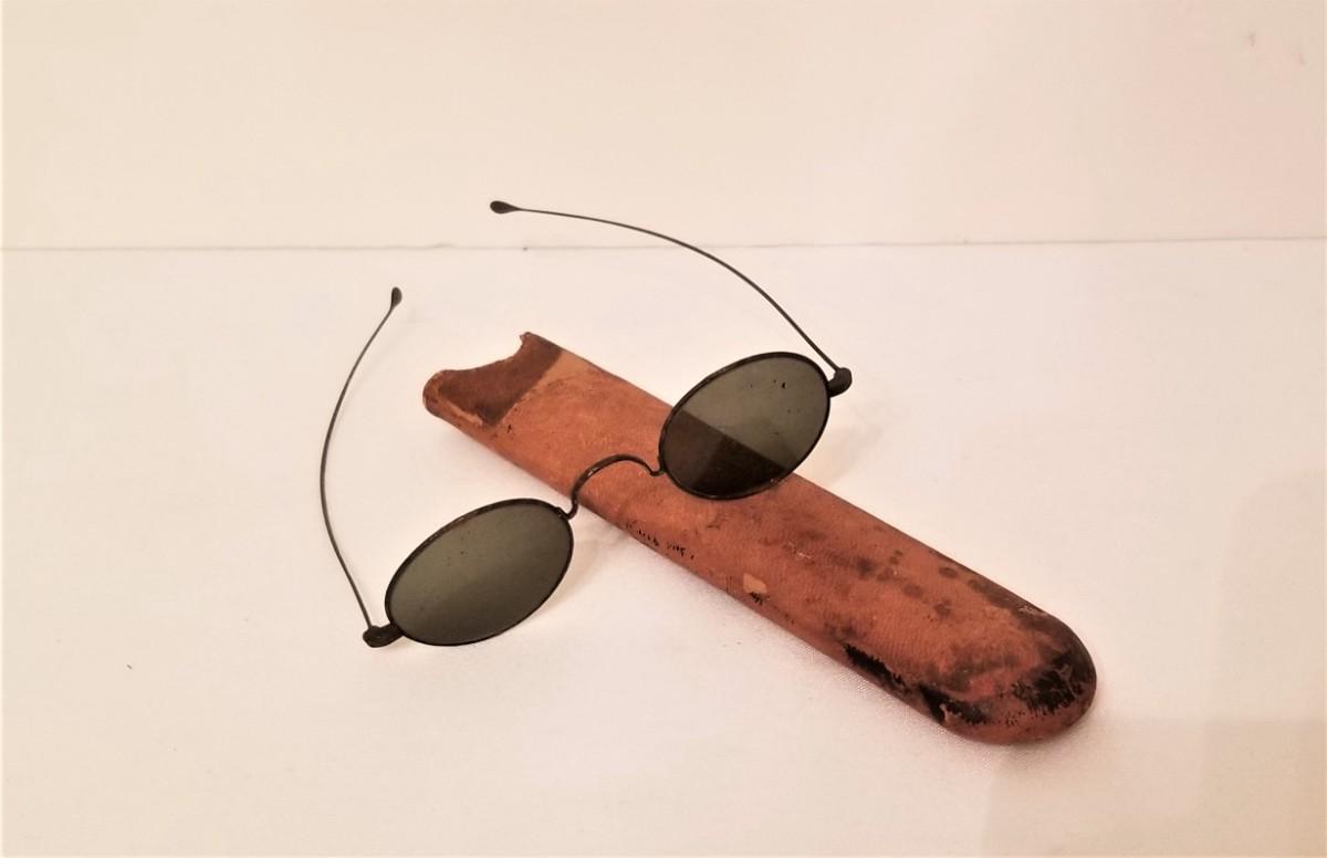 Vintage pair of dark glasses in an old hard sheath - glasses 5.5" long at the side, sheath 7" long. Antique condition.