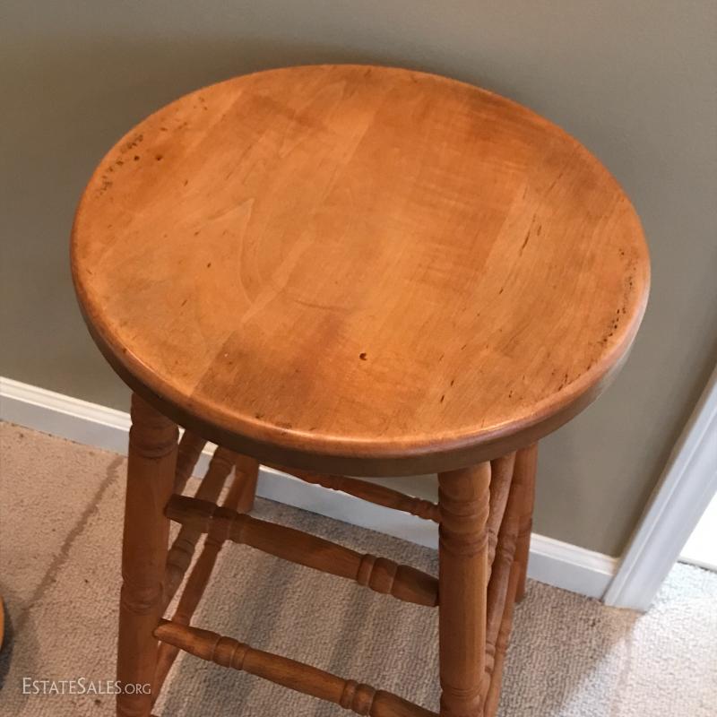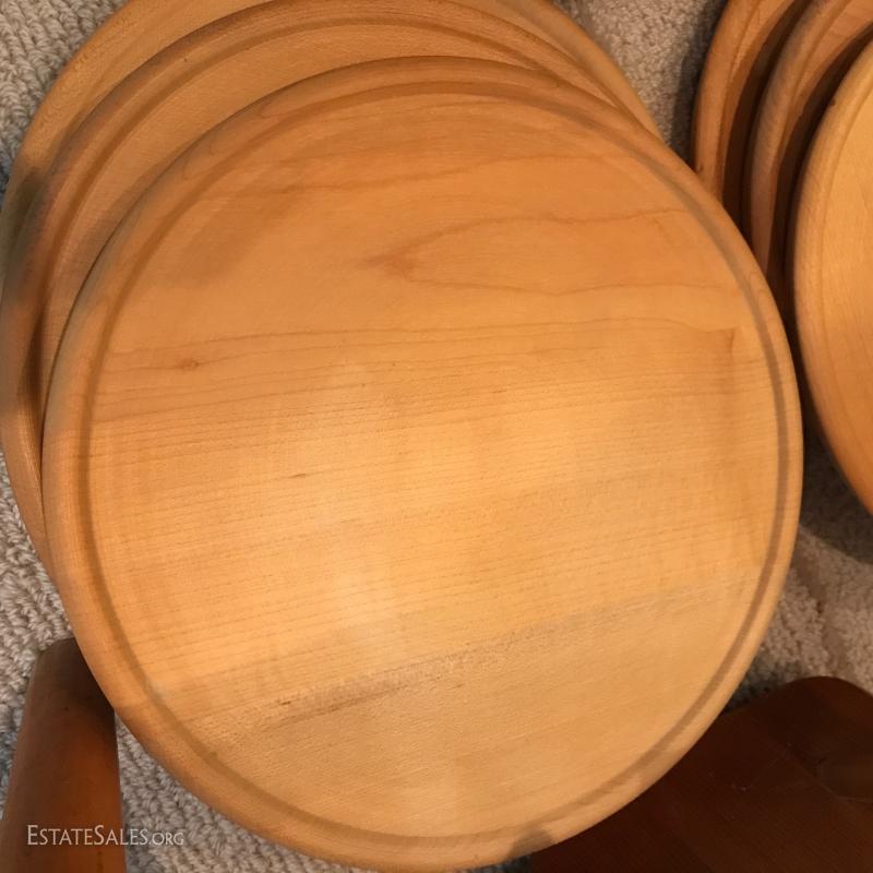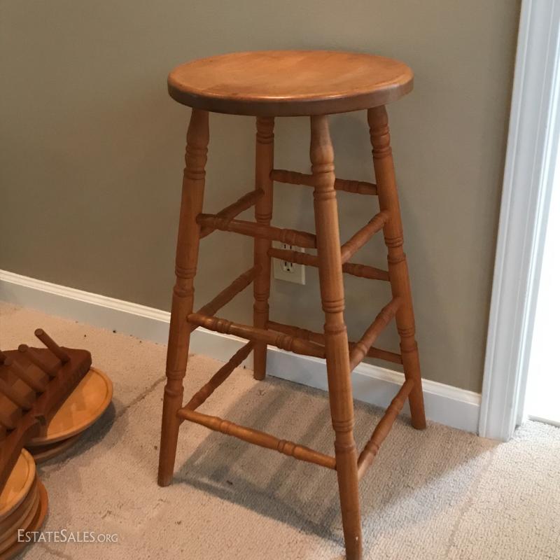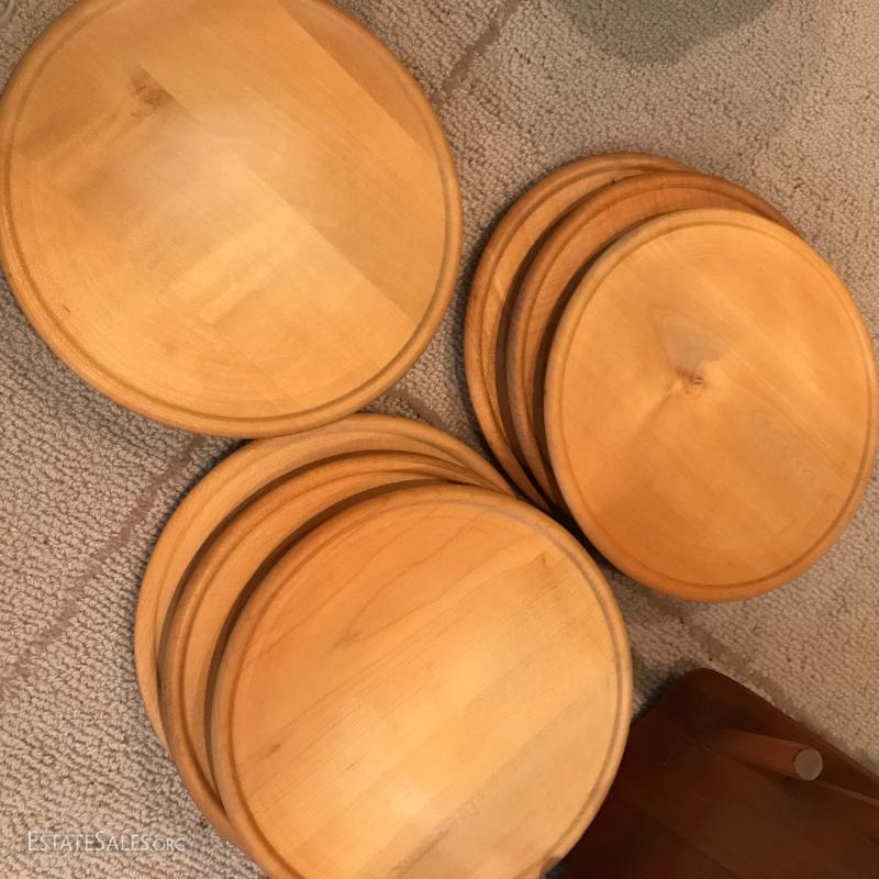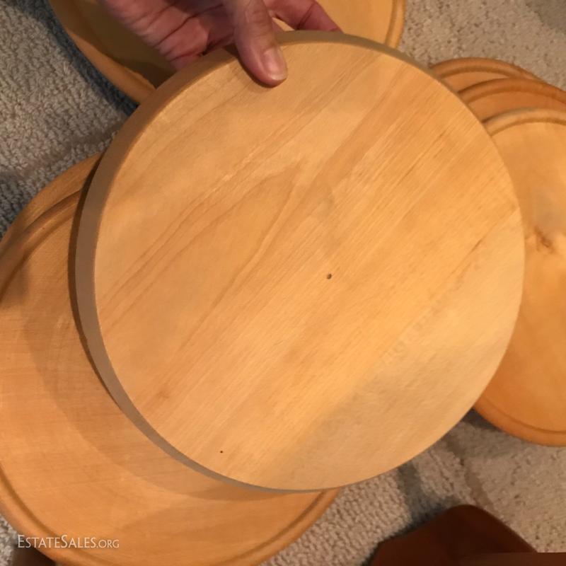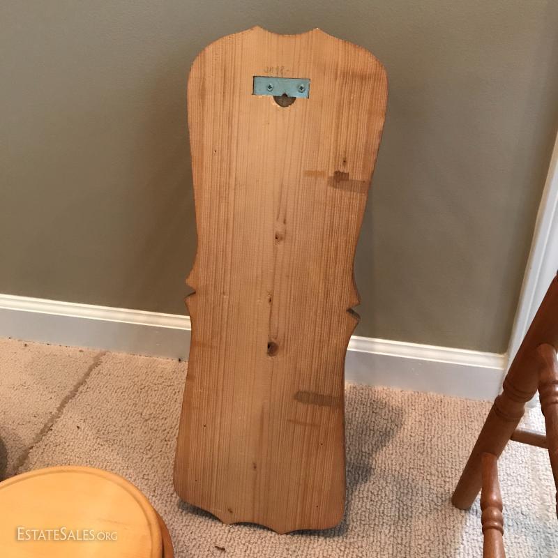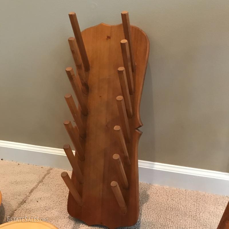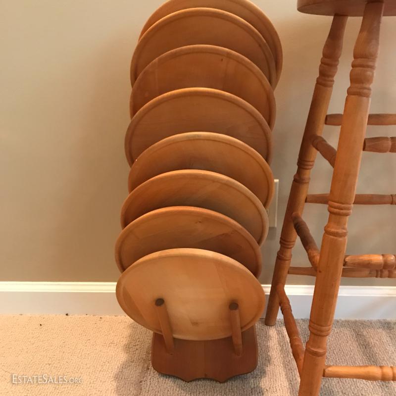 Bavarian plate rack, 23"l x 8"w x 7"deep. Eight wooden plates, 10.5"diameter. Also includes wood stool, 14" d x 28"h. Normal wear and tear.