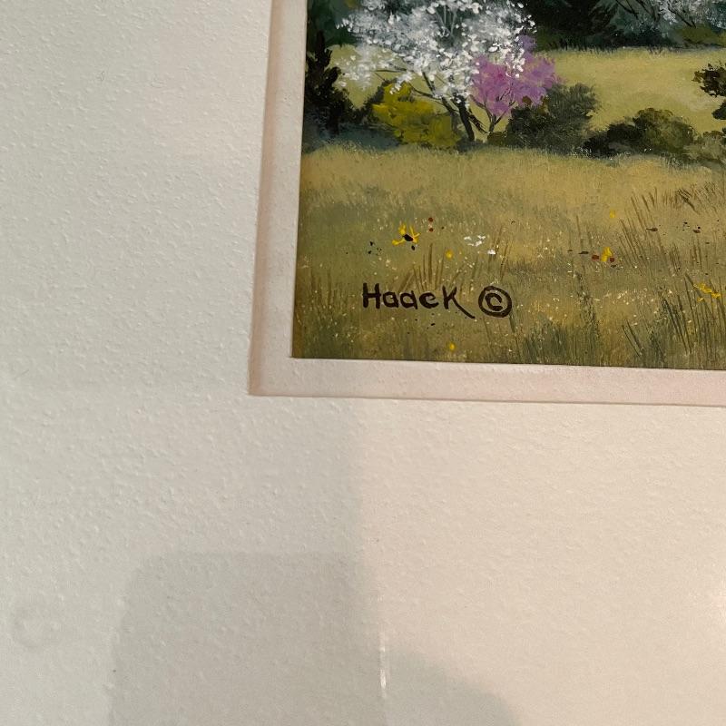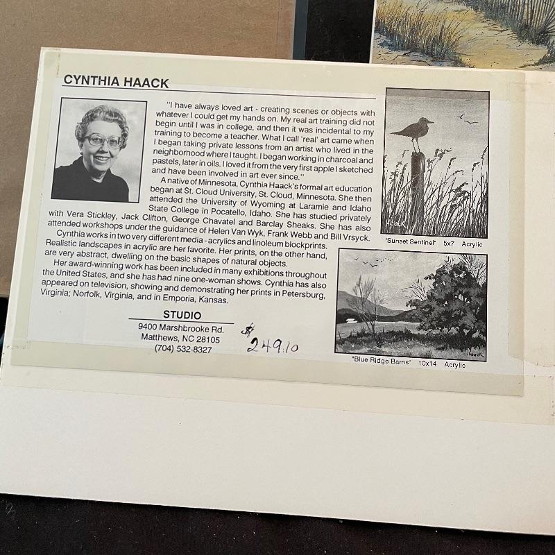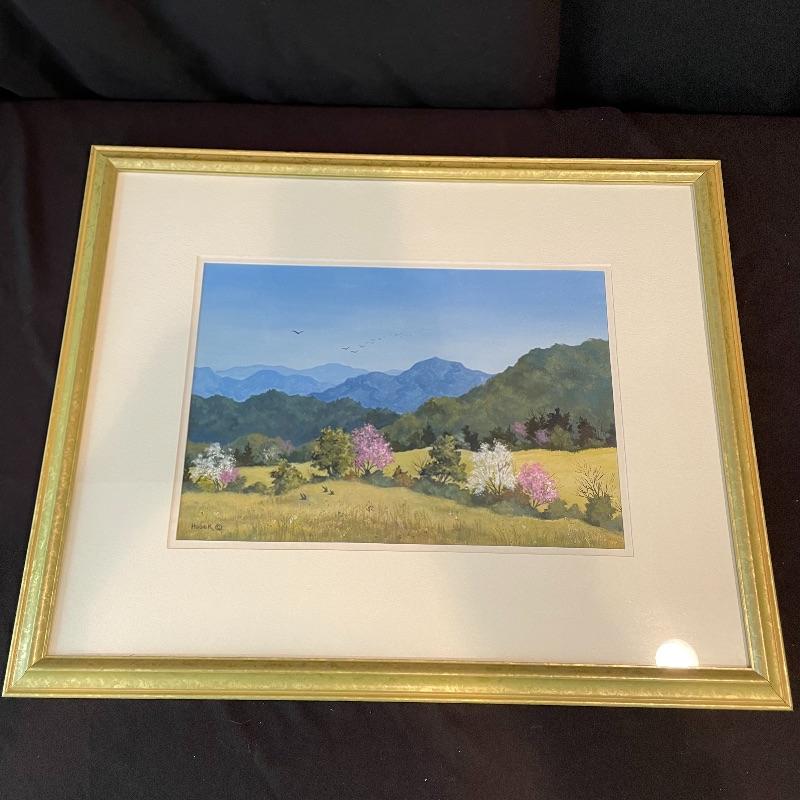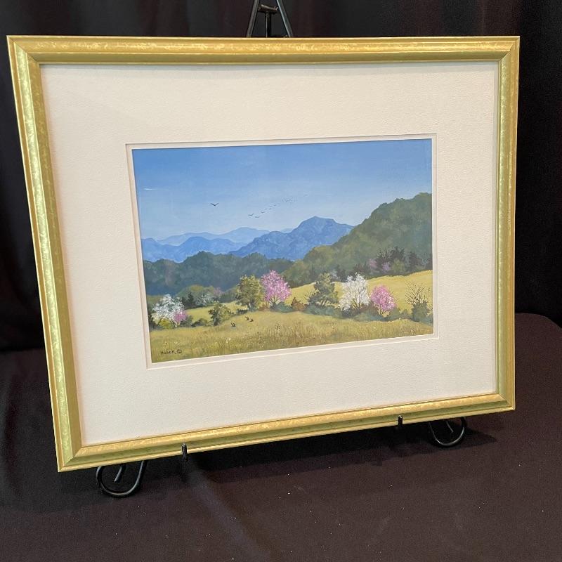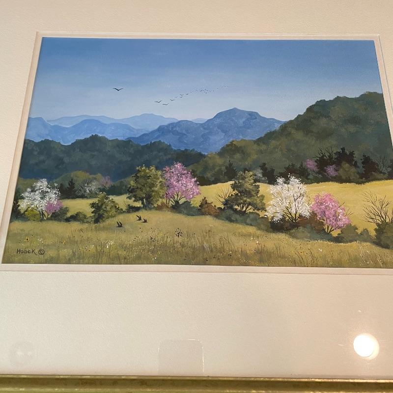 Stunning depiction of the mountains we call home. This art appears to be titled “Blue Ridge Spring” by artist and printmaker Cynthia Haack. Art sits in a nice mat behind glass in a painted 24” x 19.5” wood frame. Shipping available. Please call UPS with dimensions at 828-252-6930 for a shipping quote prior to bidding.