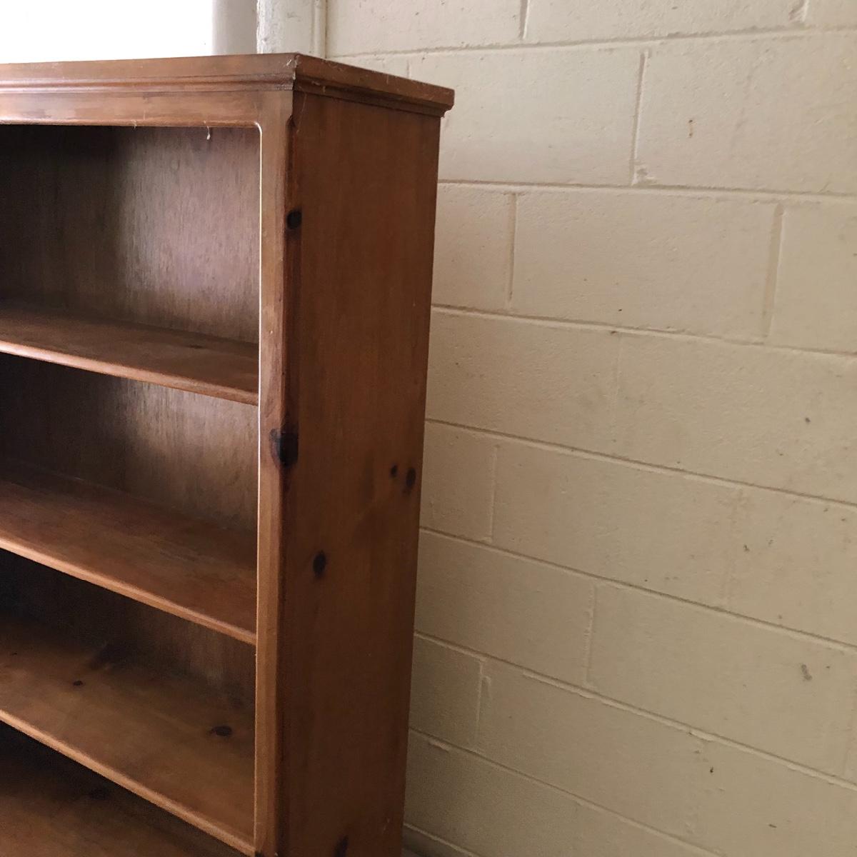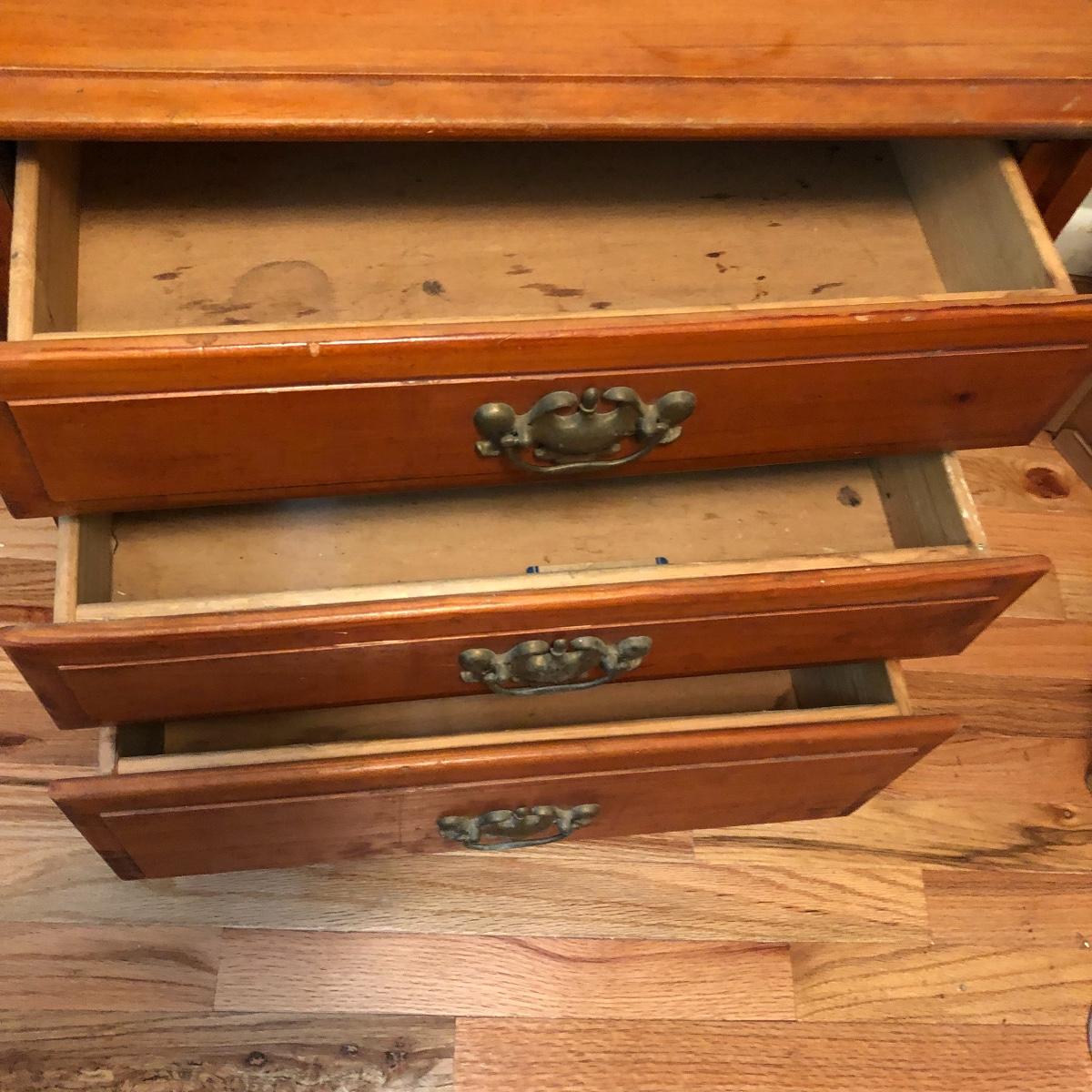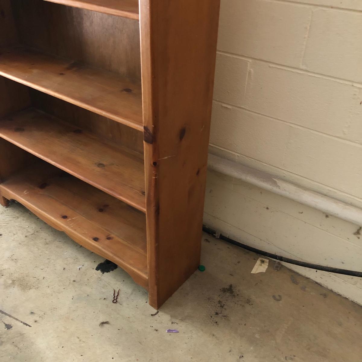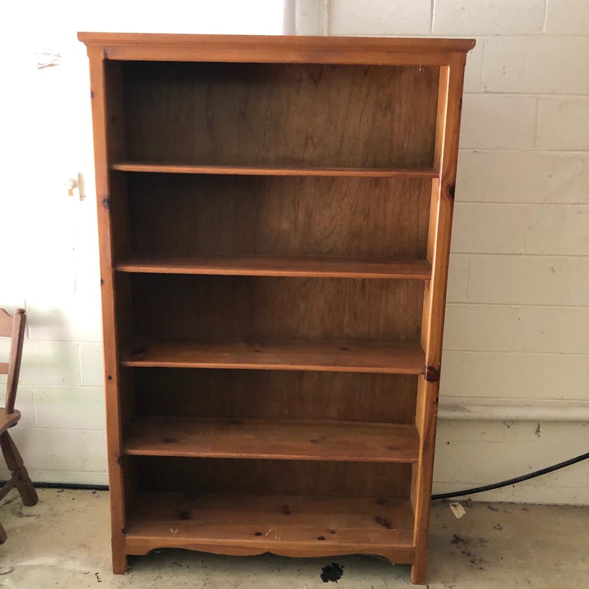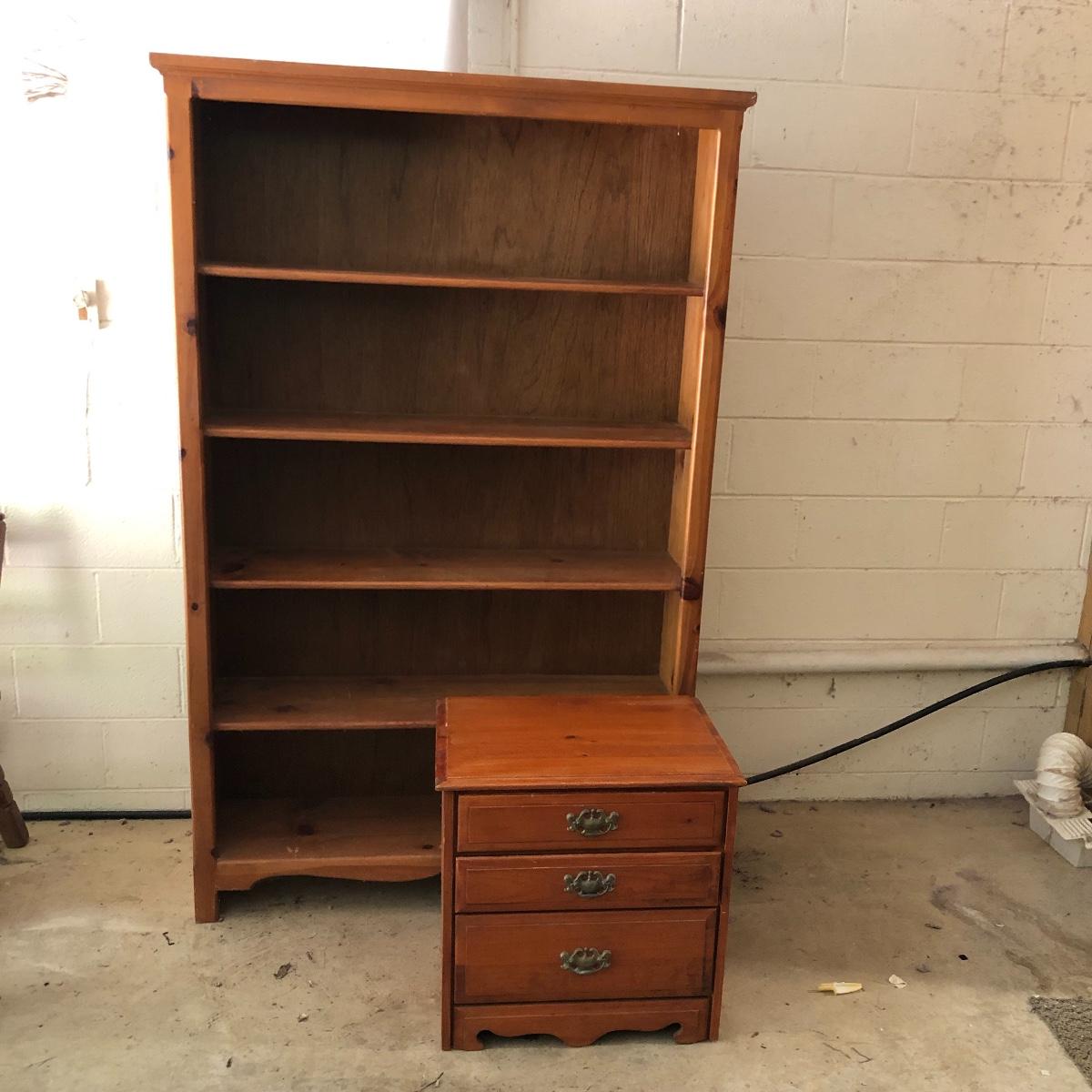 A nice pair of wooden pieces. Lot includes five shelf wooden bookcase and a three drawer wooden side table. Both pieces have some scratches and wear, see pictures. Bookcase measures 12.75” x 44” x 72” with shelves fixed in place and table measures 17” x 23” x 23.5”.