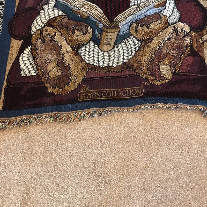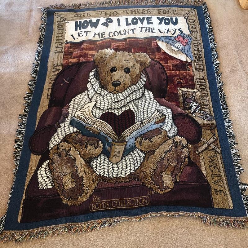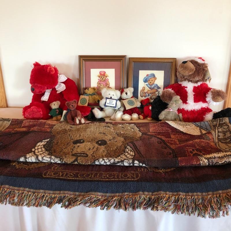 What a great gift these Boyd’s Bears will make, or treat yourself. Lot includes Boyd’s Bears throw, two larger bears, six smaller bears and one bunny, Also includes two framed and matted needlepoint bear art and three posters. Throw measures 52” x 69” and largest frame measures 10” x 12”.