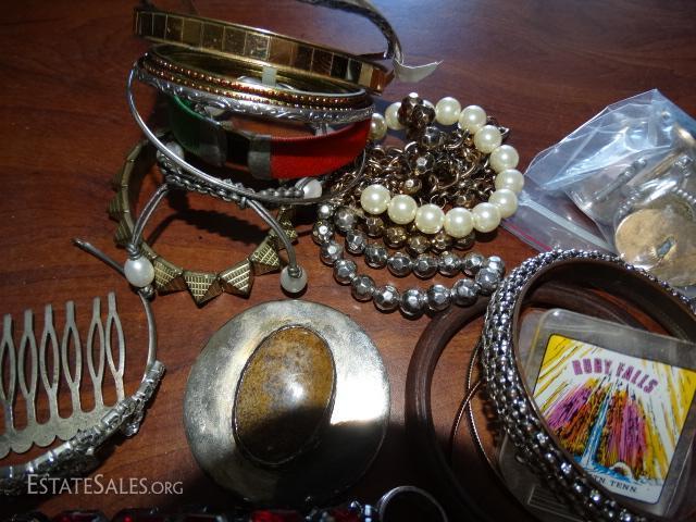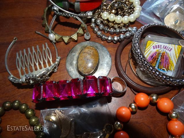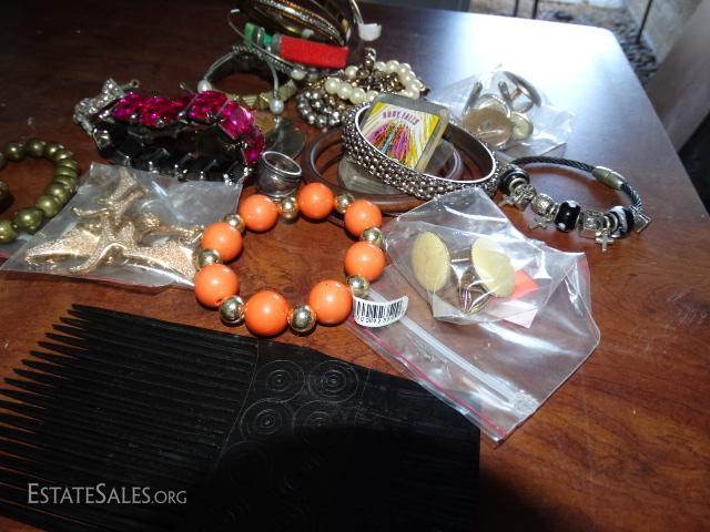Misc. jewelry, bracelets, ebony hair pick, rhinestone crown clip, natural gem stone pendant.