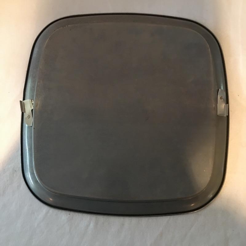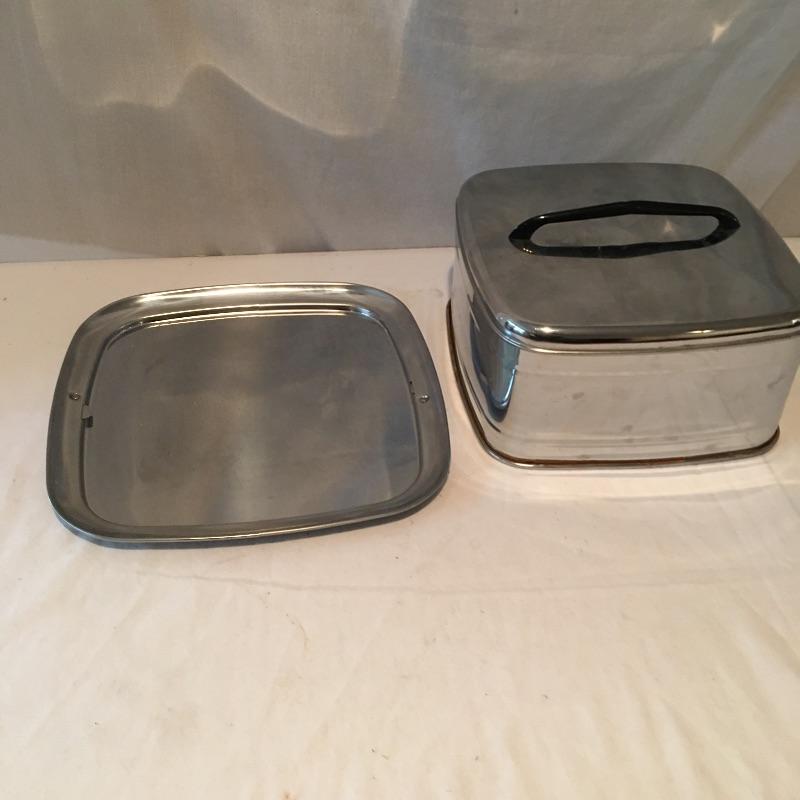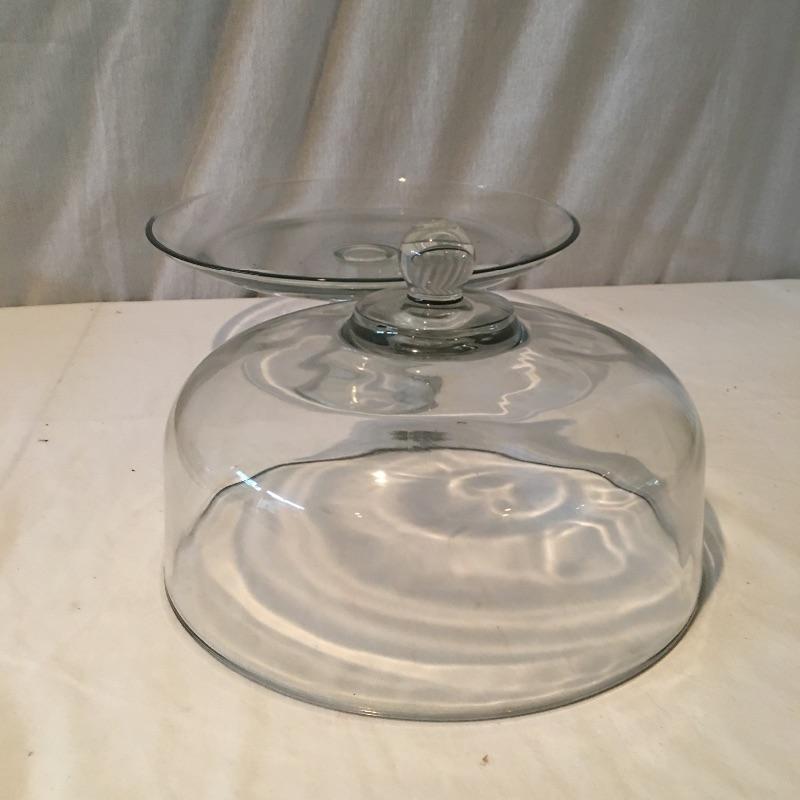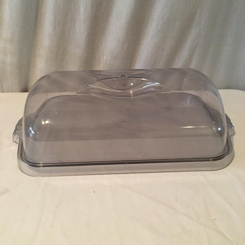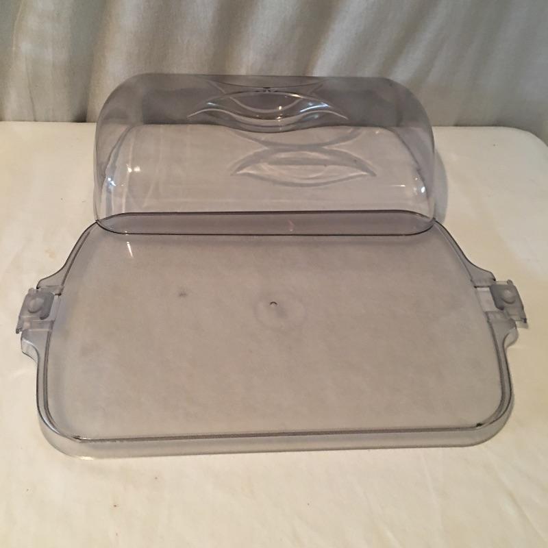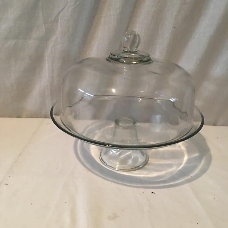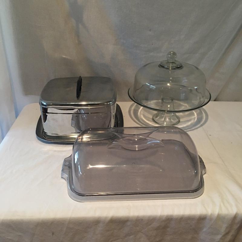 Trio of cake holder. Rectangular one is plastic, square one is metal and round one is glass. A nice way to keep things off your cakes and display them. Glass cake holder measures 12.75”D x 12.25” tall.