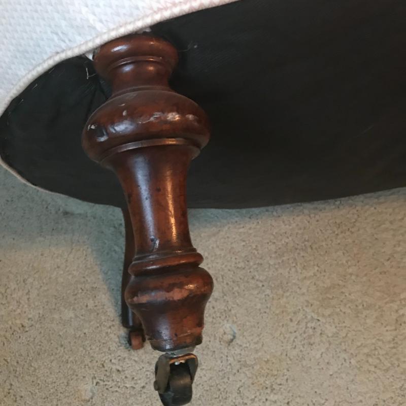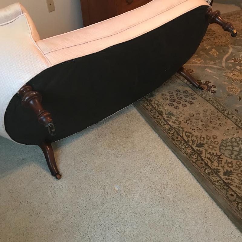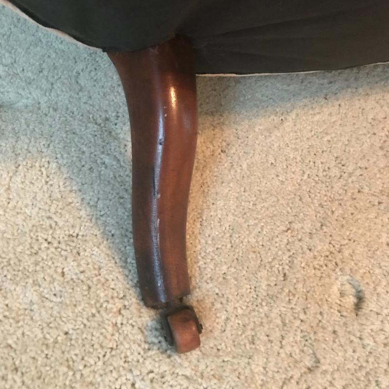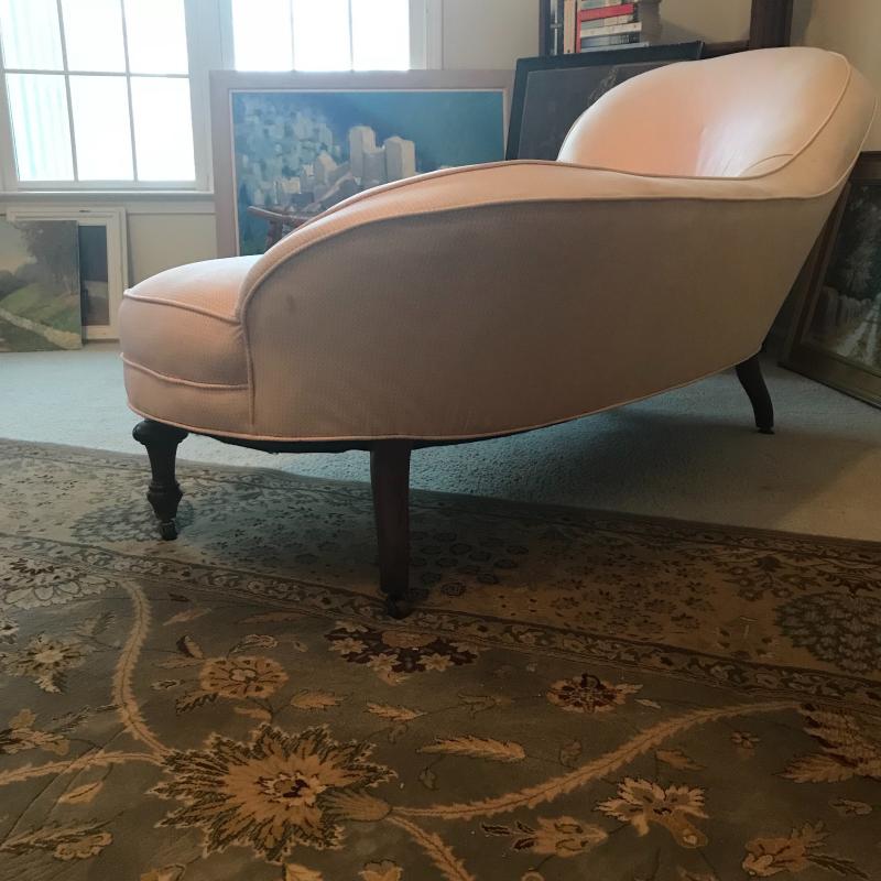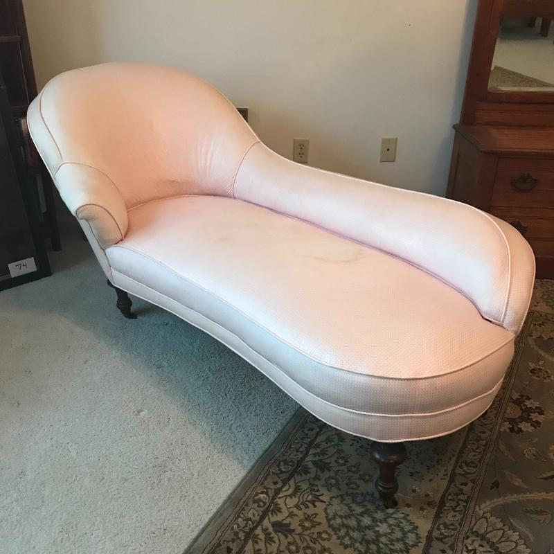 Beautiful chaise lounge with curvy lines and caster wheeled feet. Interesting detail of ornate legs in the front and curved simple ones in the back. Piece measures 69” x32” x33”. Appears to be new upholstery but has several stains. This lot is available for local pick up in Asheville, NC only.
