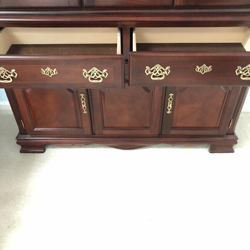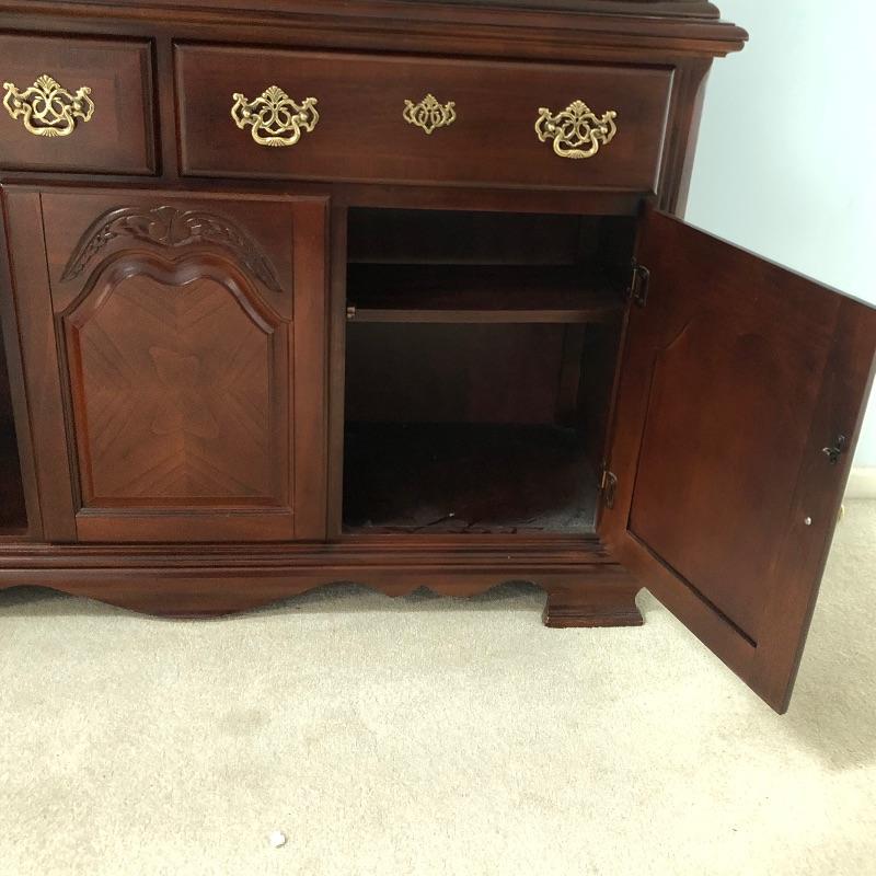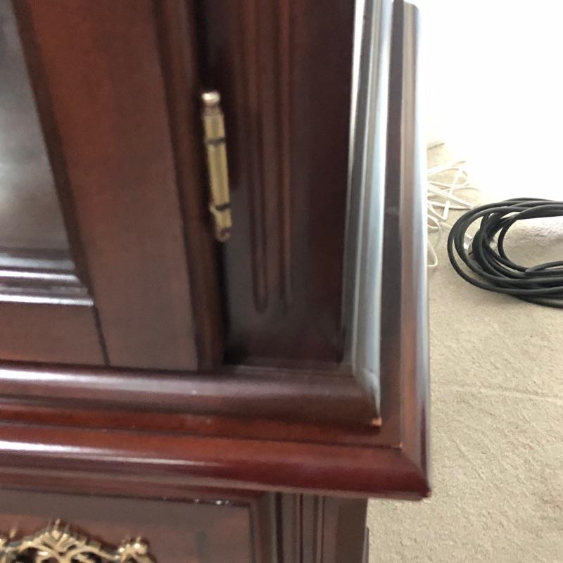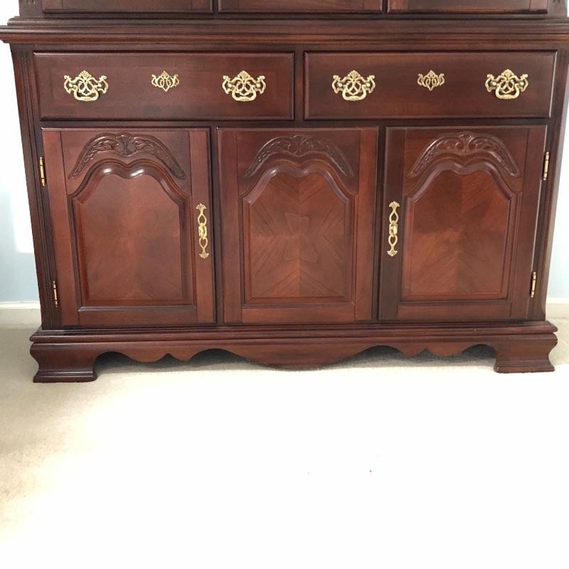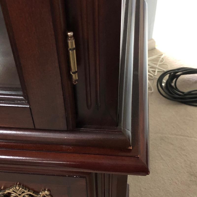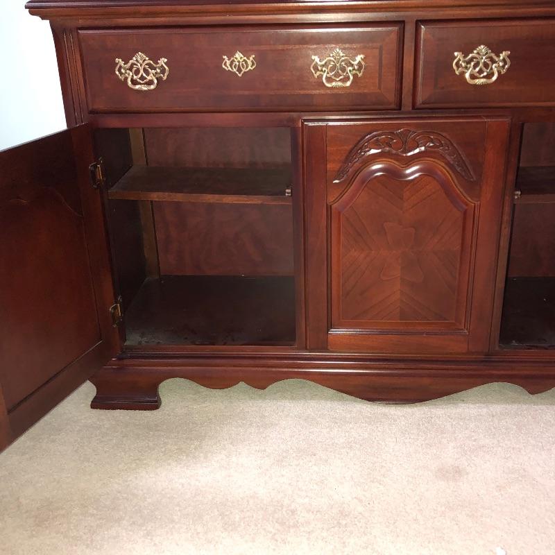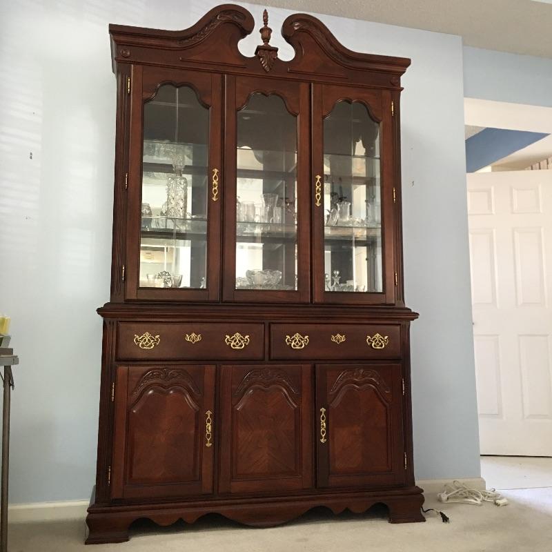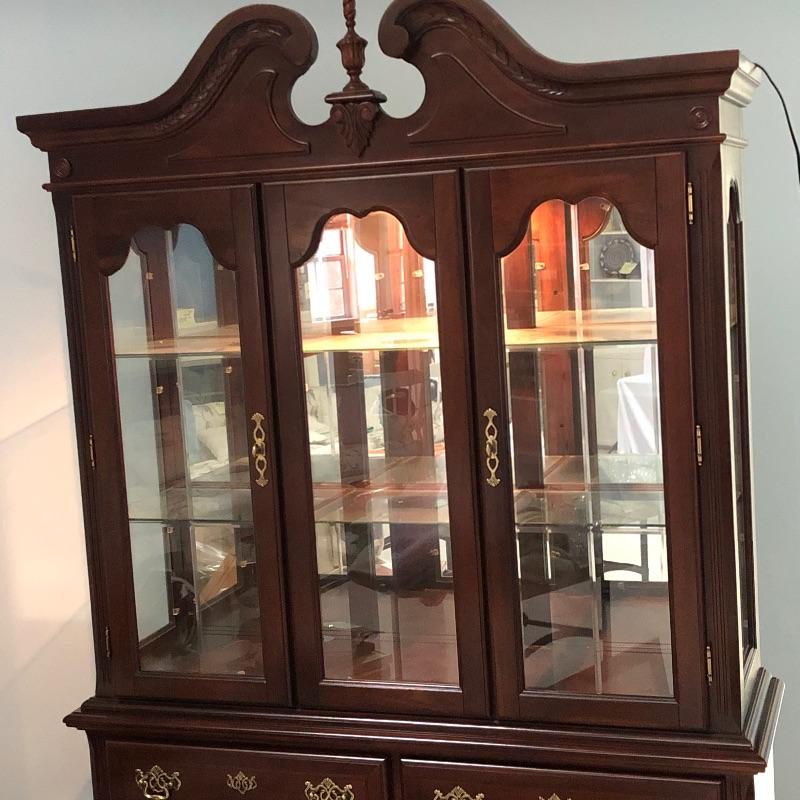 Lovely mixed wood with dark cherry colored china cabinet. Lots of curves and some etched glass panels will enhance your display of treasures. A couple of minor blemishes on bottom right side see photos. The inside is highlight the the display of your treasures.