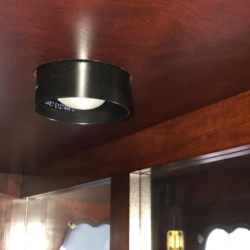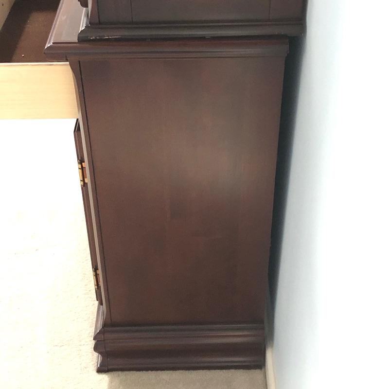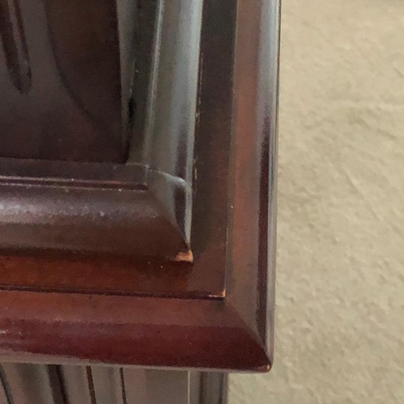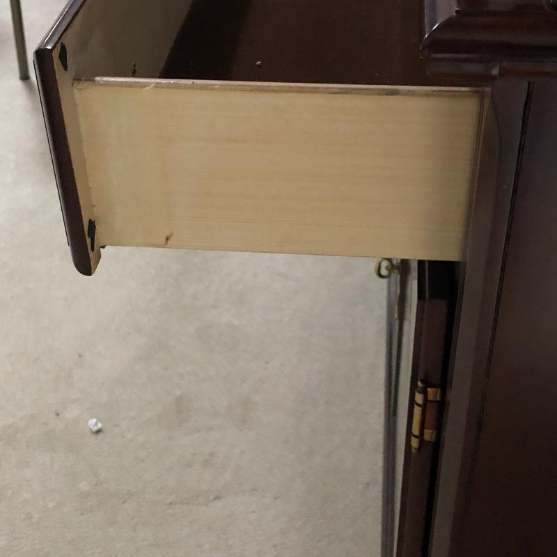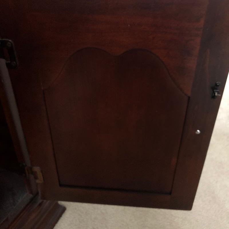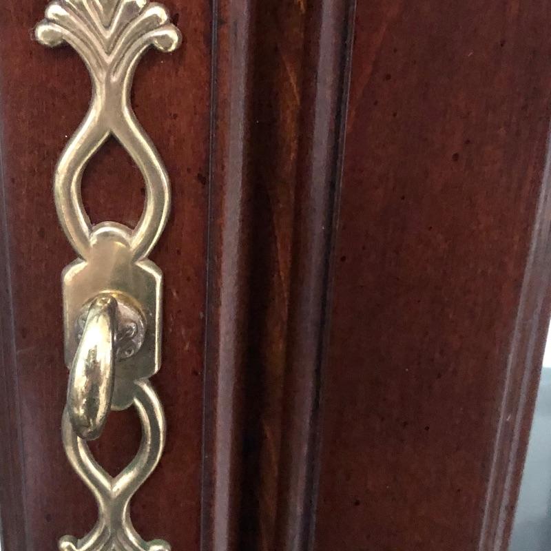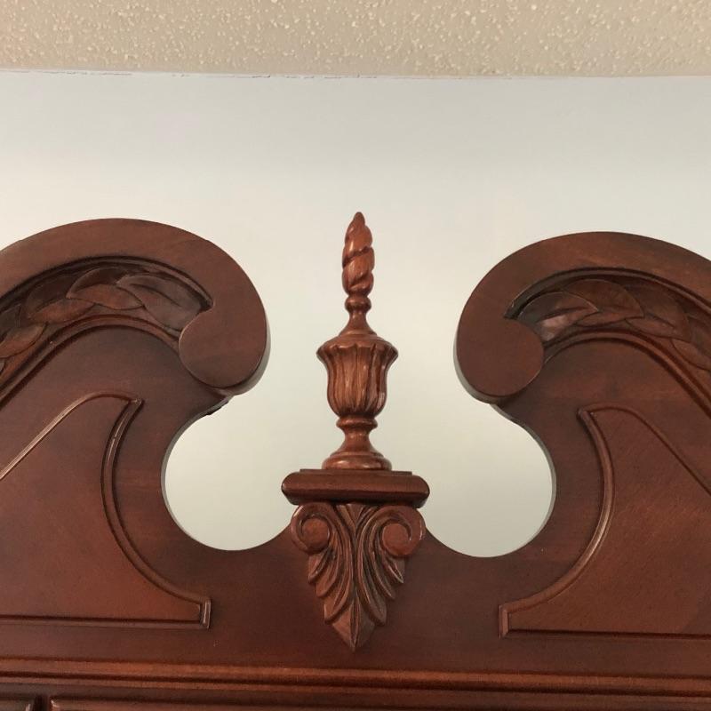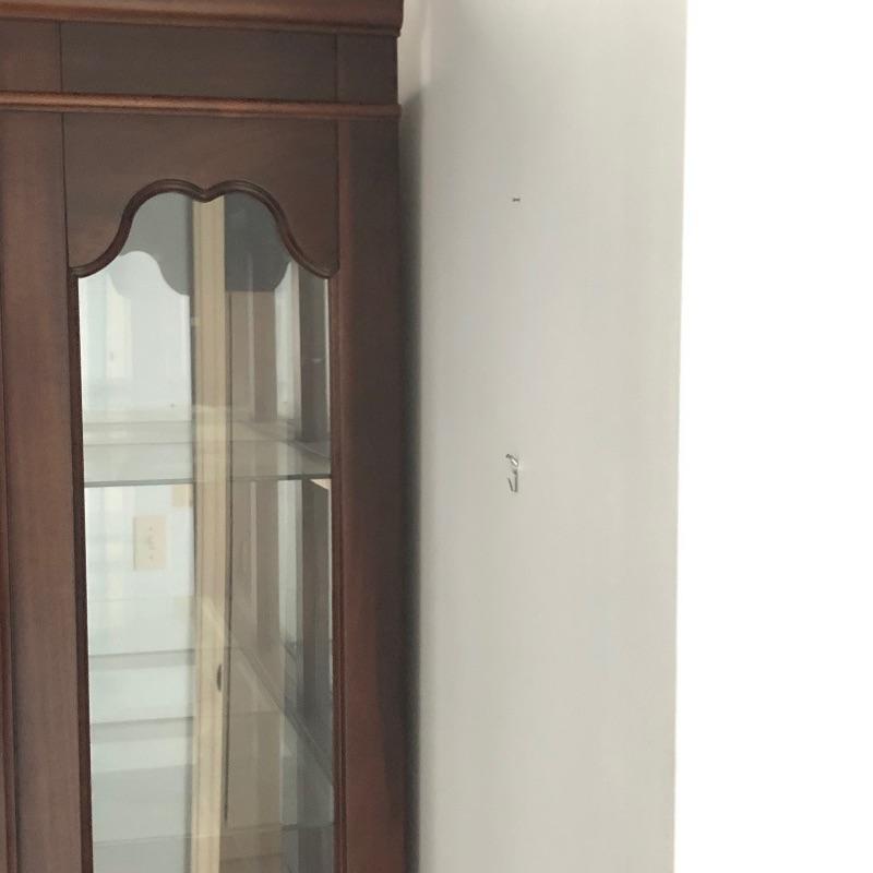 Lovely mixed wood with dark cherry colored china cabinet. Lots of curves and some etched glass panels will enhance your display of treasures. A couple of minor blemishes on bottom right side see photos. The inside is highlight the the display of your treasures.
