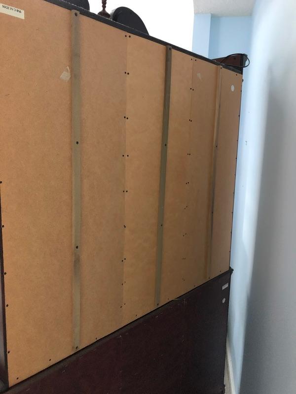 The top piece is not attached to the bottom piece above the drawers, which makes for easy moving and once in place top cabinet is heavy enough to sit comfortably.