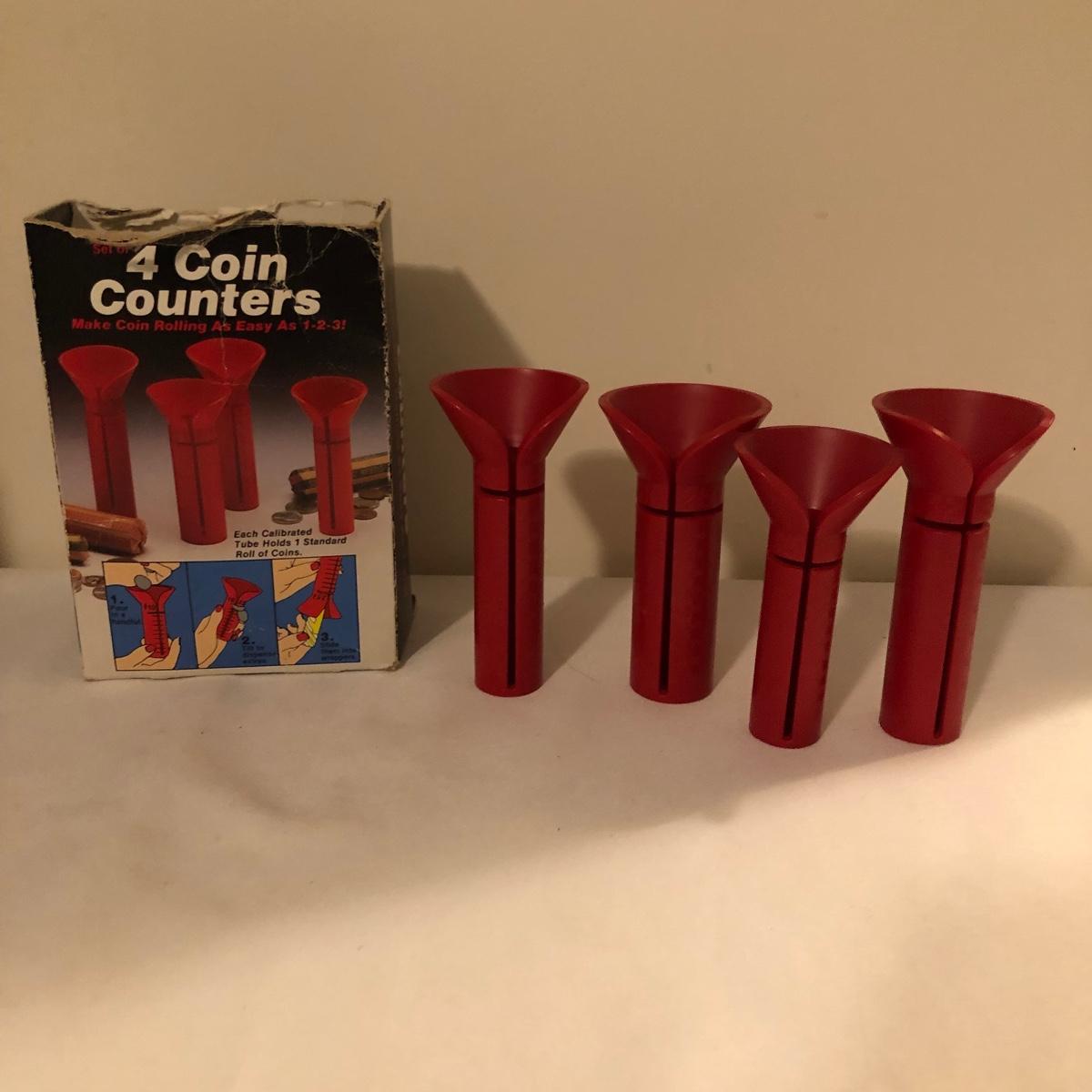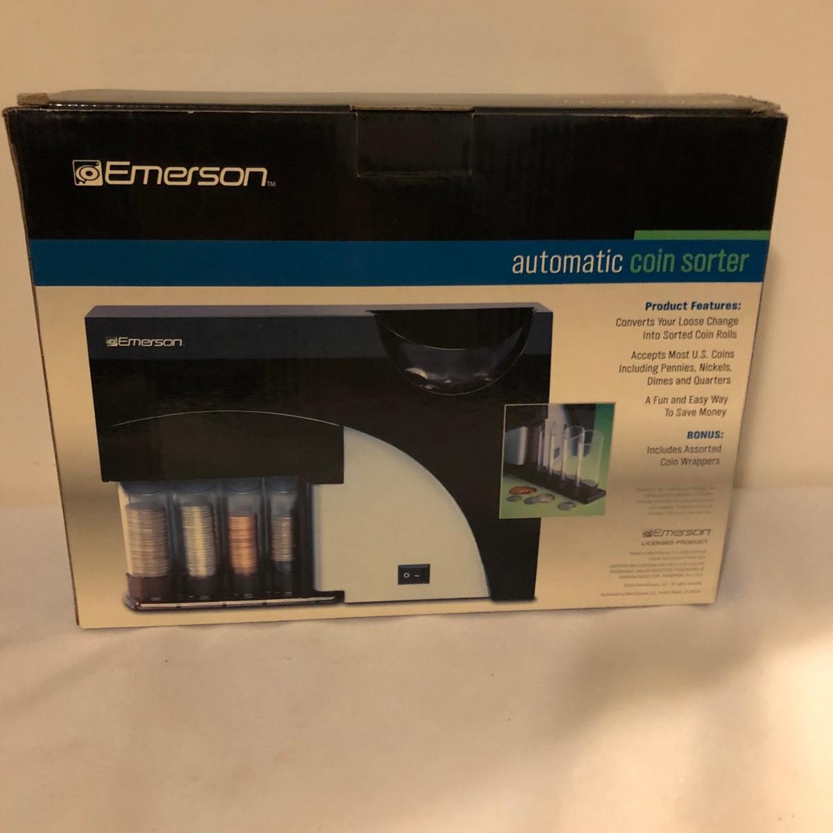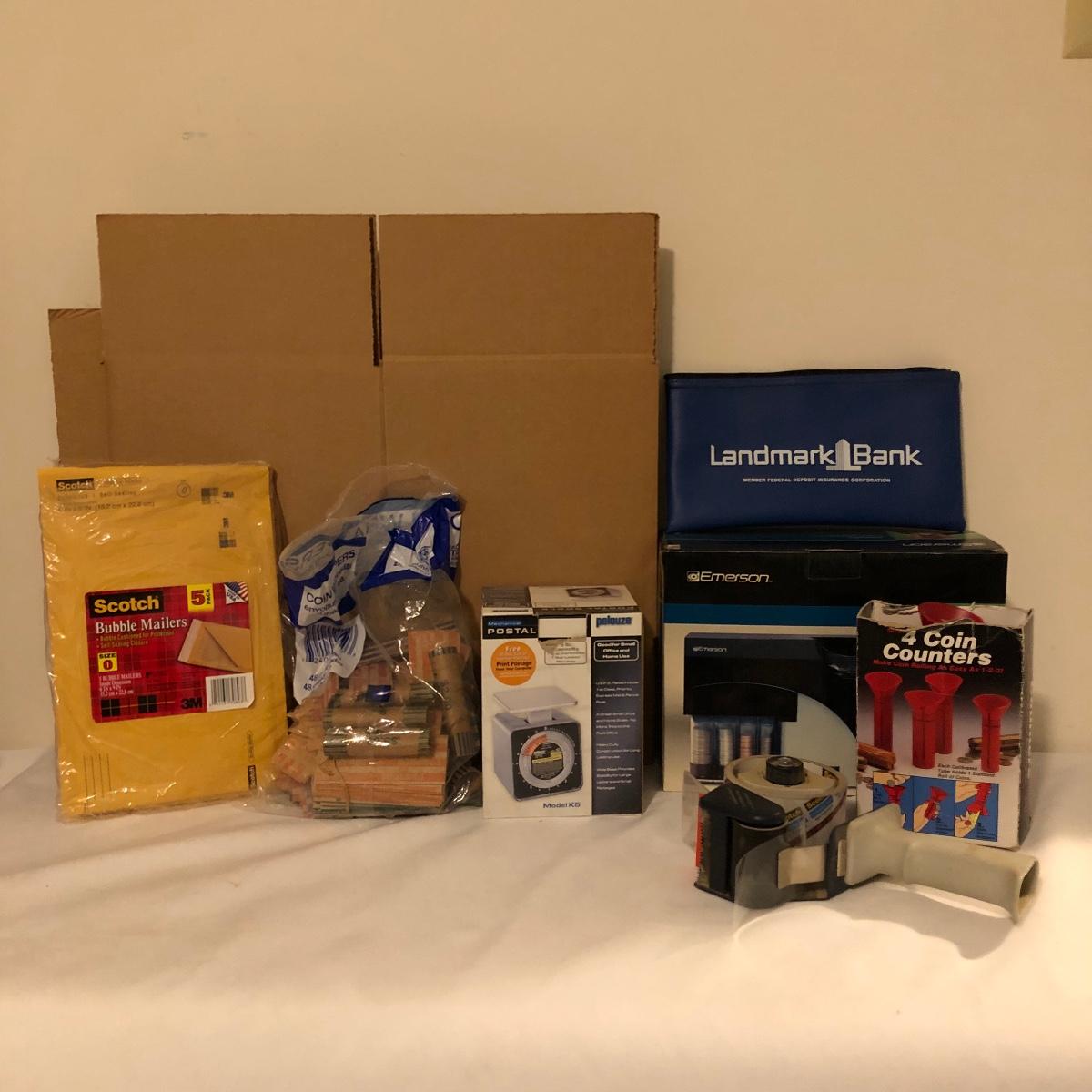 Count your pennies and mail your packages with this useful lot. Lot includes Emerson automatic coin sorter, coin wrappers, mechanical postal scale, tape dispenser, plastic coin counters, boxes, bubble mailers, bank bag and box.