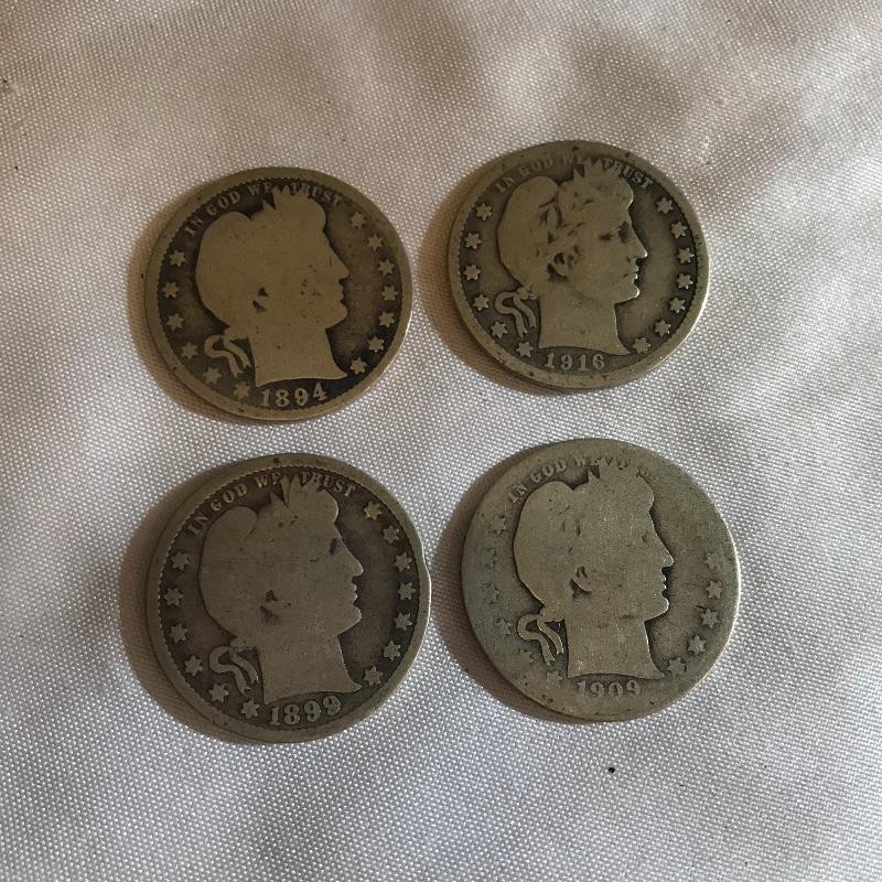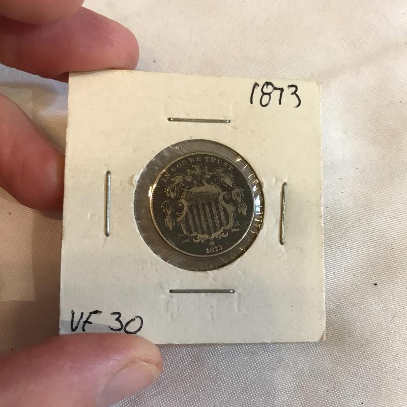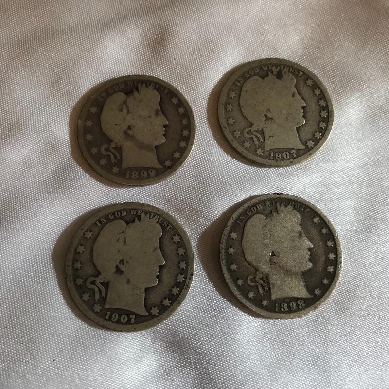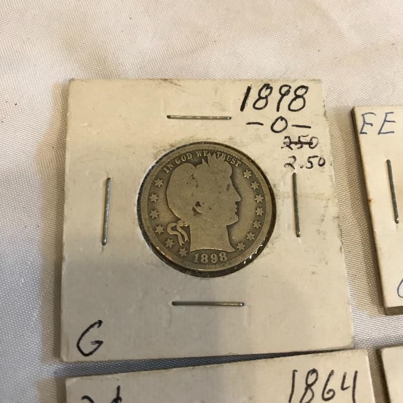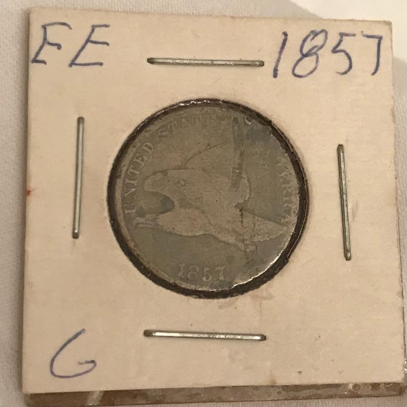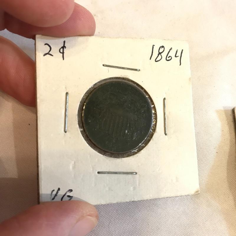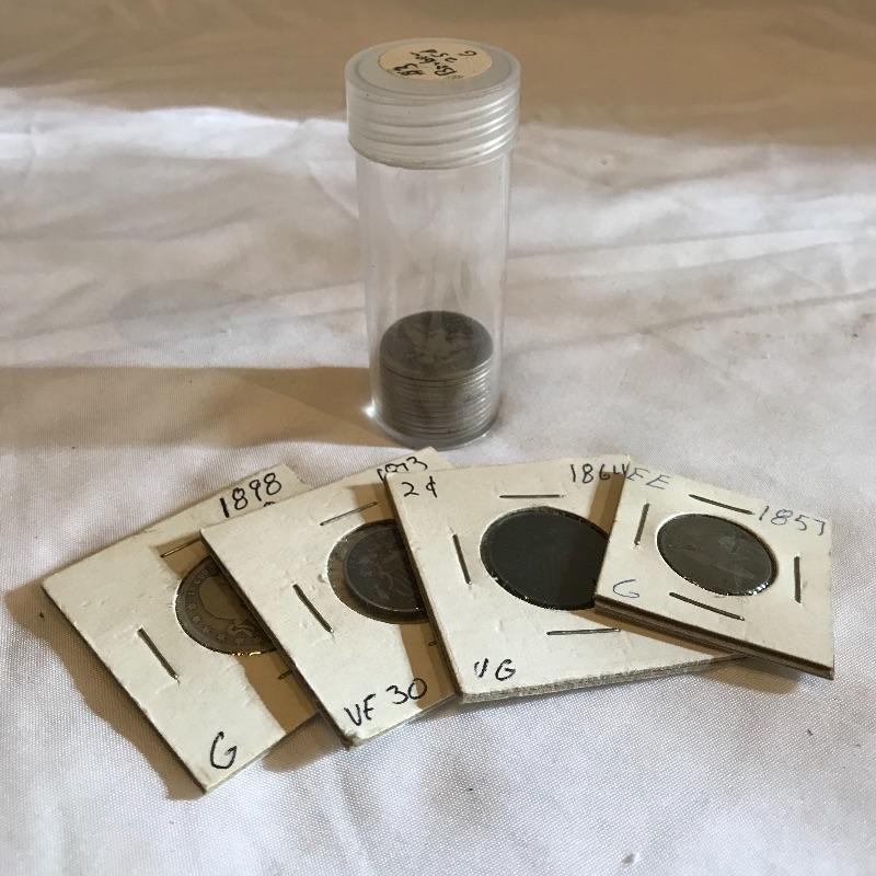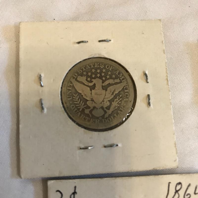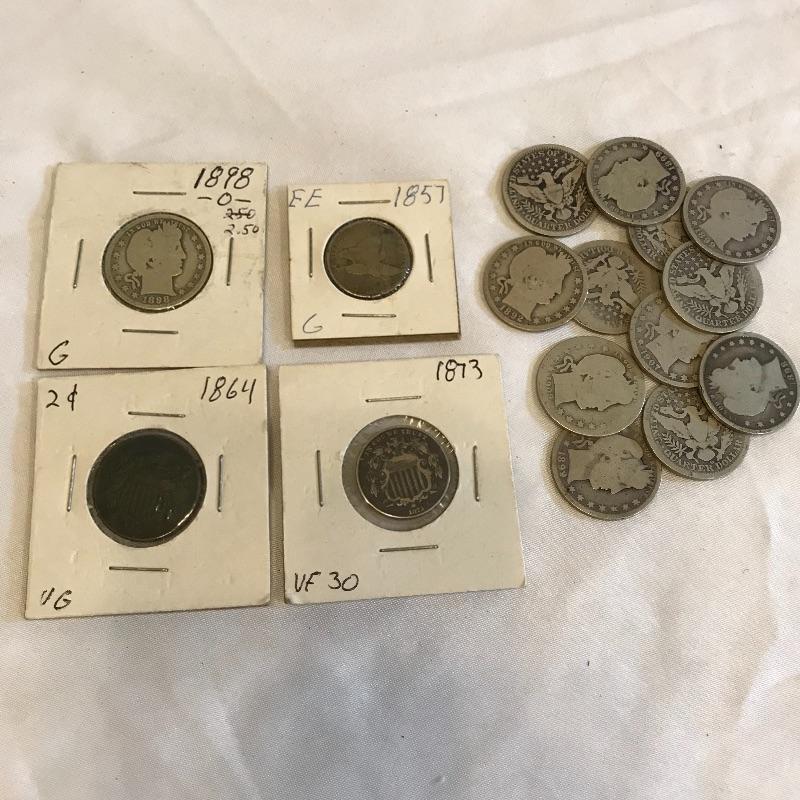Wow! What a way to begin or add to your collection! 1864 "2 cent piece”, 1873 5 ¢ Shield, 1857 1¢ Flying Eagle, 1898 25¢ "Barber", a tube containing 12 Barber 25¢ pieces. The Flying Eagle has a dent in the coin degrading the condition. Lot also includes a 1923 $1 note with blue seal. Apparently this is the last year the larger size dollar was printed. This bill is in poor condition with several tears. See images for all conditions. Shipping available. * Please note, there are no refunds or returns for items purchased at auction. Please be sure to review carefully prior to bidding. We can not verify or authenticate these coins.