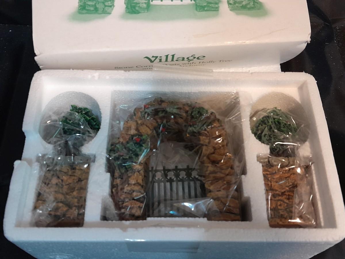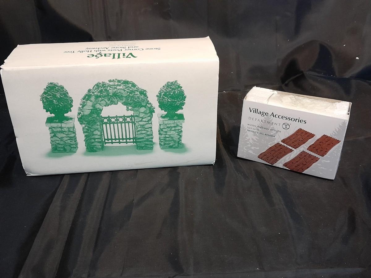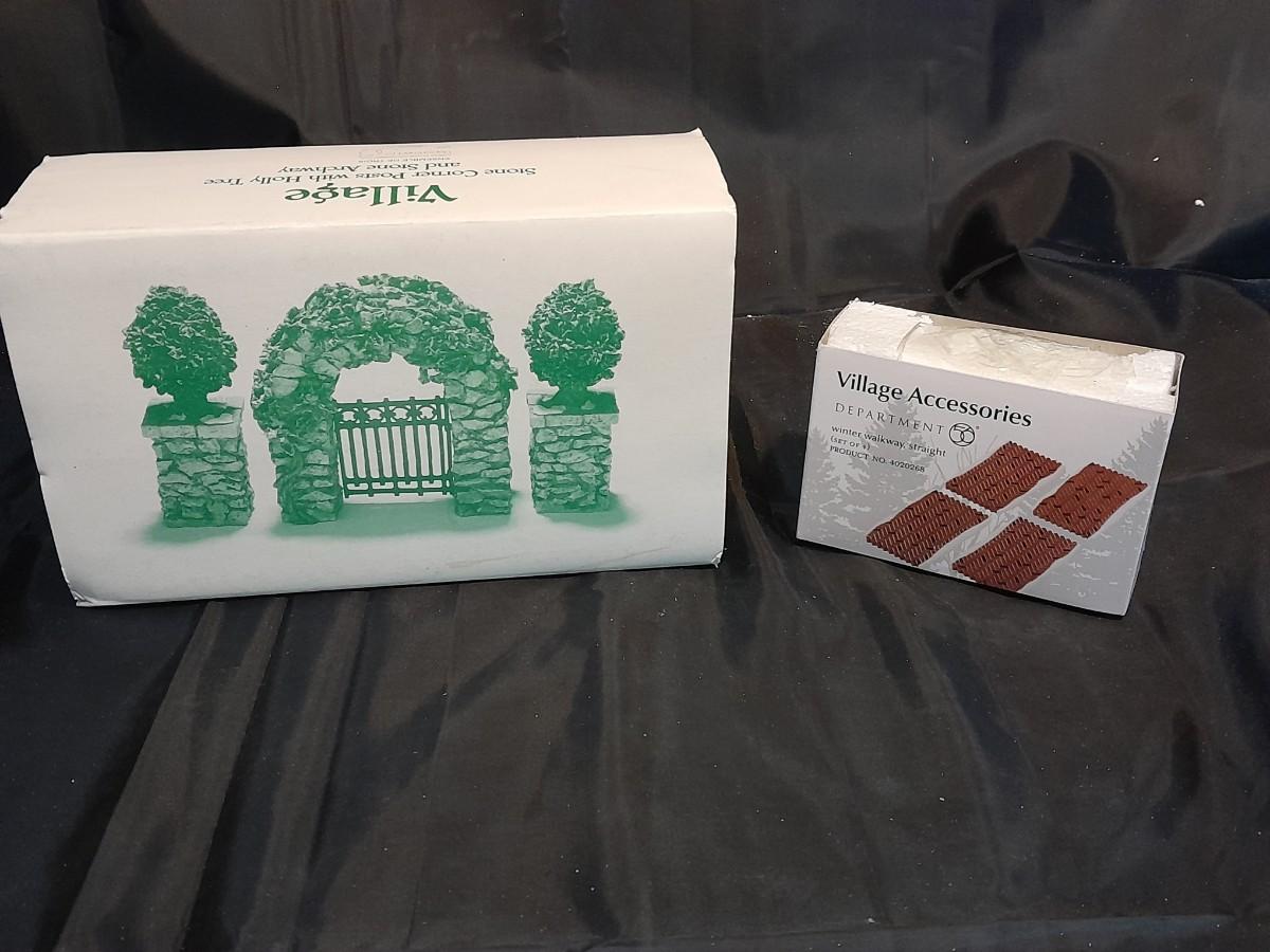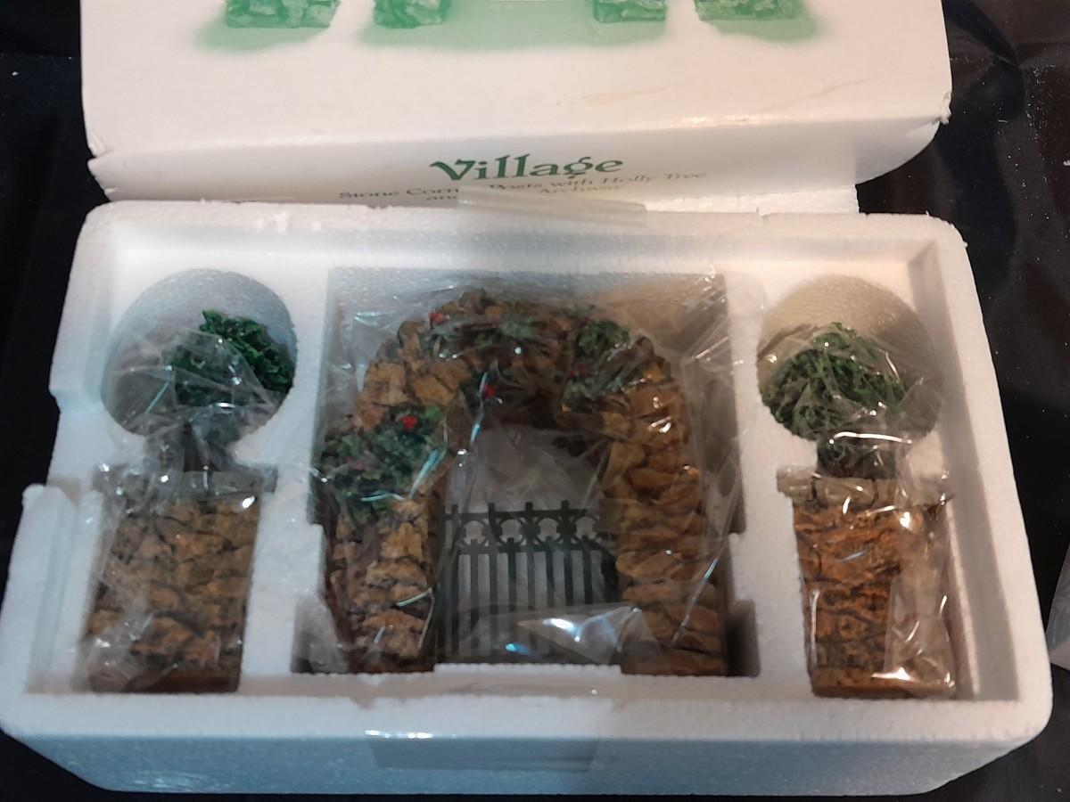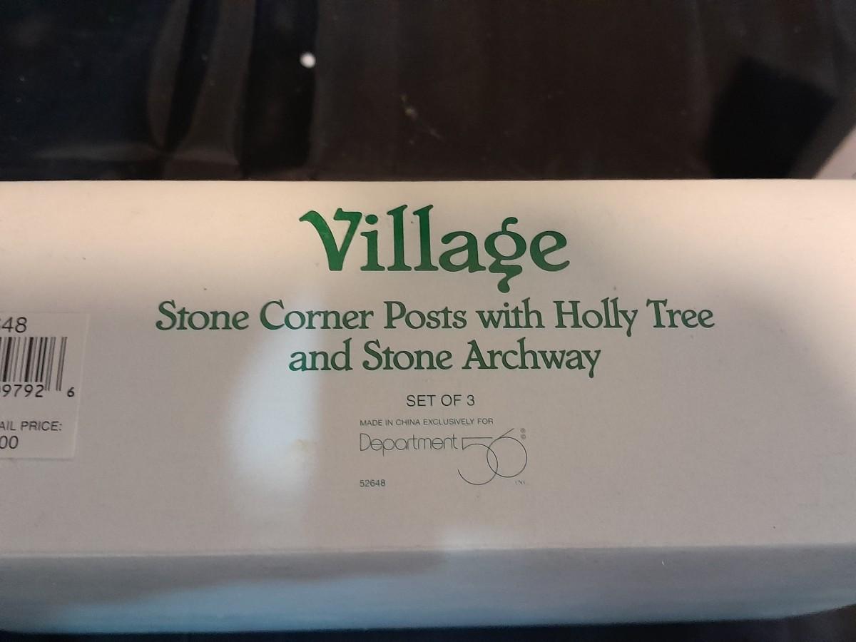 LOT 71 DEPARTMENT 56 WINTER WALKWAY AND STONE CORNER POSTS WITH HOLLY TREE AND STONE ARCHWAY