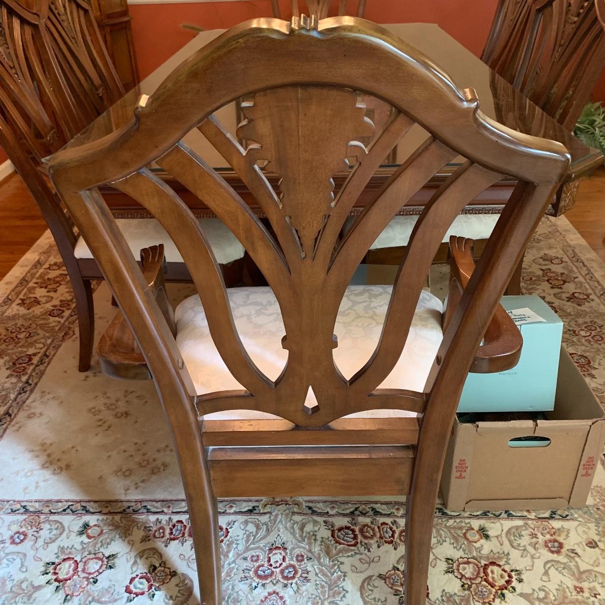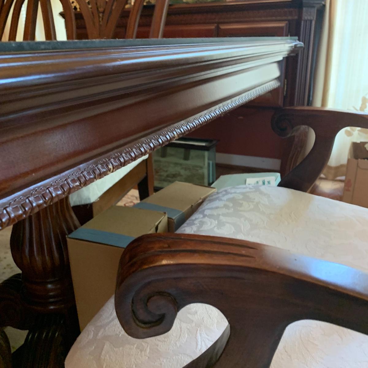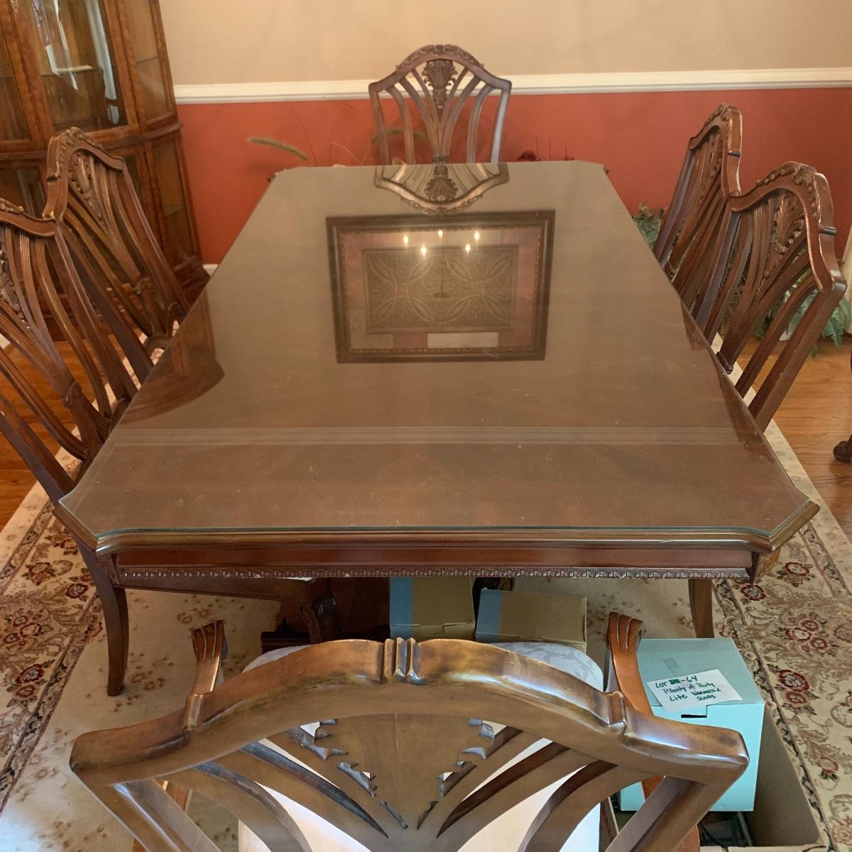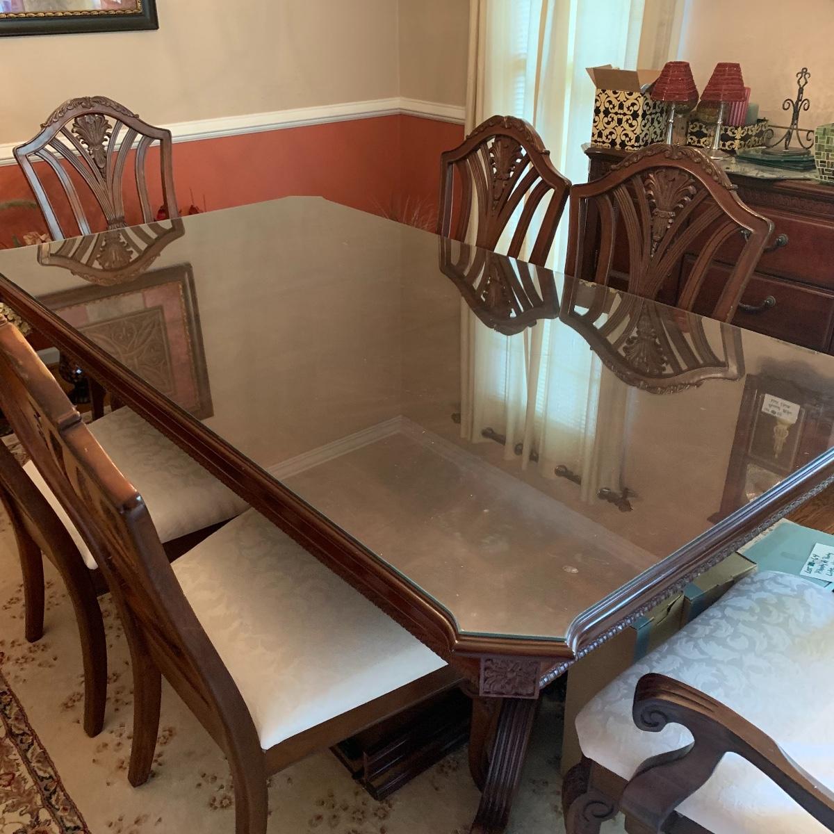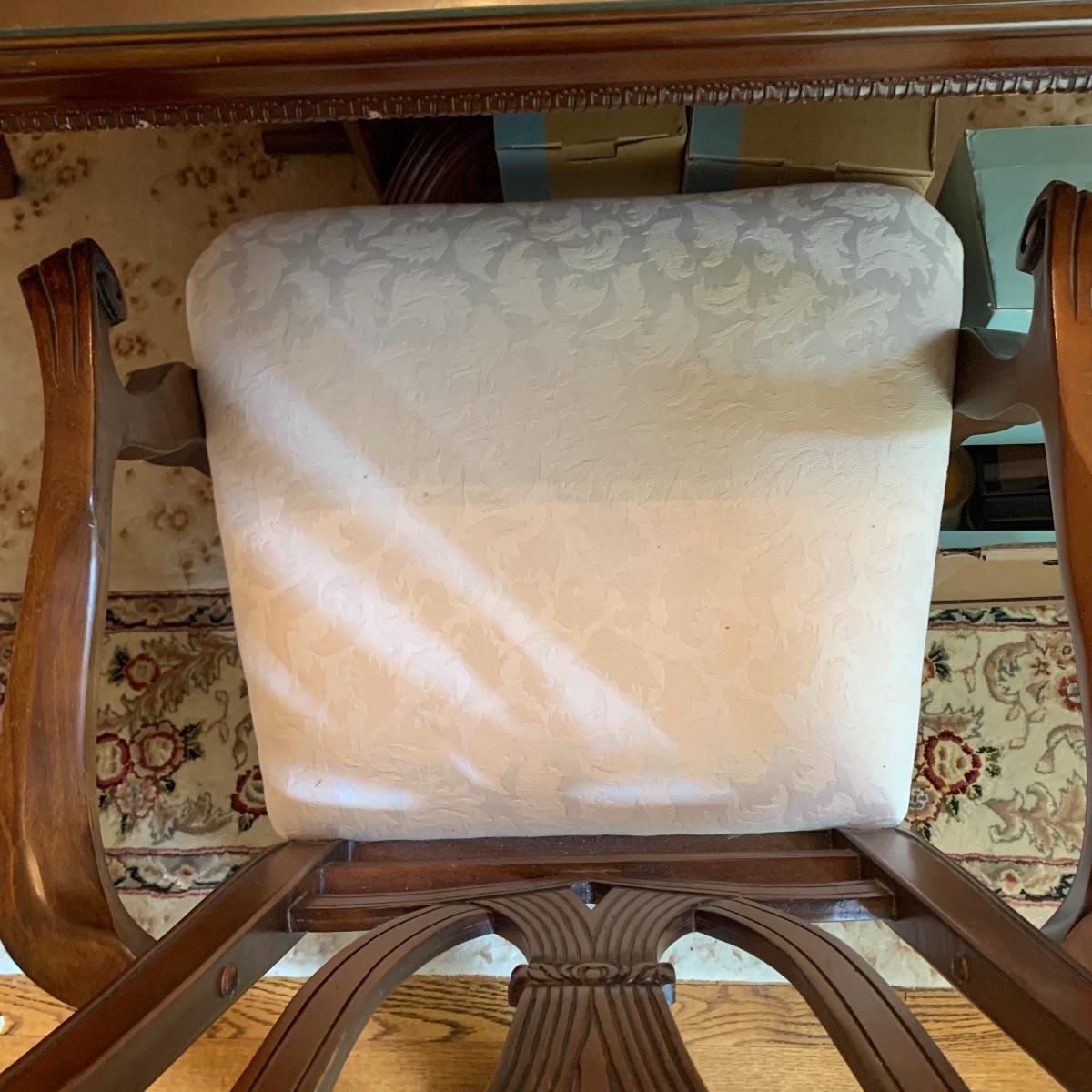You’ll be proud to invite family and friends for dinner and seat them around this beautiful table. This large table comes with a fitted glass top; note the glass top has not always been in place and the table does have blemishes shown in images, however, the detail on both the chairs and table is exquisite! The fabric on the chairs is off white, and features a natural leaf motif. All chairs are in good condition, however one has a few tiny red stains( see pic). The table measures 78” X 42” and comes with two leaves (one is already in place, the other not). All images were taken with the one leaf in place, each leaf adds 14” of length to this table. See pics for details. Please bring help to load this very heavy table. Local pickup only.
