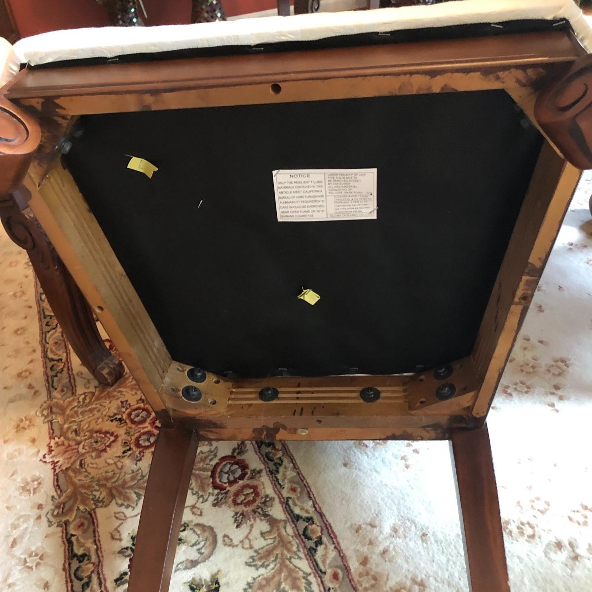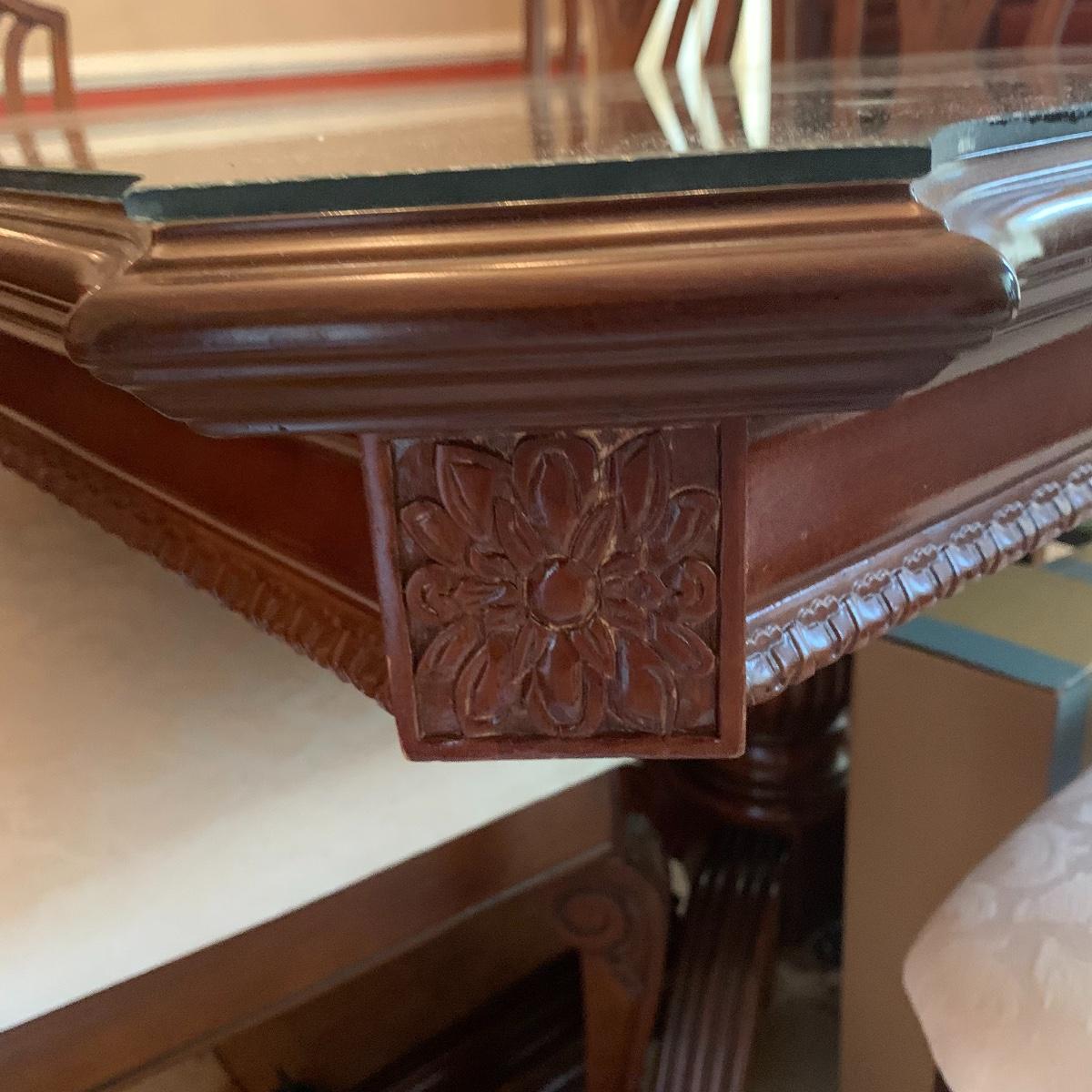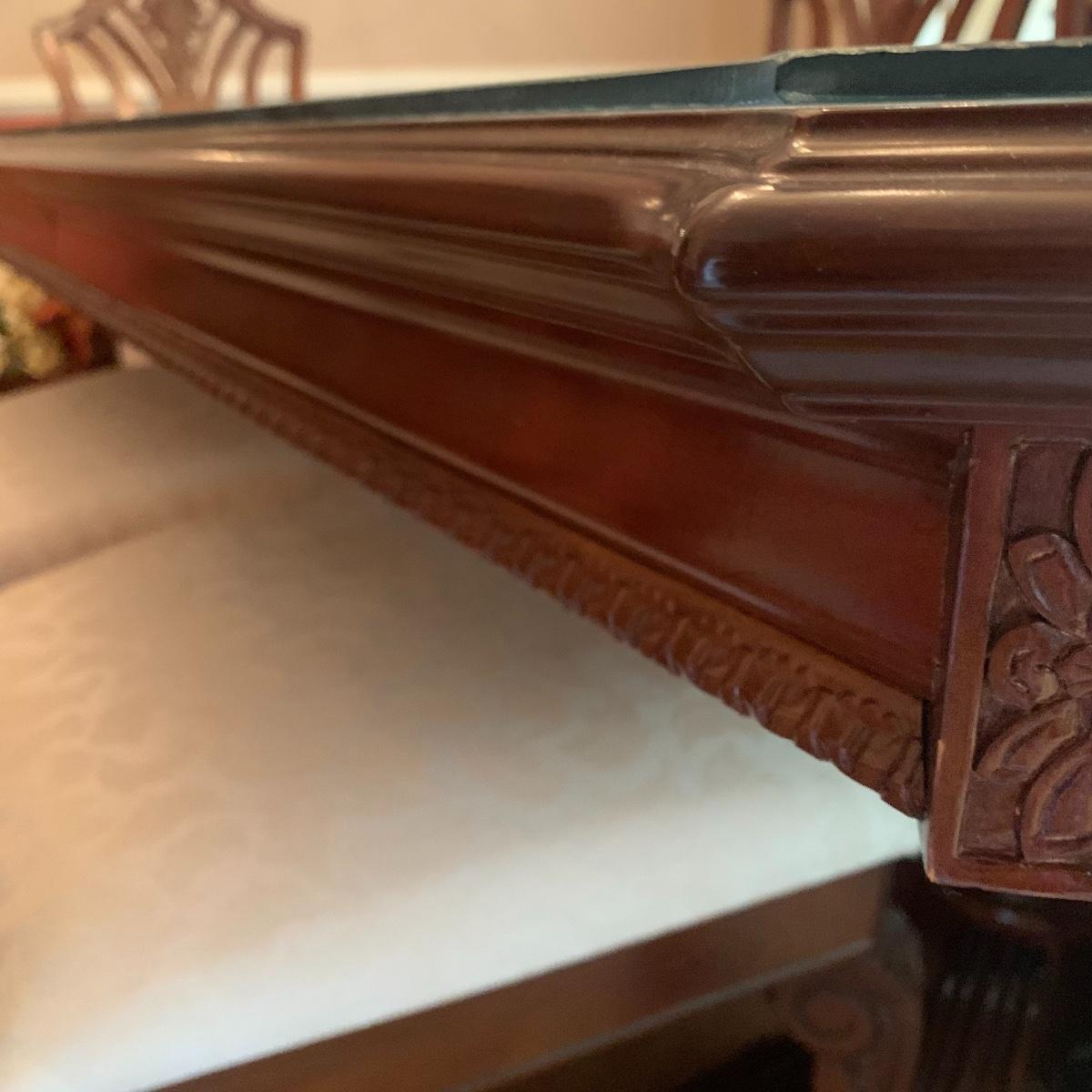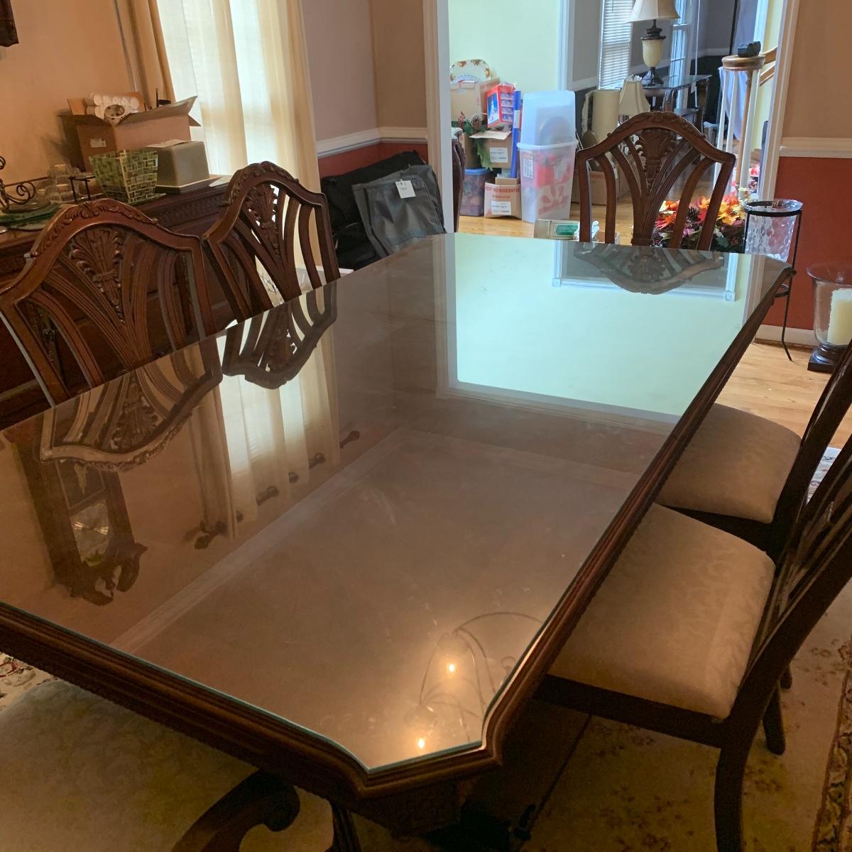 You’ll be proud to invite family and friends for dinner and seat them around this beautiful table. This large table comes with a fitted glass top; note the glass top has not always been in place and the table does have blemishes shown in images, however, the detail on both the chairs and table is exquisite! The fabric on the chairs is off white, and features a natural leaf motif. All chairs are in good condition, however one has a few tiny red stains( see pic). The table measures 78” X 42” and comes with two leaves (one is already in place, the other not). All images were taken with the one leaf in place, each leaf adds 14” of length to this table. See pics for details. Please bring help to load this very heavy table. Local pickup only.