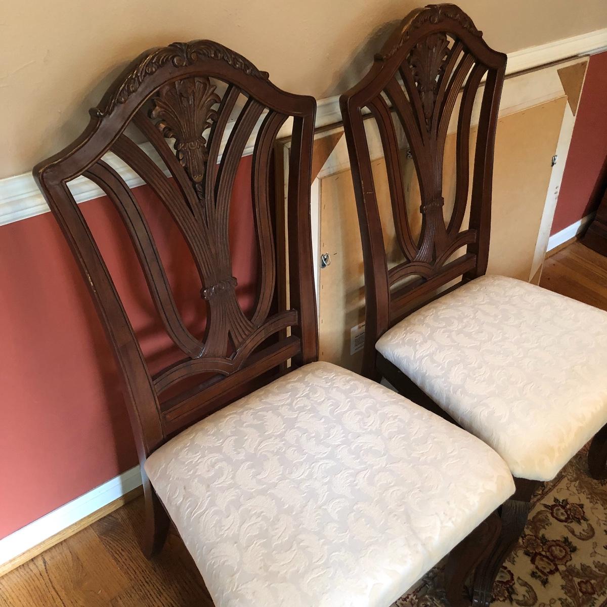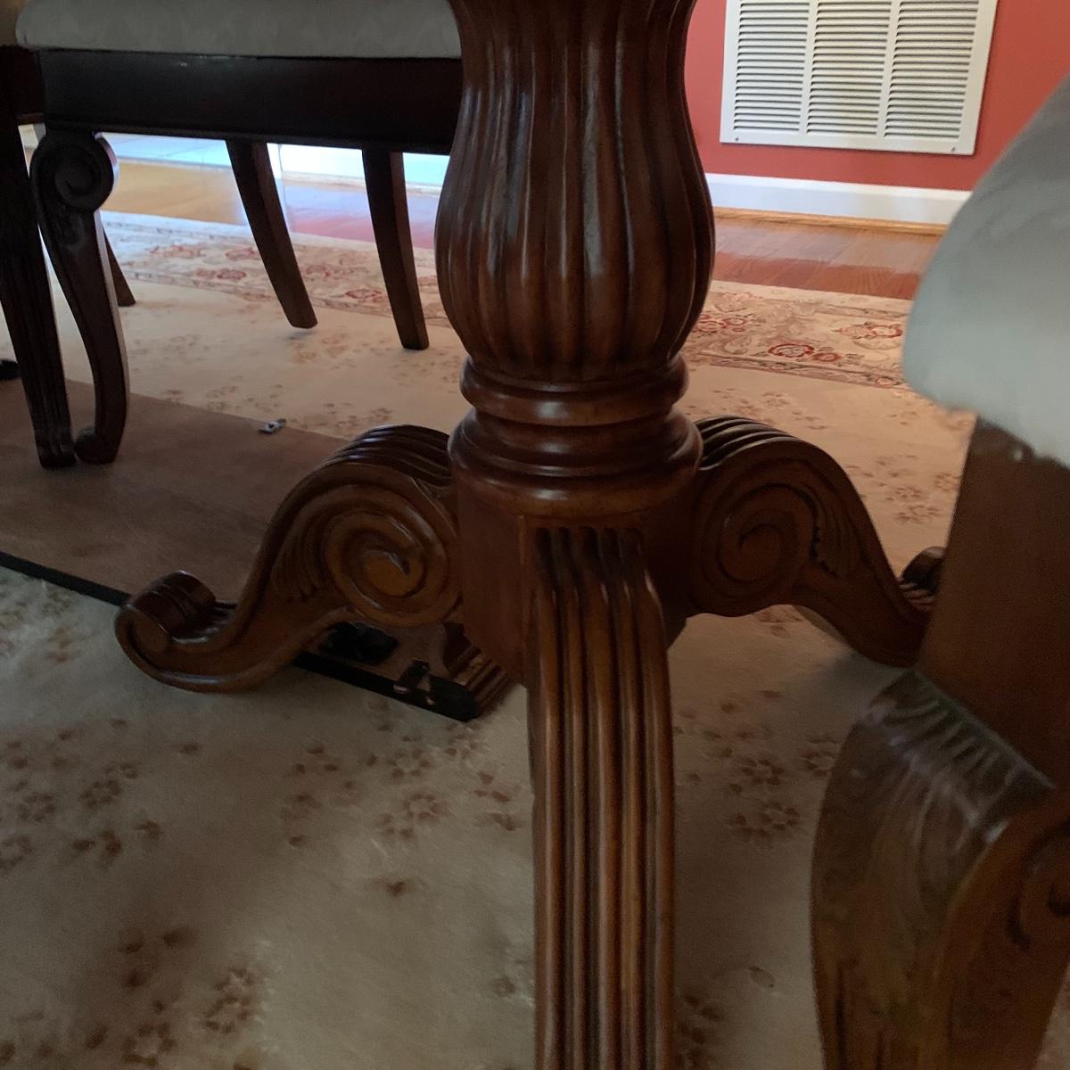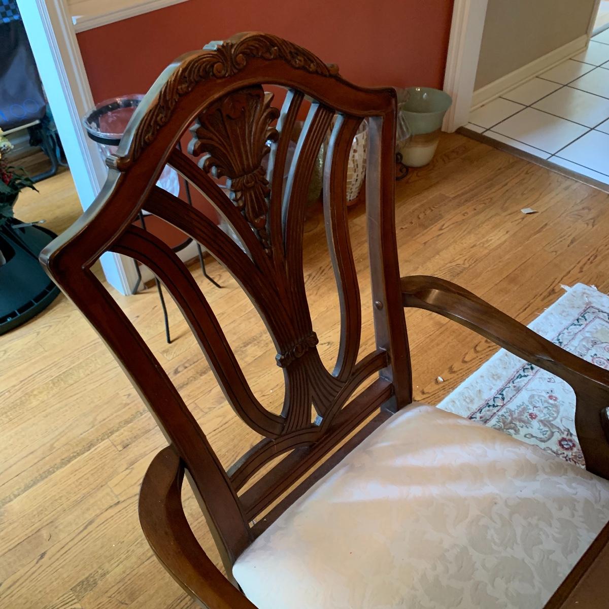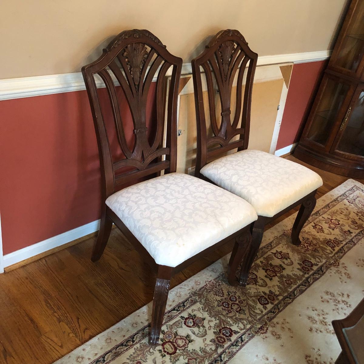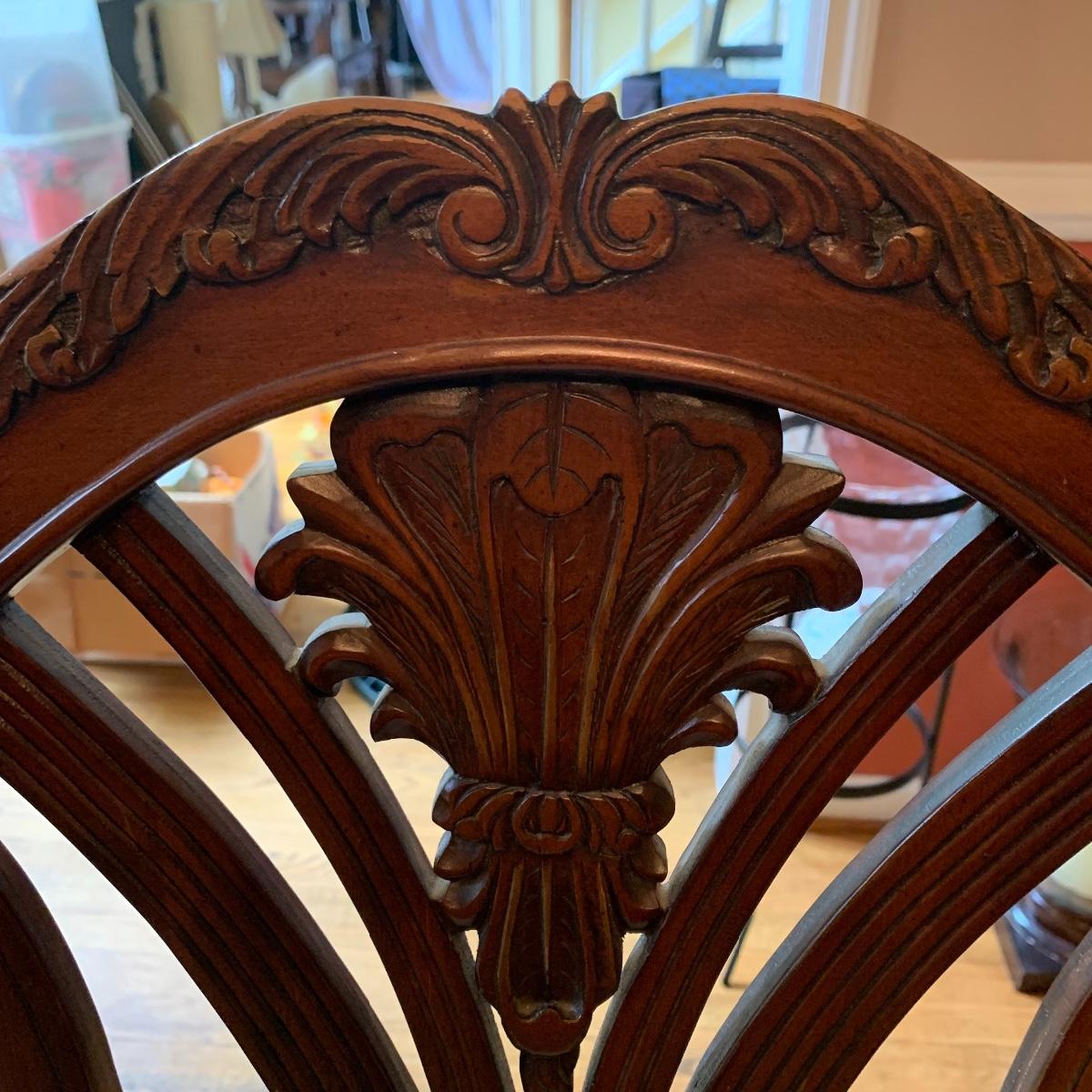 You’ll be proud to invite family and friends for dinner and seat them around this beautiful table. This large table comes with a fitted glass top; note the glass top has not always been in place and the table does have blemishes shown in images, however, the detail on both the chairs and table is exquisite! The fabric on the chairs is off white, and features a natural leaf motif. All chairs are in good condition, however one has a few tiny red stains( see pic). The table measures 78” X 42” and comes with two leaves (one is already in place, the other not). All images were taken with the one leaf in place, each leaf adds 14” of length to this table. See pics for details. Please bring help to load this very heavy table. Local pickup only.