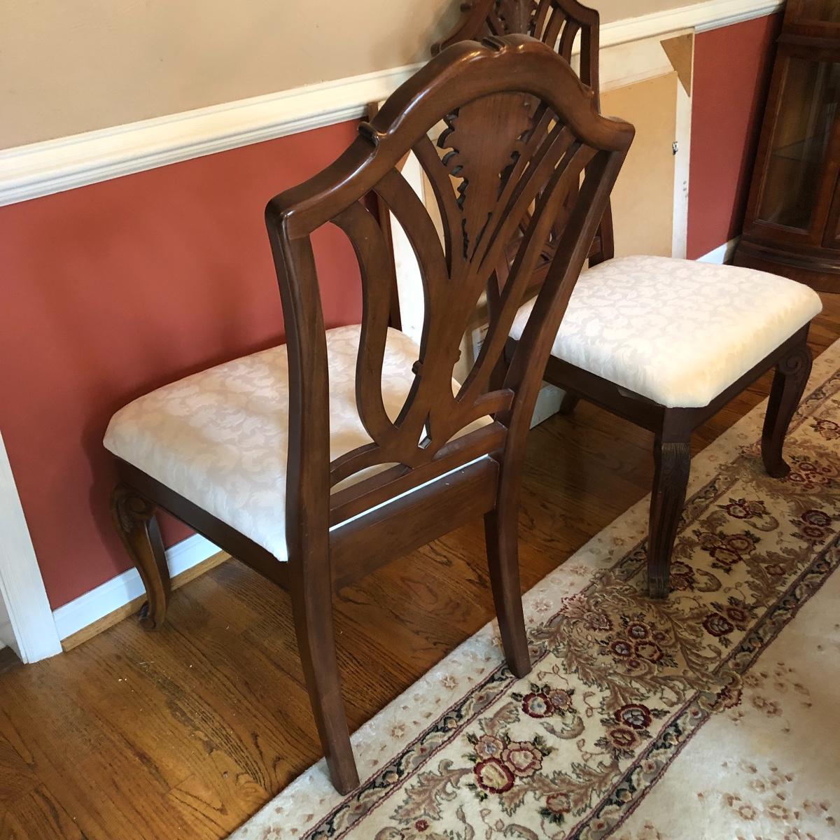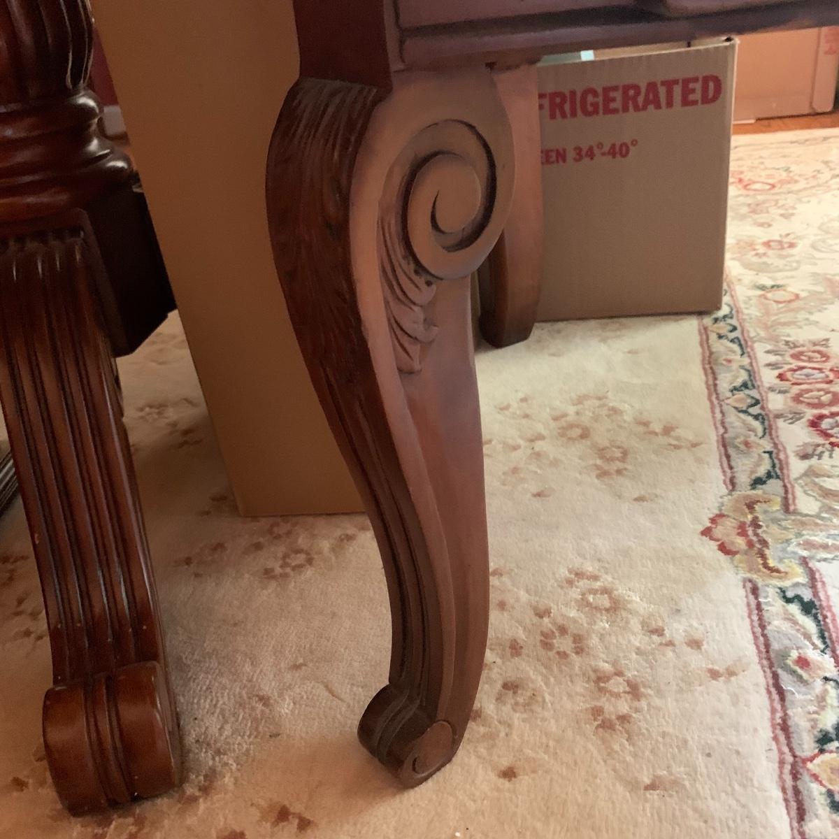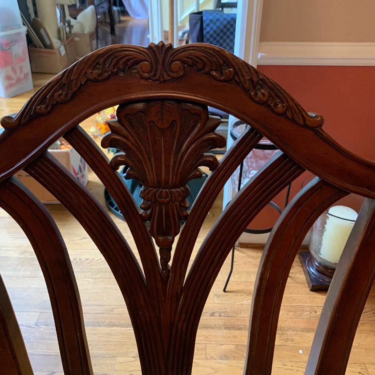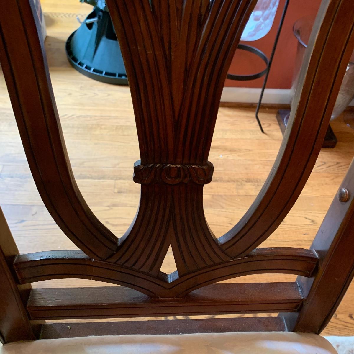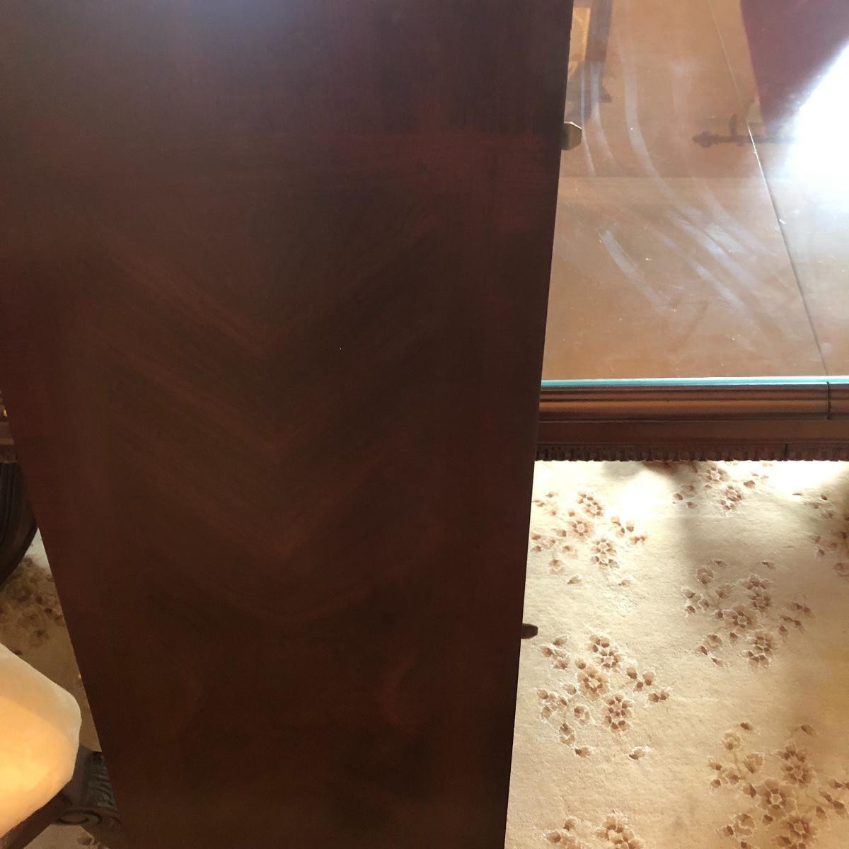 You’ll be proud to invite family and friends for dinner and seat them around this beautiful table. This large table comes with a fitted glass top; note the glass top has not always been in place and the table does have blemishes shown in images, however, the detail on both the chairs and table is exquisite! The fabric on the chairs is off white, and features a natural leaf motif. All chairs are in good condition, however one has a few tiny red stains( see pic). The table measures 78” X 42” and comes with two leaves (one is already in place, the other not). All images were taken with the one leaf in place, each leaf adds 14” of length to this table. See pics for details. Please bring help to load this very heavy table. Local pickup only.