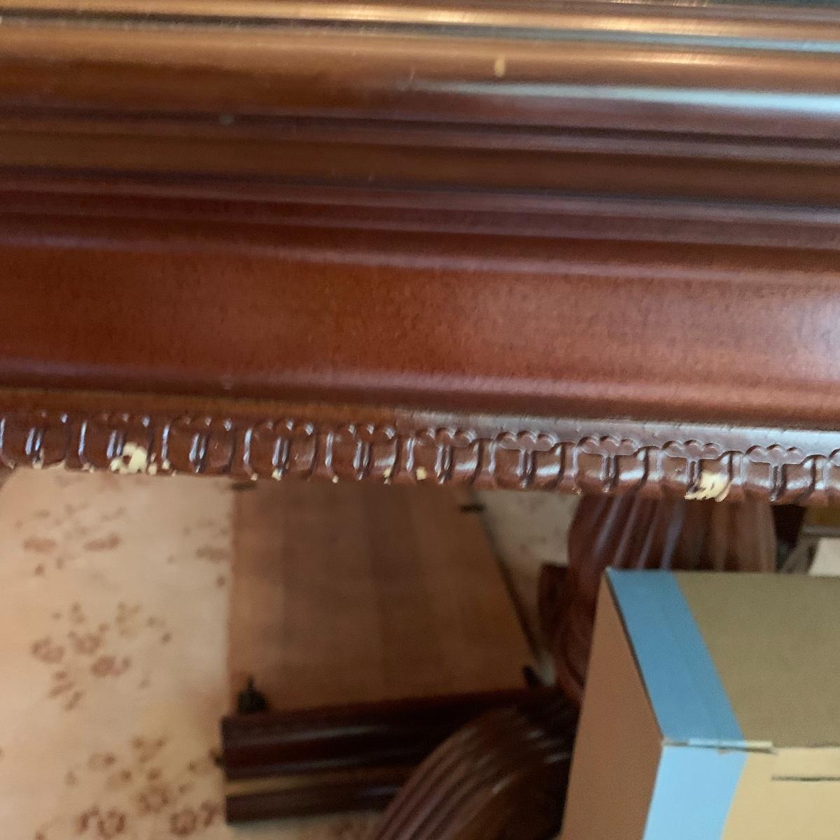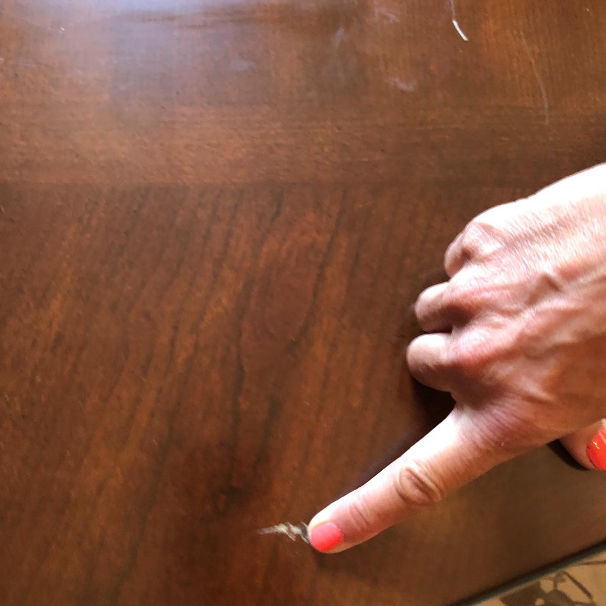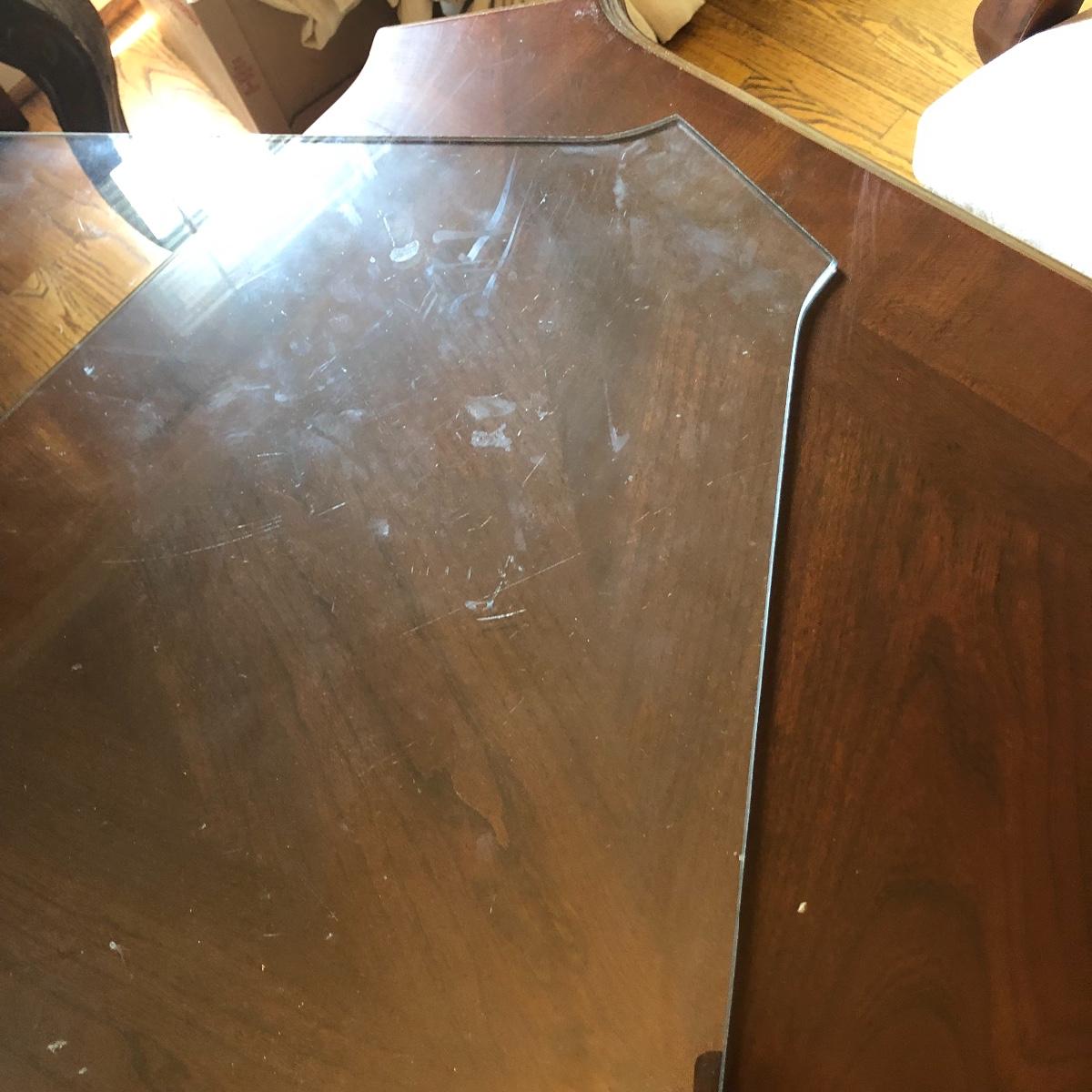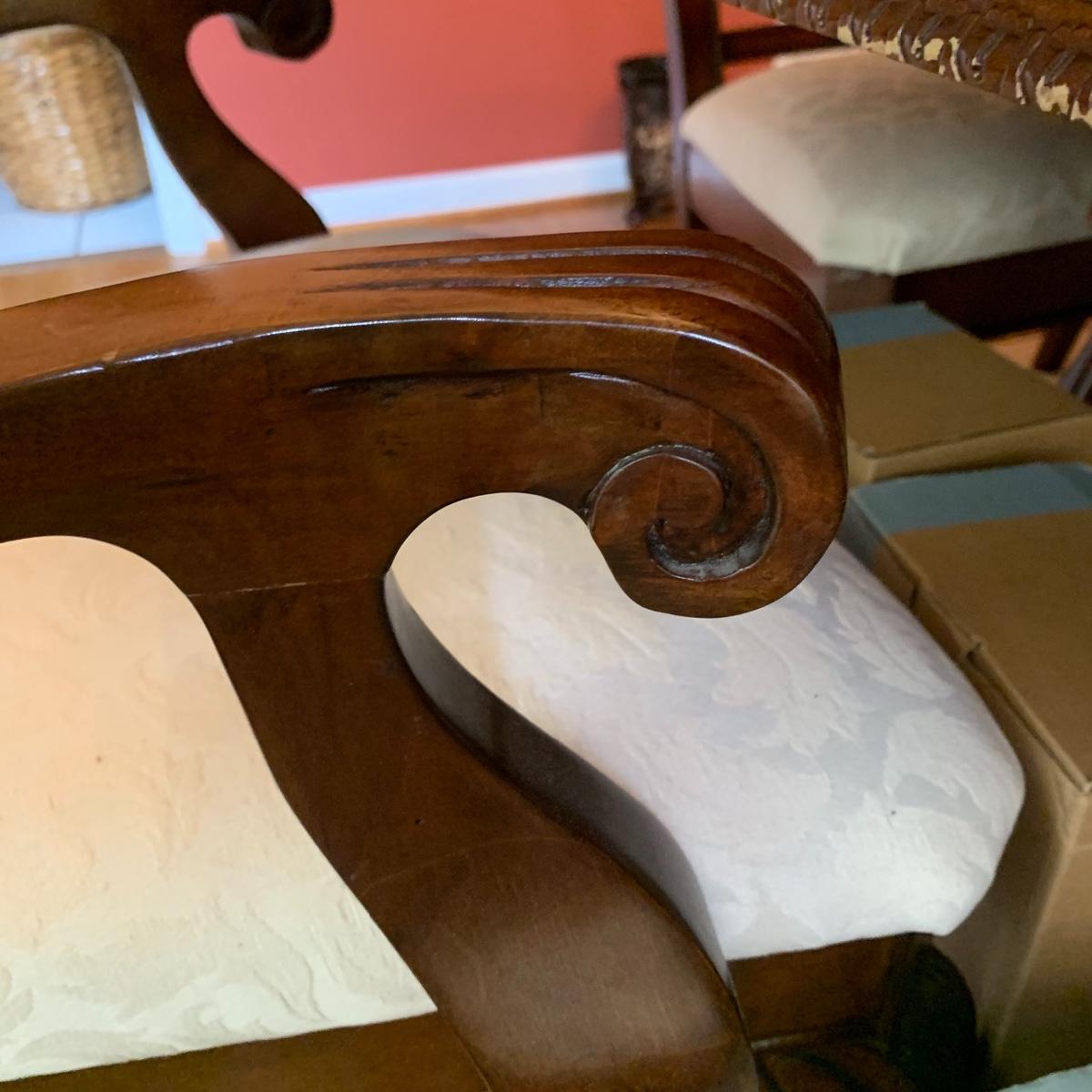 You’ll be proud to invite family and friends for dinner and seat them around this beautiful table. This large table comes with a fitted glass top; note the glass top has not always been in place and the table does have blemishes shown in images, however, the detail on both the chairs and table is exquisite! The fabric on the chairs is off white, and features a natural leaf motif. All chairs are in good condition, however one has a few tiny red stains( see pic). The table measures 78” X 42” and comes with two leaves (one is already in place, the other not). All images were taken with the one leaf in place, each leaf adds 14” of length to this table. See pics for details. Please bring help to load this very heavy table. Local pickup only.