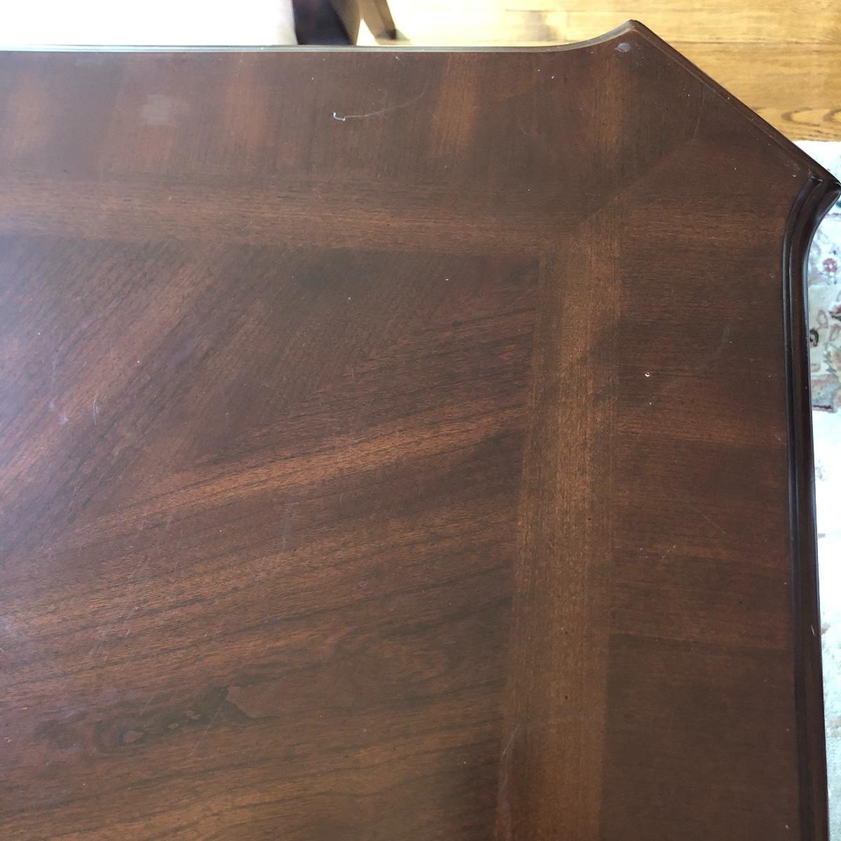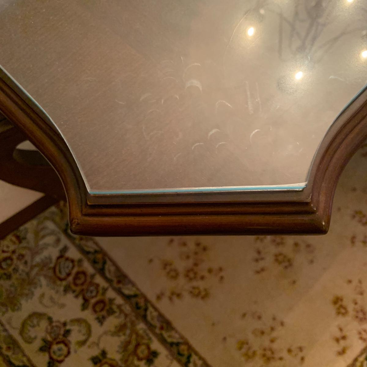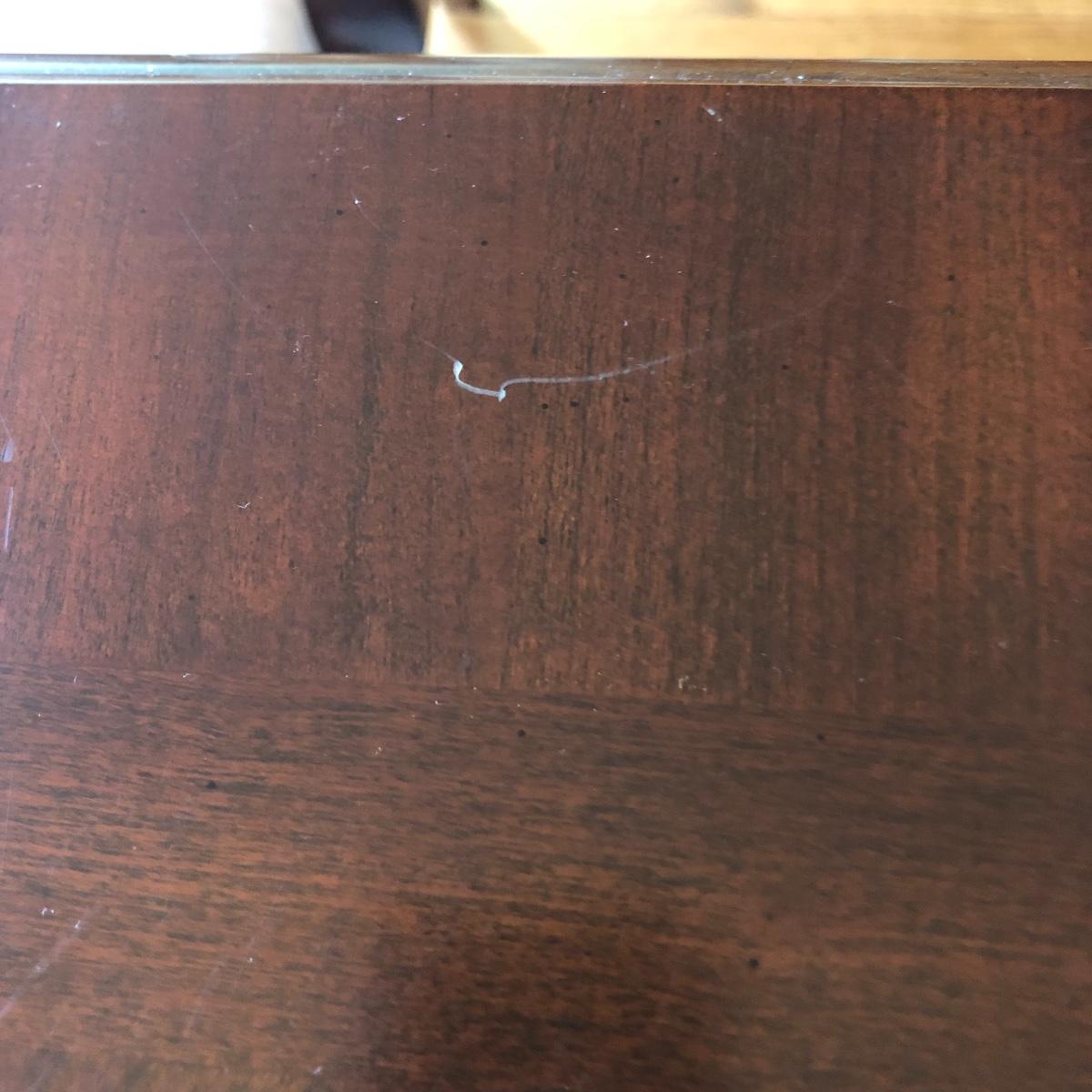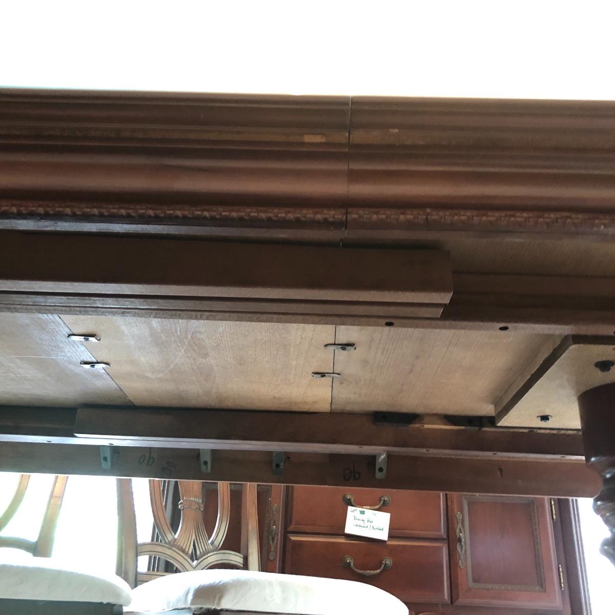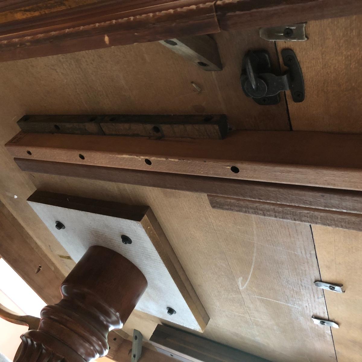 You’ll be proud to invite family and friends for dinner and seat them around this beautiful table. This large table comes with a fitted glass top; note the glass top has not always been in place and the table does have blemishes shown in images, however, the detail on both the chairs and table is exquisite! The fabric on the chairs is off white, and features a natural leaf motif. All chairs are in good condition, however one has a few tiny red stains( see pic). The table measures 78” X 42” and comes with two leaves (one is already in place, the other not). All images were taken with the one leaf in place, each leaf adds 14” of length to this table. See pics for details. Please bring help to load this very heavy table. Local pickup only.