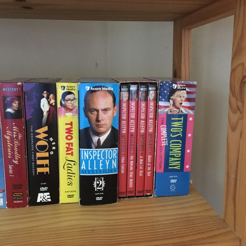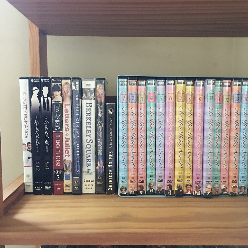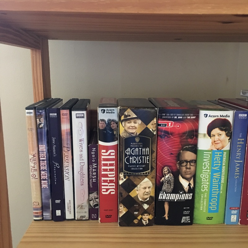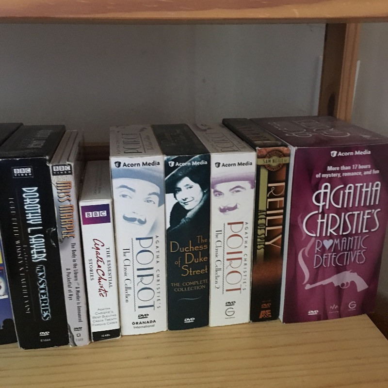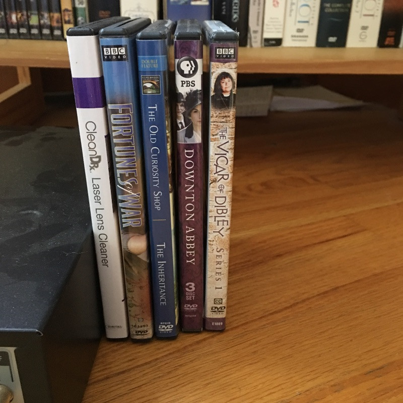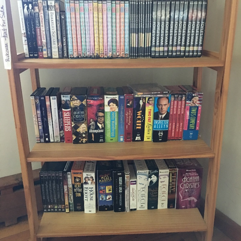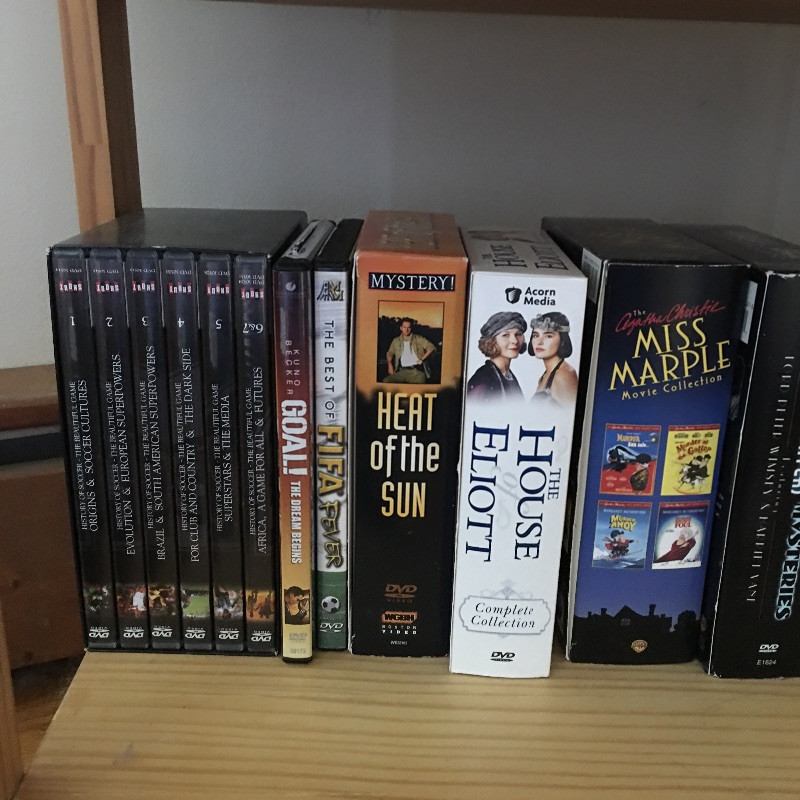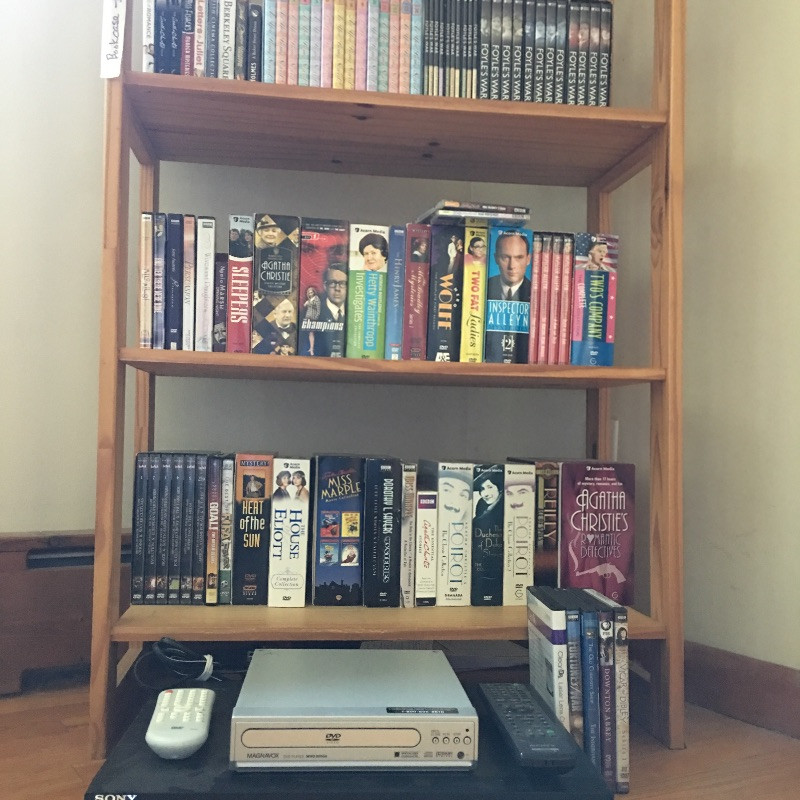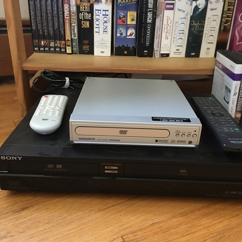 Sony DVD & VHS recorder, Magnavox DVD player and a plethora of DVDs including Vicar of Dibley, Agatha Christie, Miss Marple, History of Soccer and more. Also includes a few audio discs. See pictures for all titles. Shelves not included.