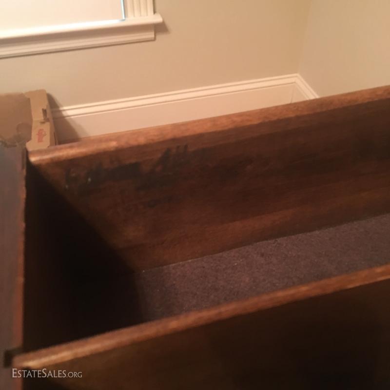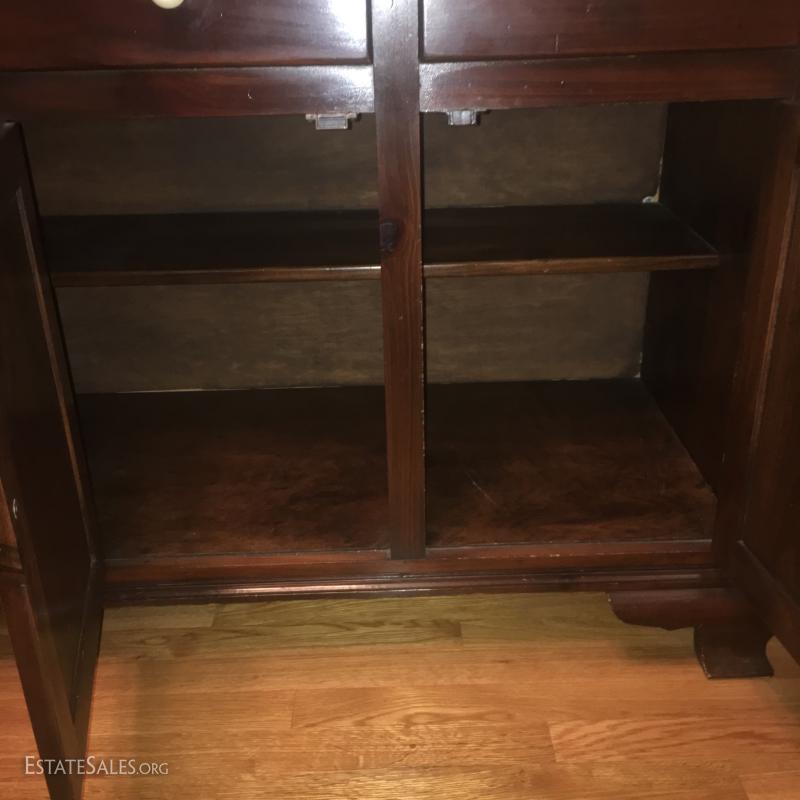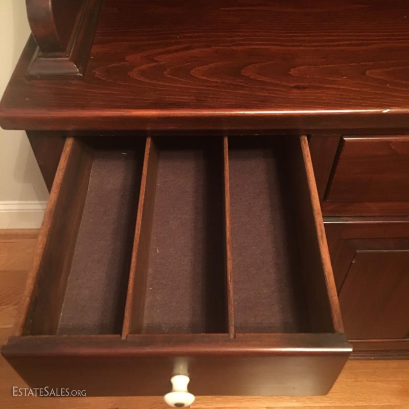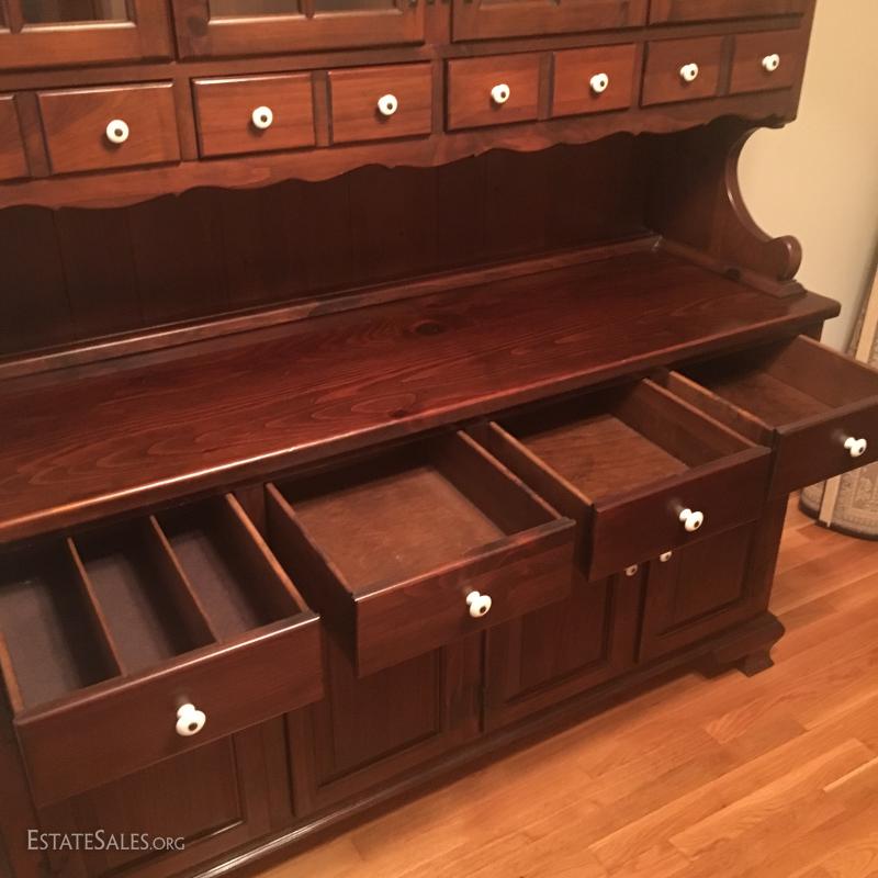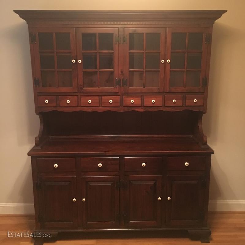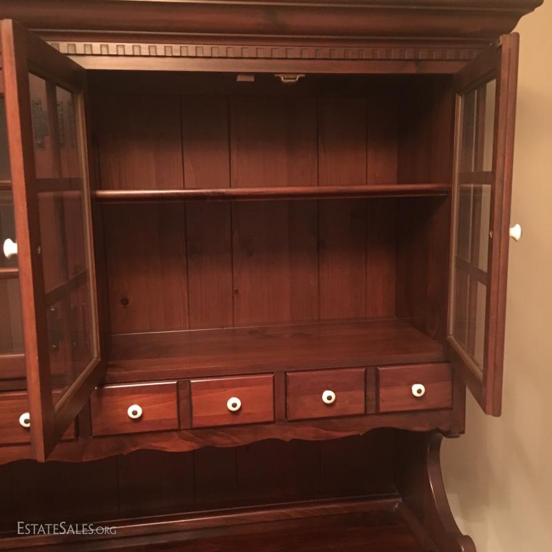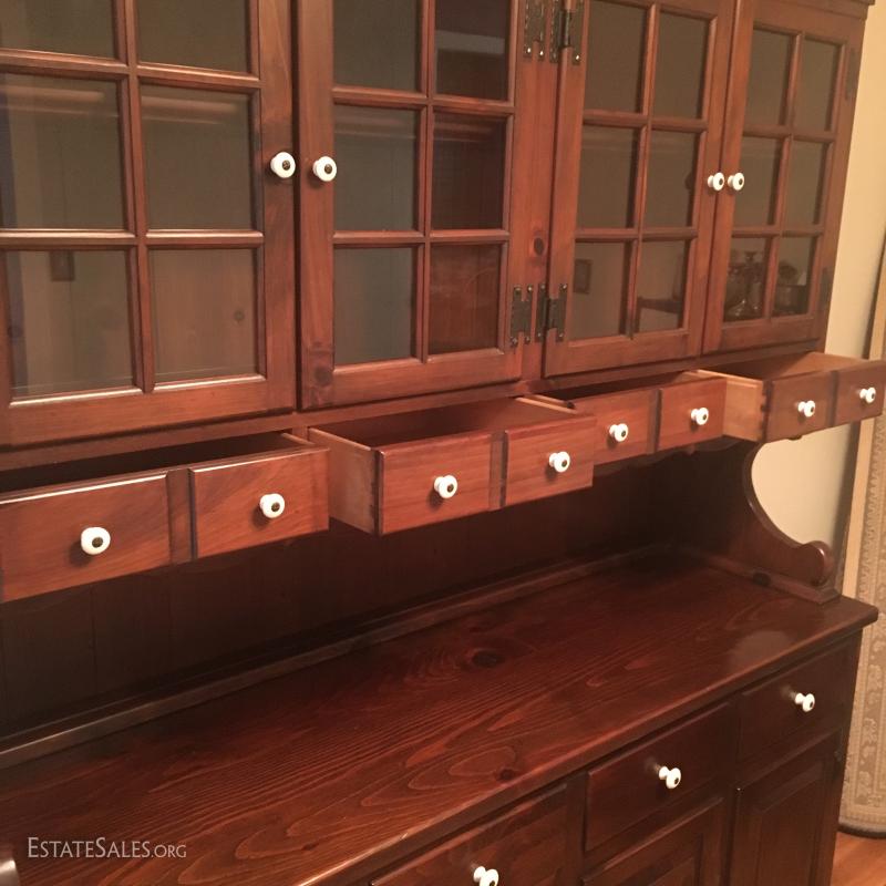 China cabinet matches dry sink in Lot 48. Glass cabinet areas have dish rail on both shelves. 8 total drawers and 4 cabinets with two shelves in each. Piece measures 63" x 19.5" x 76". This item is available for local pick up in Asheville, NC only.