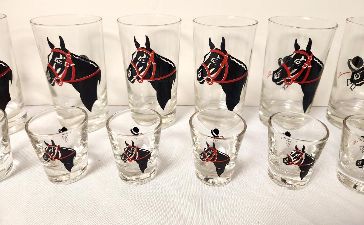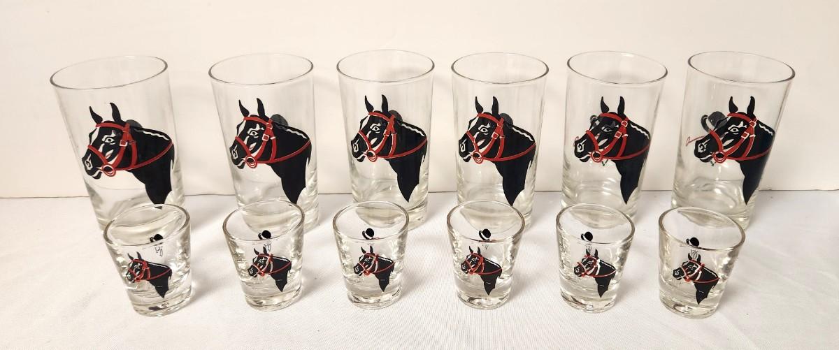This Black Horse Bar set in EXCELLENT condition is tough to find. You get all you see here - 6 glasses, 6 shot glasses. These were made in the 1950's - Mid Century Modern. Internet prices on this set will blow you away......
