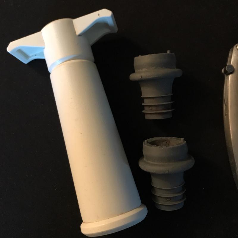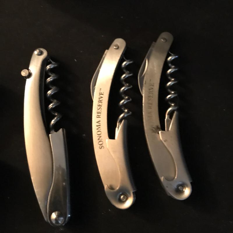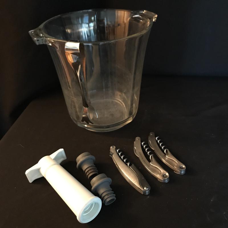 Beautiful Large Ice Bucket with silver tongs. Lot also includes three wine openers and a wine pump with two rubber corks. Shipping or local pick up in Flat Rock, NC.