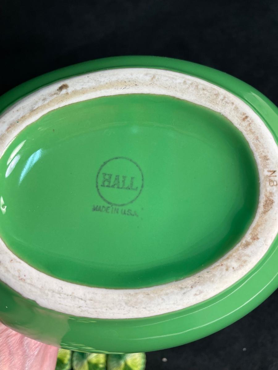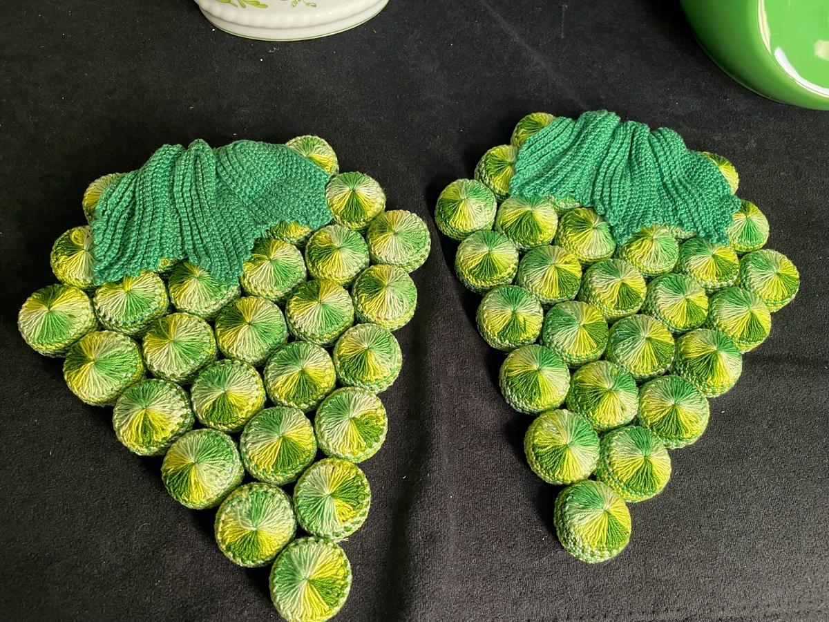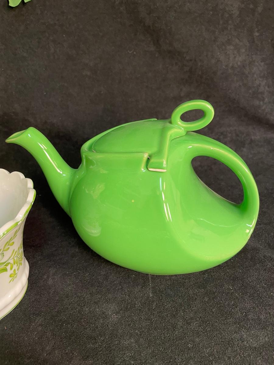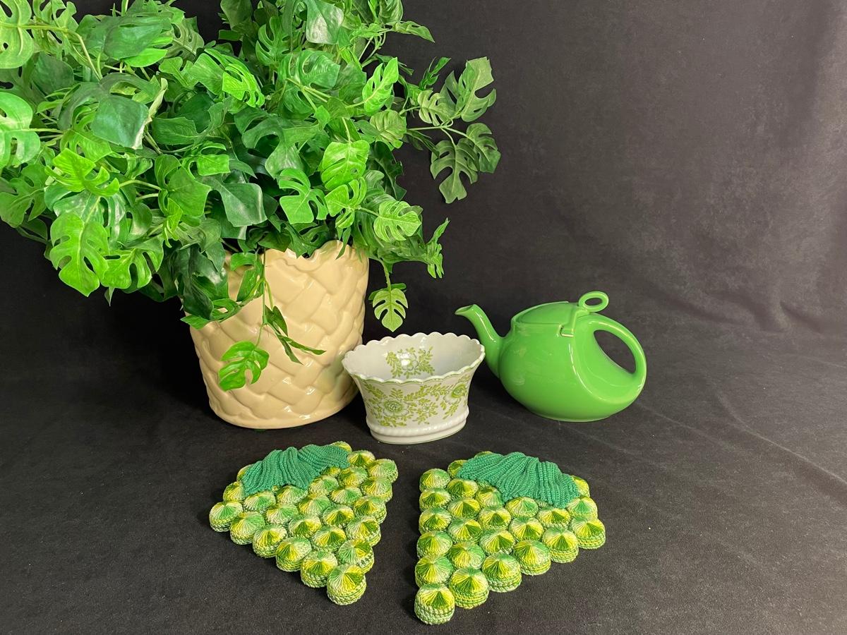 Vintage Hall teapot in bright green, along with a silk plant in a ceramic planter, small planter and a pair of handmade (never used) crocheted trivets
