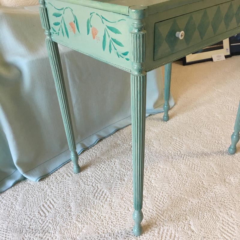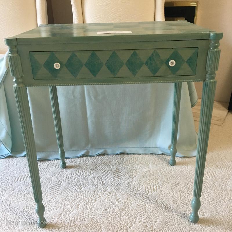 Hand painted, checkered top, wood table with stenciled sides. Small front drawer with white hardware pulls. A bit rocky. Loose leg.