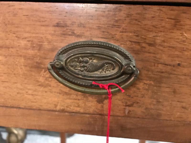 Great Henkle Harris drop leaf pembroke mahogany end table. Hepplewhite legs. Brass pull. 14" W closed/30 1/4" W open x 22" x 27" H