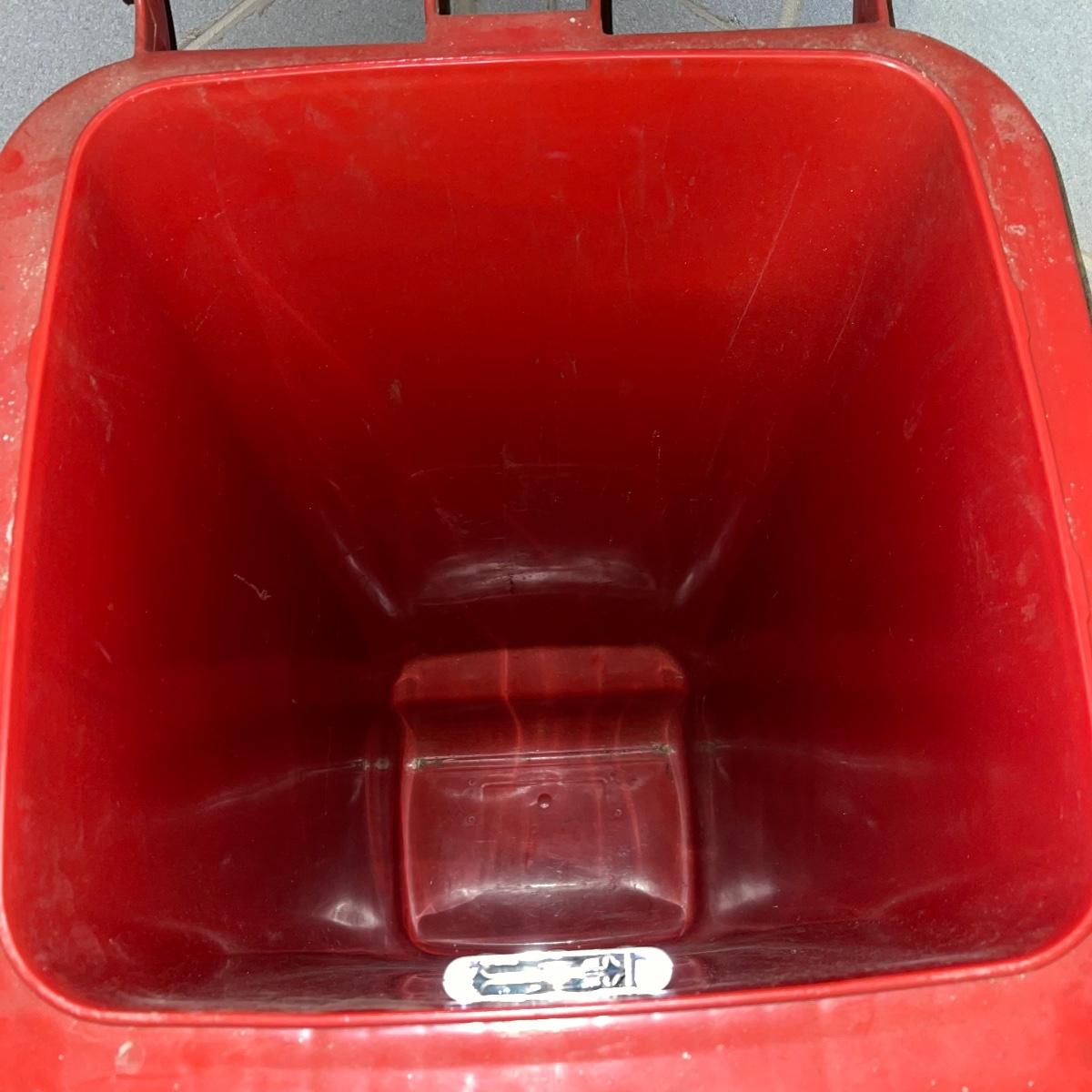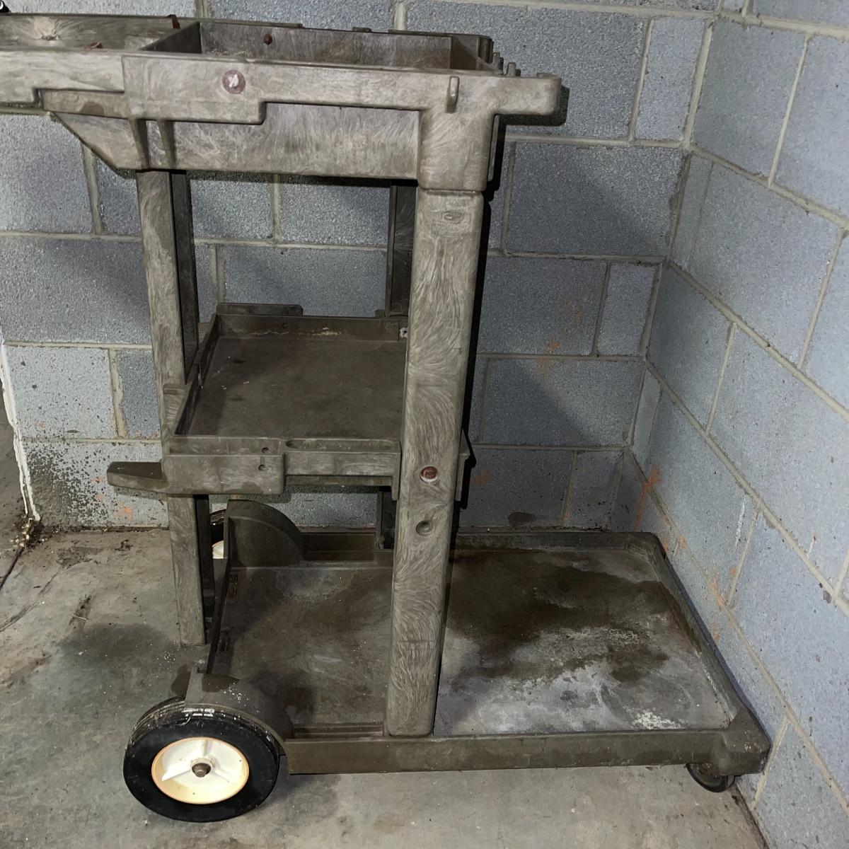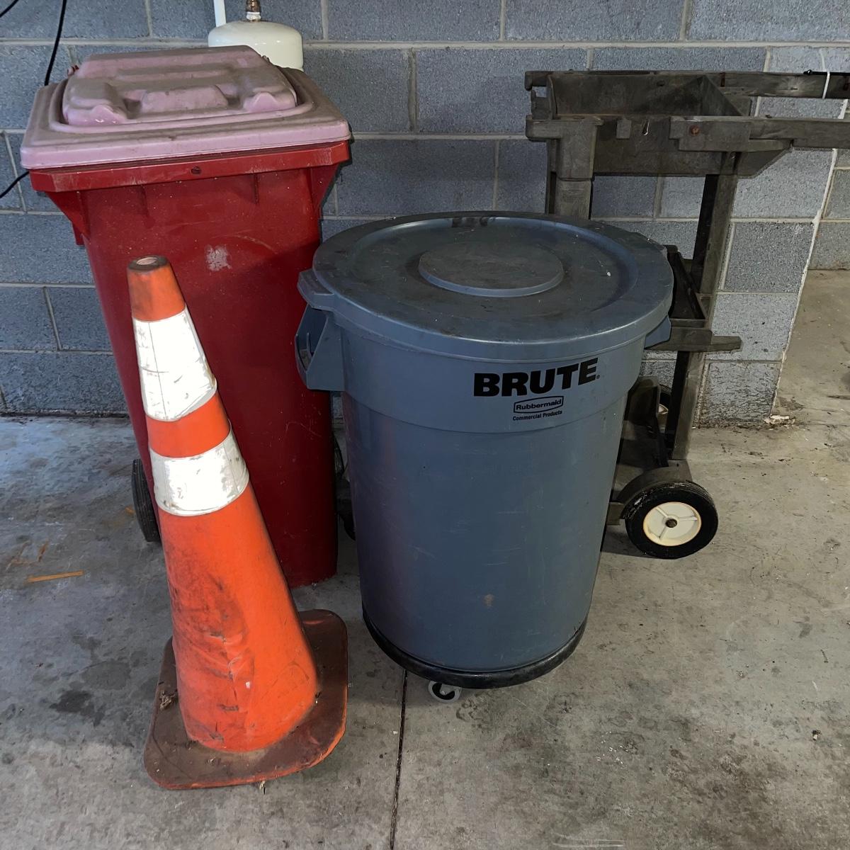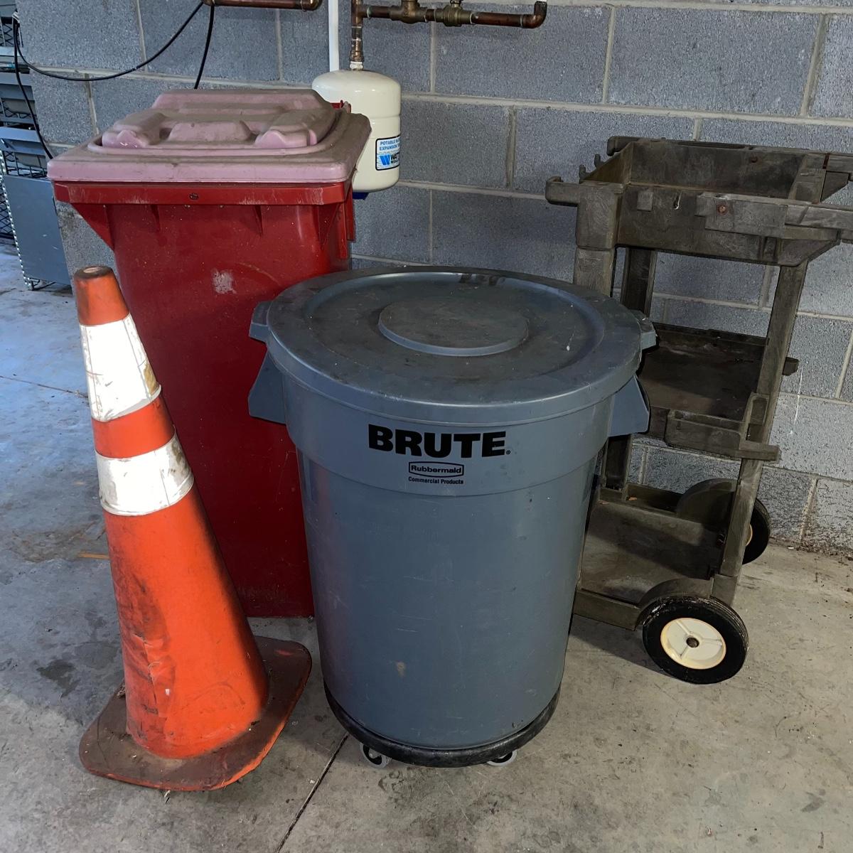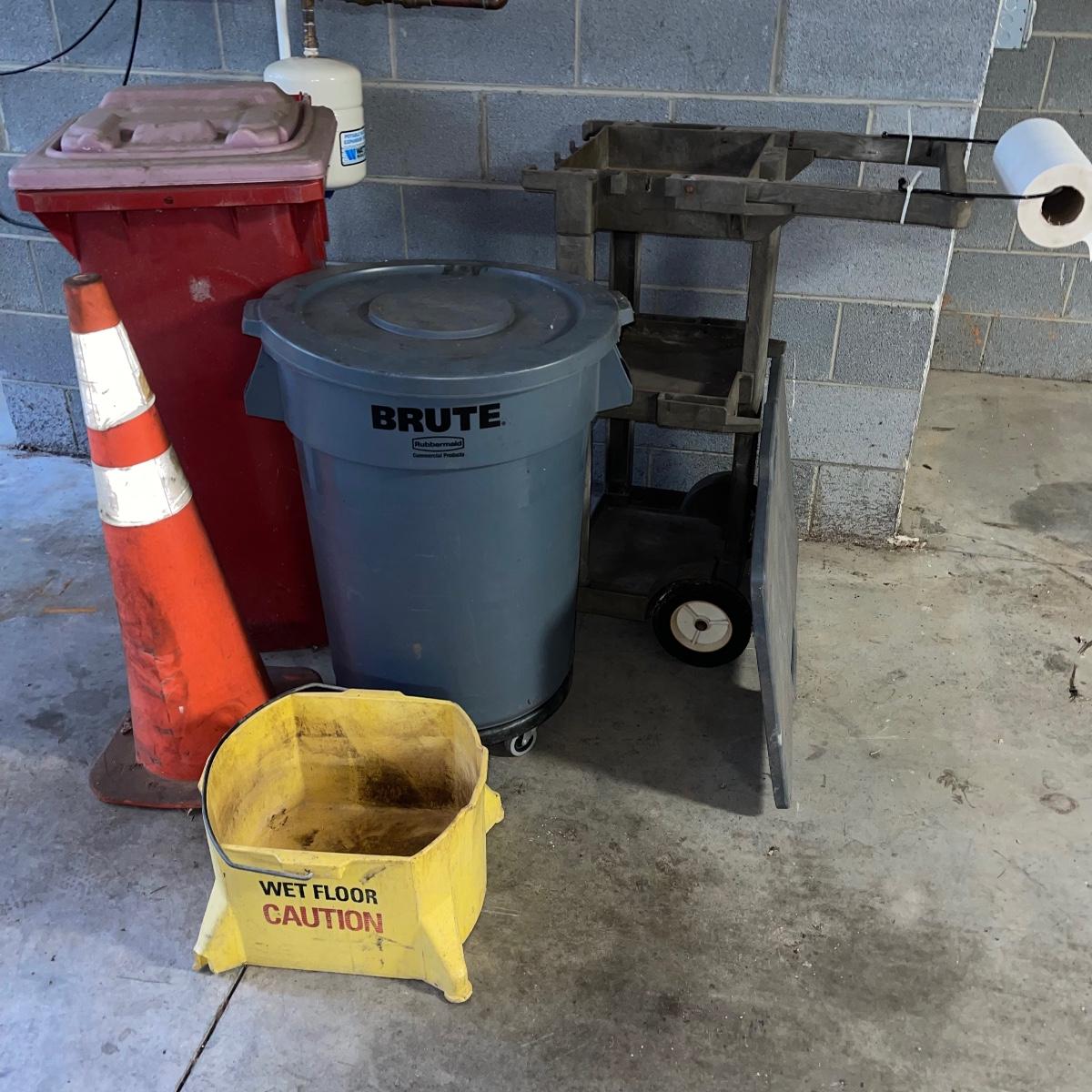 Preparing for a huge cleaning spree? This lot of a janitor’s cart, a mop bucket, two garbage cans, and a cone is ideal for those cleaning needs. The janitor’s cart has four wheels that move smoothly. It’s body is gray heavy duty plastic and it has an attached spot for paper towels. Next up is a lidded gray Brute Rubbermaid trash can on wheels for easy portability. It is 32 inches tall and is a 32 gallon can. The second trash can is red and is approximately 42 inches tall. It is quadrilateral with an attached lid and two back wheels. The last items are an orange safety cone and a yellow mop bucket that fits perfectly on the janitor’s cart. Give these items a spray or wipe down and you’ll experience the ease of cleaning with a cart and portable trash cans.