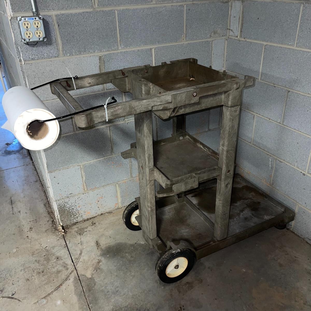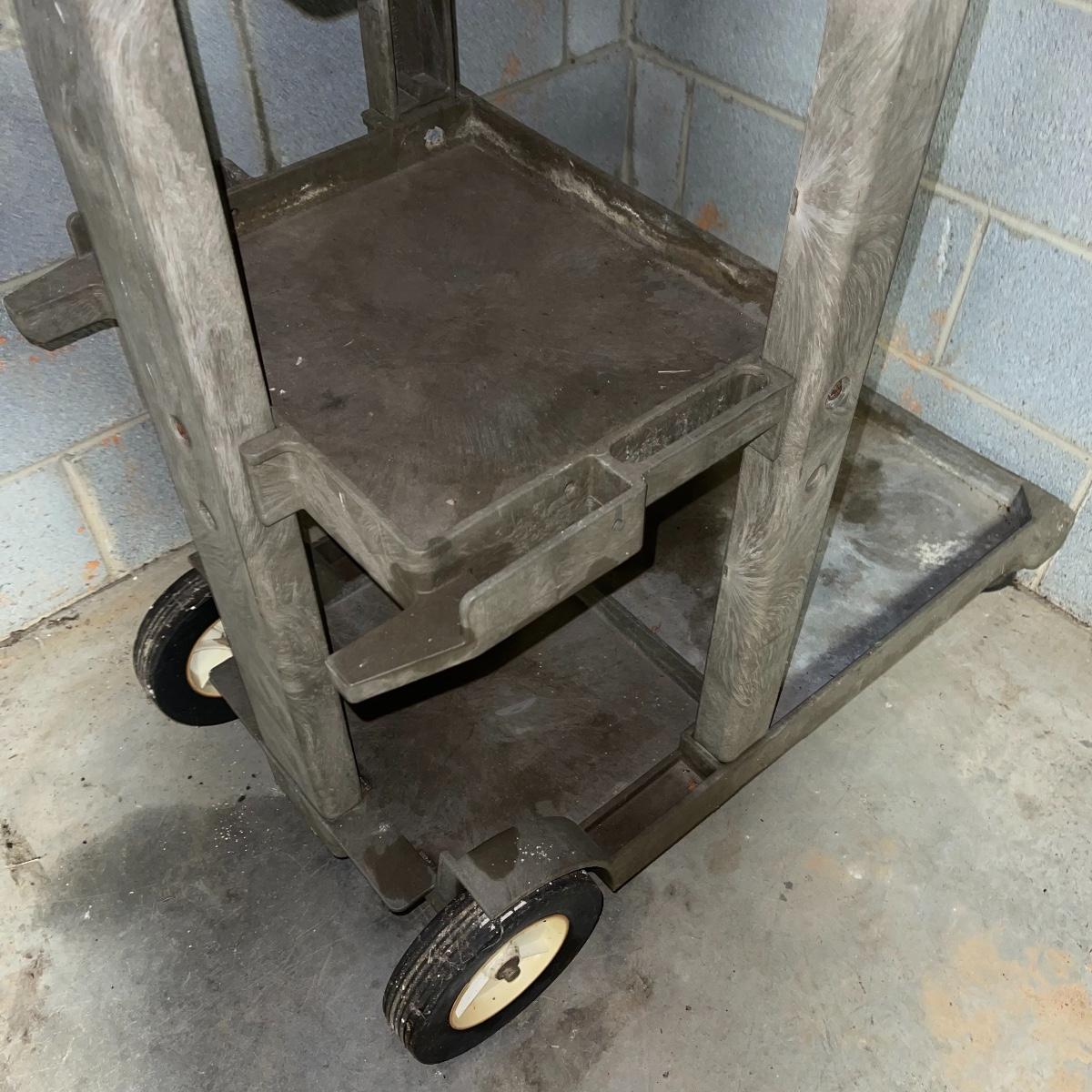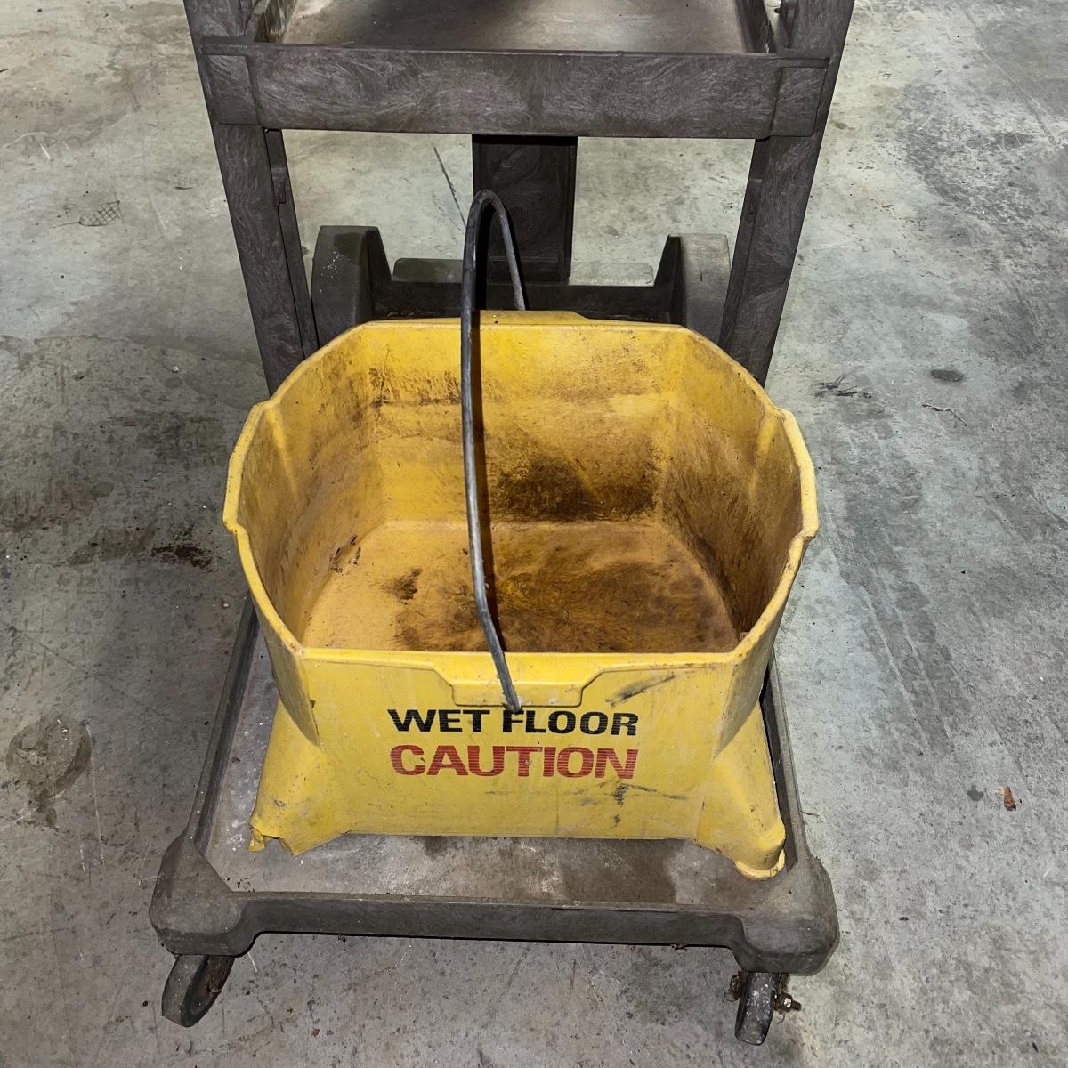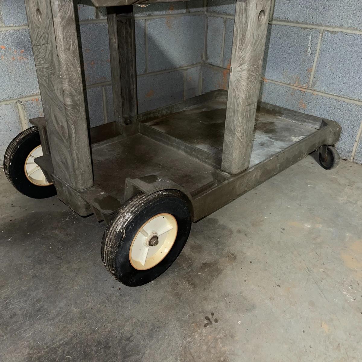 Preparing for a huge cleaning spree? This lot of a janitor’s cart, a mop bucket, two garbage cans, and a cone is ideal for those cleaning needs. The janitor’s cart has four wheels that move smoothly. It’s body is gray heavy duty plastic and it has an attached spot for paper towels. Next up is a lidded gray Brute Rubbermaid trash can on wheels for easy portability. It is 32 inches tall and is a 32 gallon can. The second trash can is red and is approximately 42 inches tall. It is quadrilateral with an attached lid and two back wheels. The last items are an orange safety cone and a yellow mop bucket that fits perfectly on the janitor’s cart. Give these items a spray or wipe down and you’ll experience the ease of cleaning with a cart and portable trash cans.