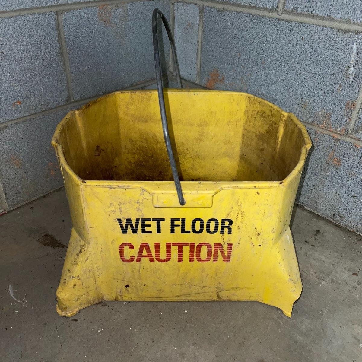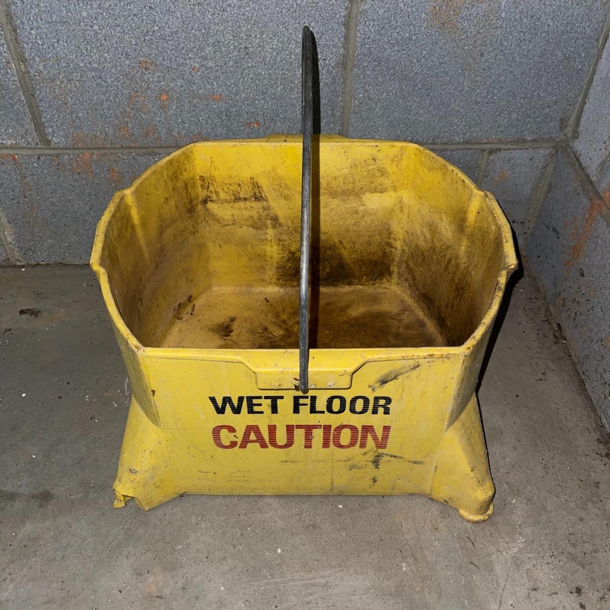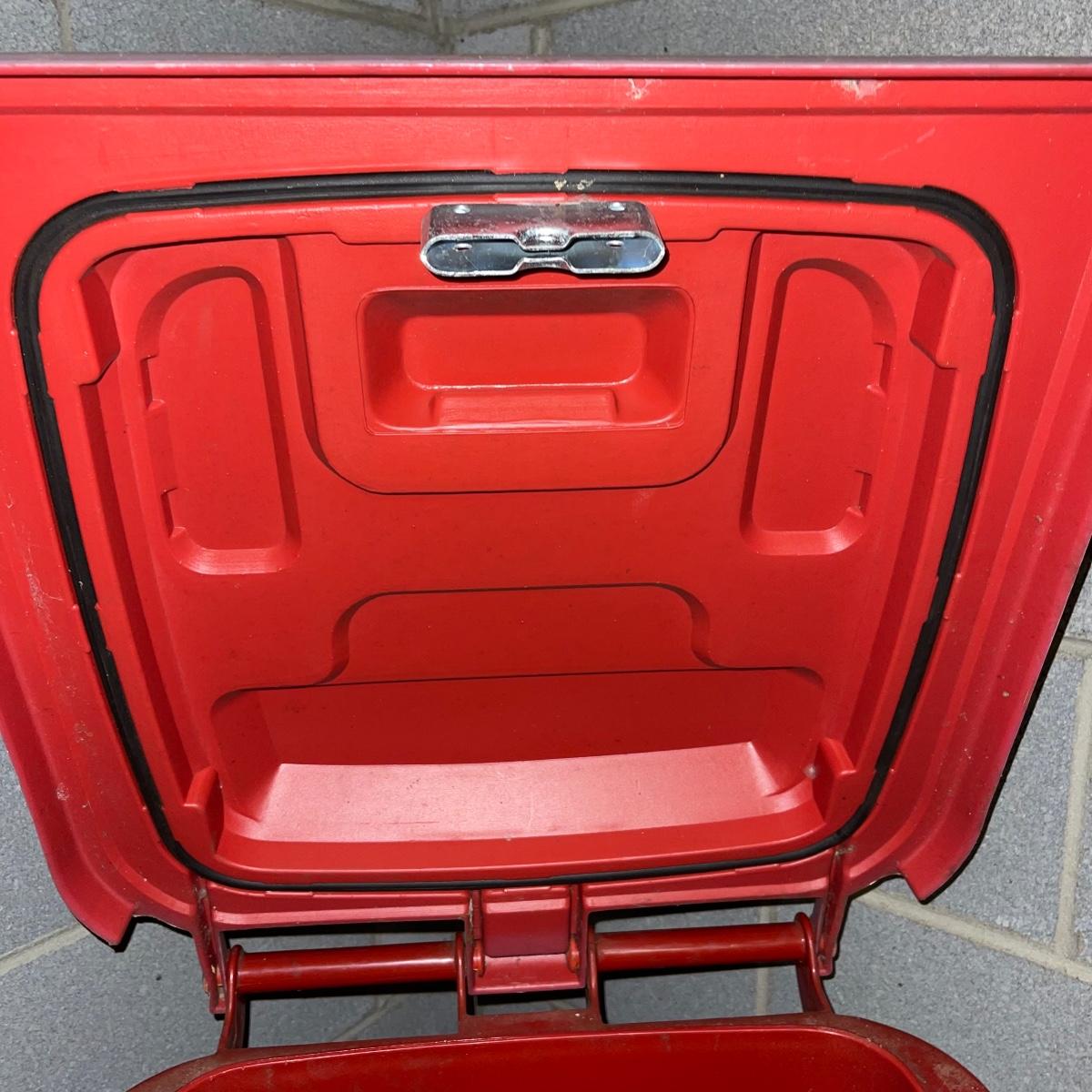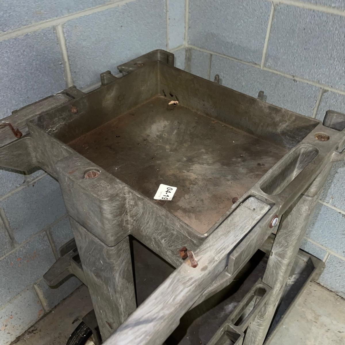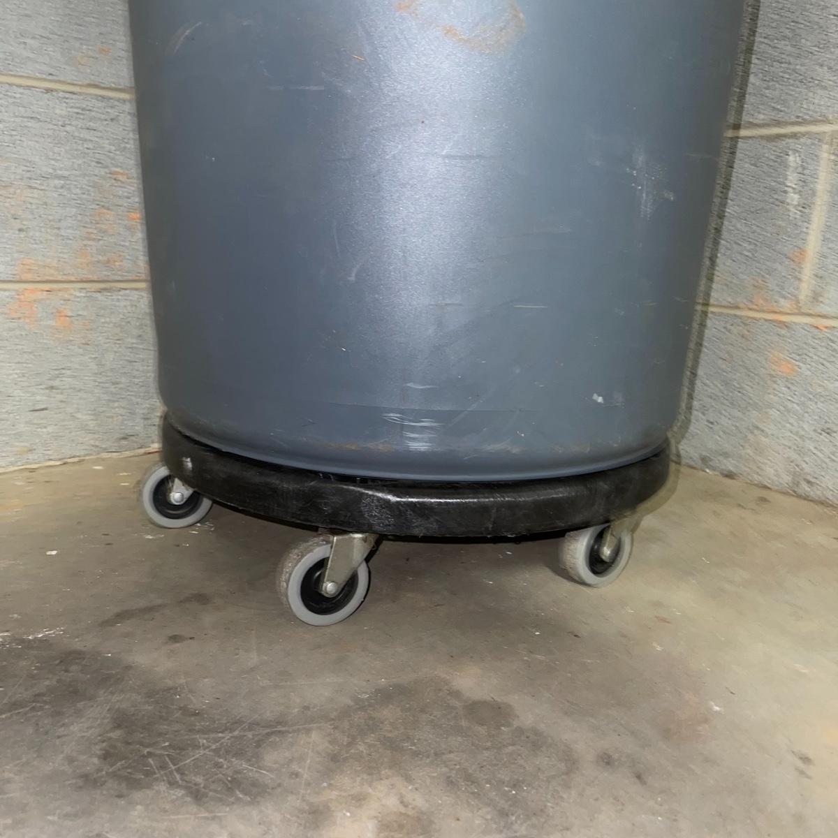 Preparing for a huge cleaning spree? This lot of a janitor’s cart, a mop bucket, two garbage cans, and a cone is ideal for those cleaning needs. The janitor’s cart has four wheels that move smoothly. It’s body is gray heavy duty plastic and it has an attached spot for paper towels. Next up is a lidded gray Brute Rubbermaid trash can on wheels for easy portability. It is 32 inches tall and is a 32 gallon can. The second trash can is red and is approximately 42 inches tall. It is quadrilateral with an attached lid and two back wheels. The last items are an orange safety cone and a yellow mop bucket that fits perfectly on the janitor’s cart. Give these items a spray or wipe down and you’ll experience the ease of cleaning with a cart and portable trash cans.