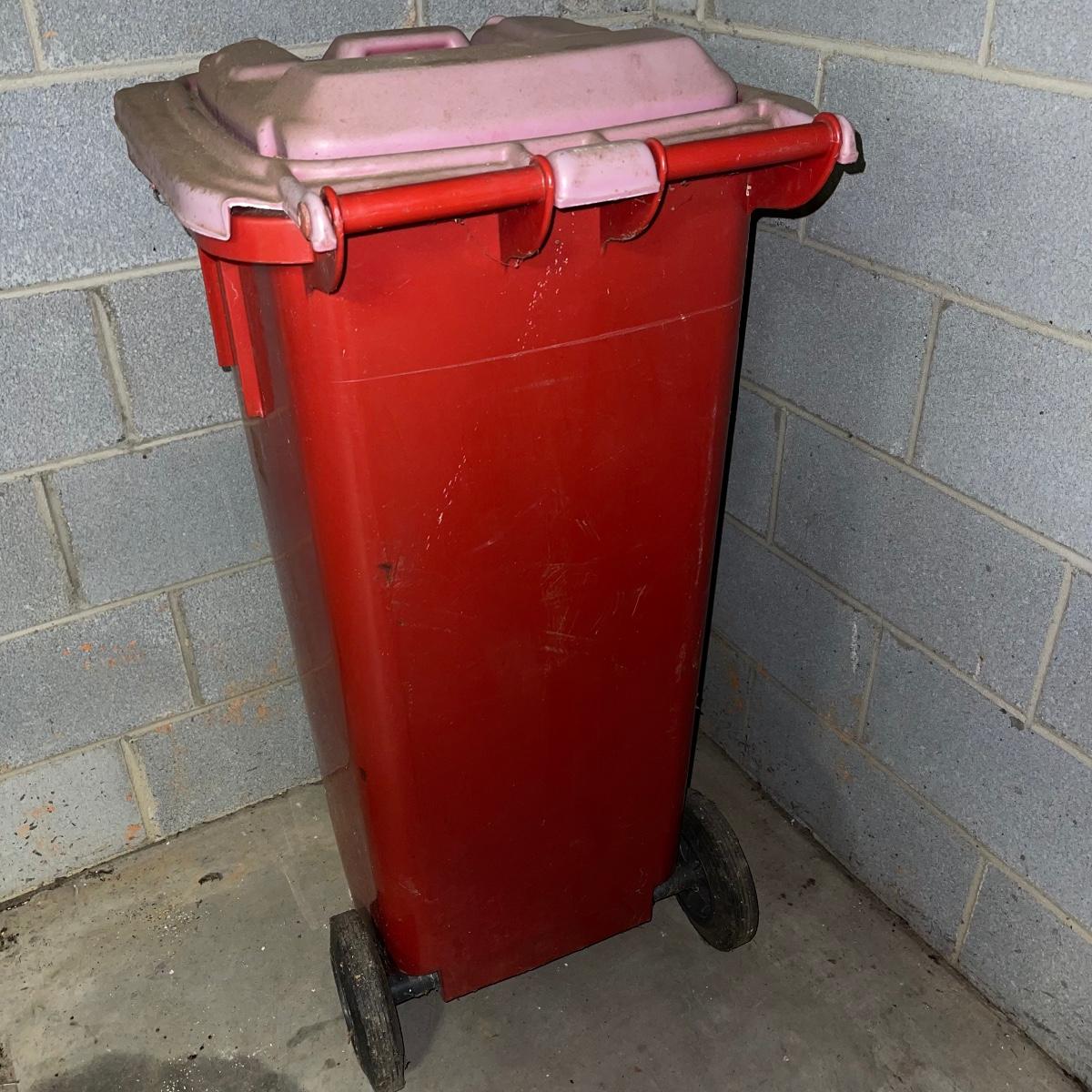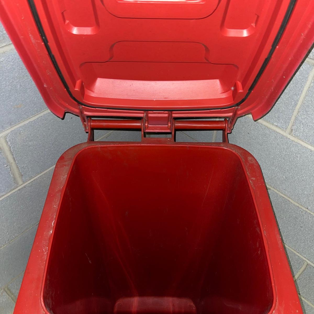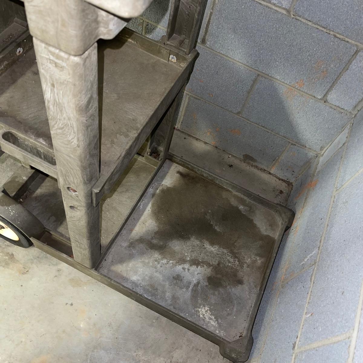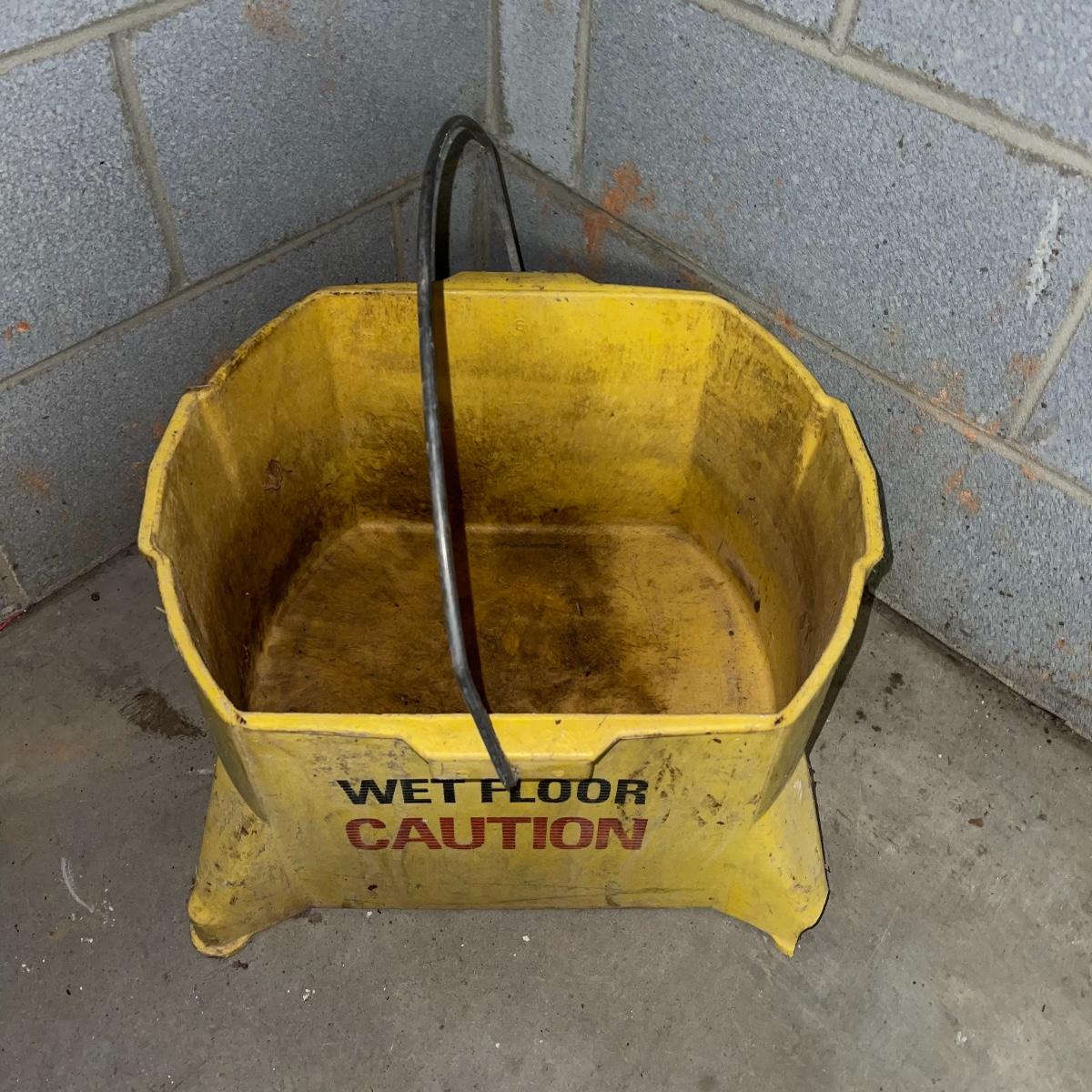 Preparing for a huge cleaning spree? This lot of a janitor’s cart, a mop bucket, two garbage cans, and a cone is ideal for those cleaning needs. The janitor’s cart has four wheels that move smoothly. It’s body is gray heavy duty plastic and it has an attached spot for paper towels. Next up is a lidded gray Brute Rubbermaid trash can on wheels for easy portability. It is 32 inches tall and is a 32 gallon can. The second trash can is red and is approximately 42 inches tall. It is quadrilateral with an attached lid and two back wheels. The last items are an orange safety cone and a yellow mop bucket that fits perfectly on the janitor’s cart. Give these items a spray or wipe down and you’ll experience the ease of cleaning with a cart and portable trash cans.