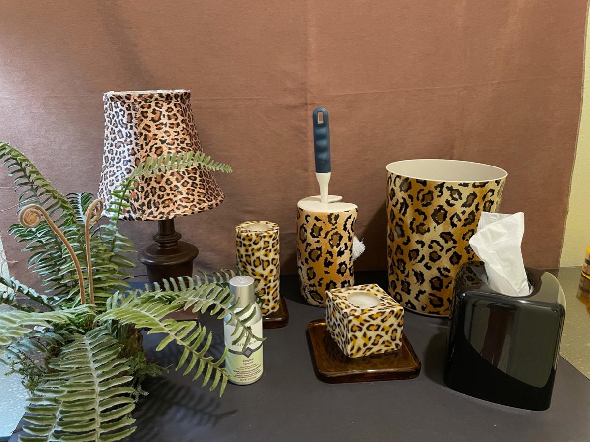 silk arrangement, small lamp, wastebasket and bowl brush holder, two candles and a kleenex box cover