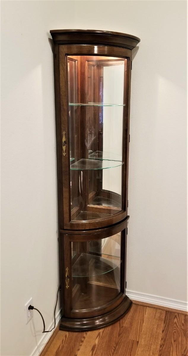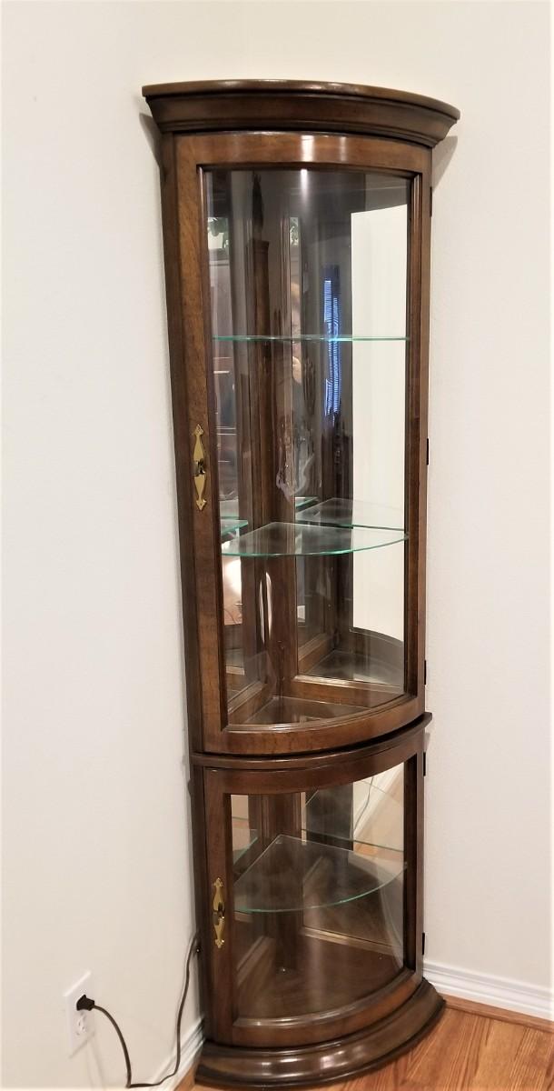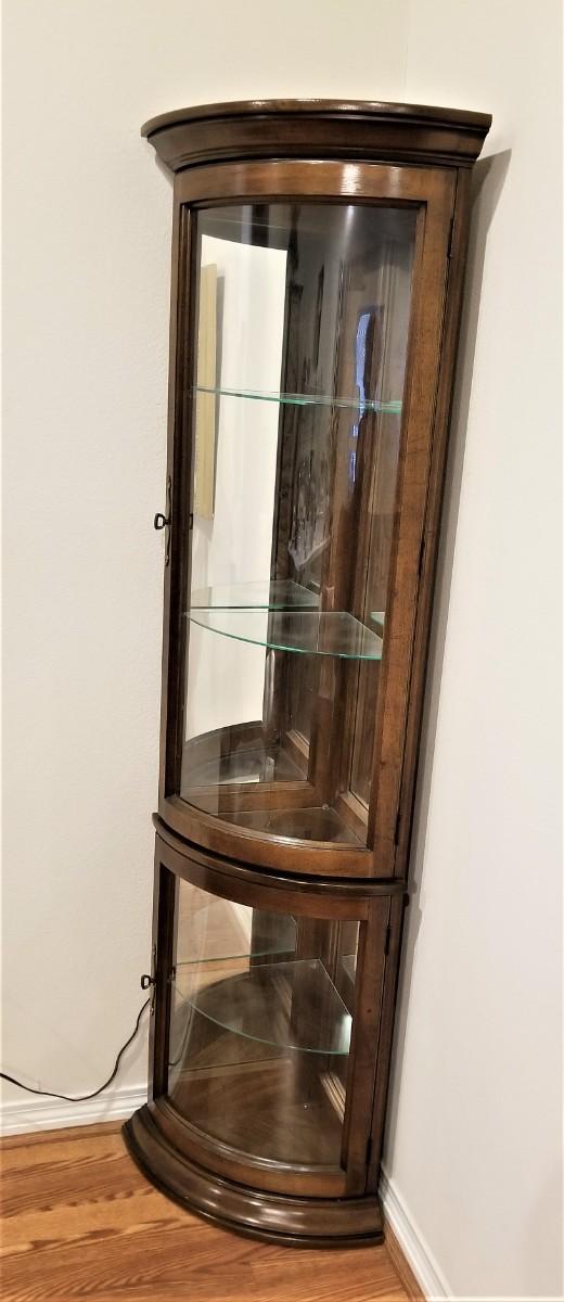 Corner lighted Curio Cabinet - 3 glass shelves that can be removed but not adjustable. 6 feet tall, about 22" across. Cabinet is in one piece. Light works fine.