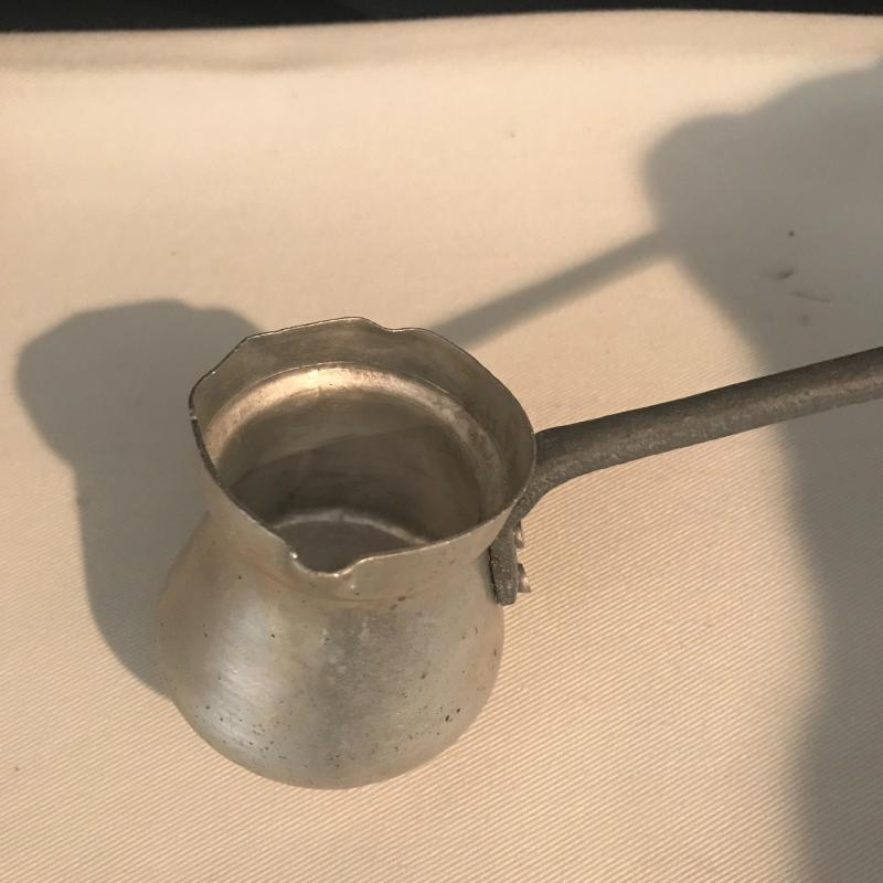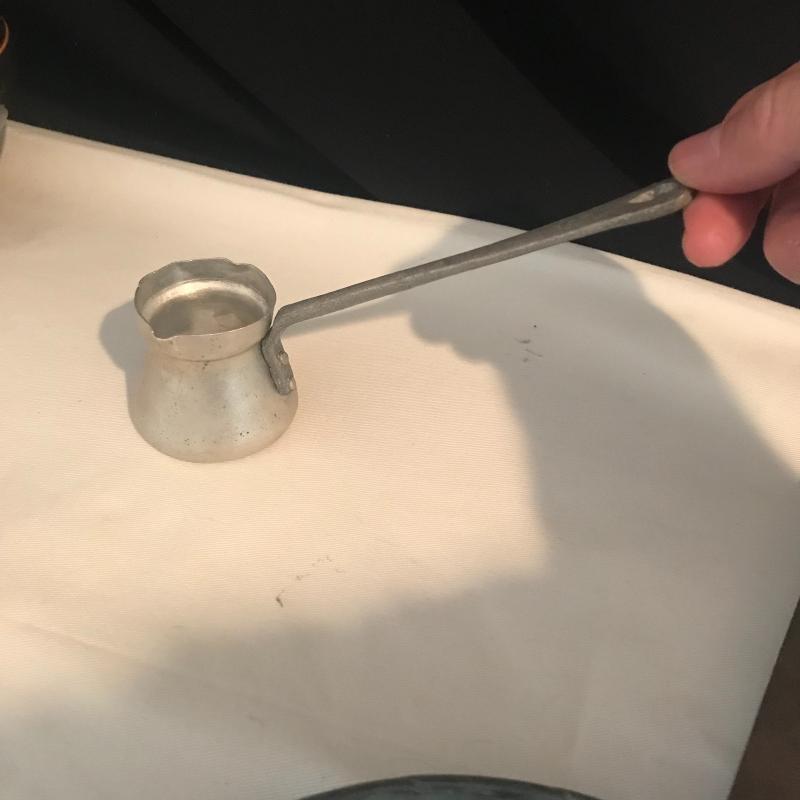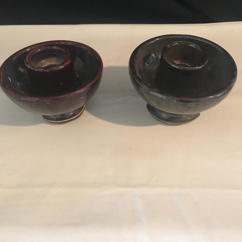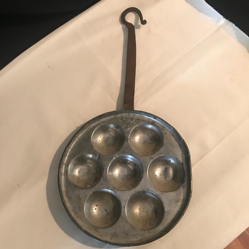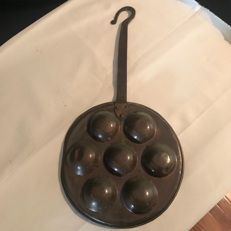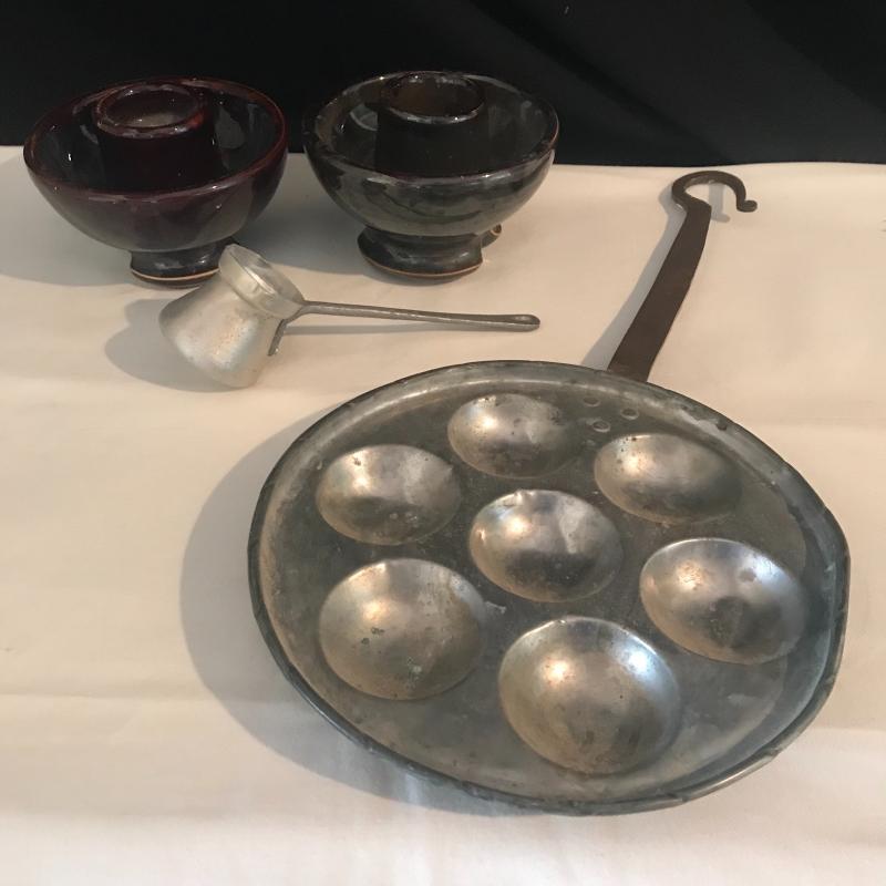 Locke Ceramic Insulators are brown and measure 6” x3”. Small tin ladle and copper and metal egg pan. Both metal pieces have dents in them. Shipping available.