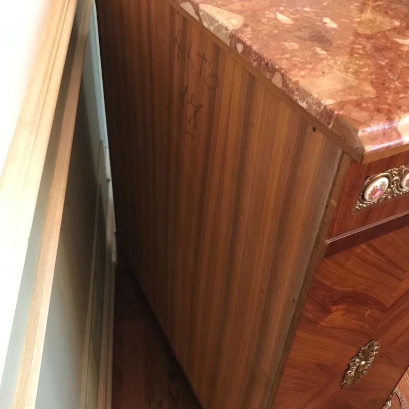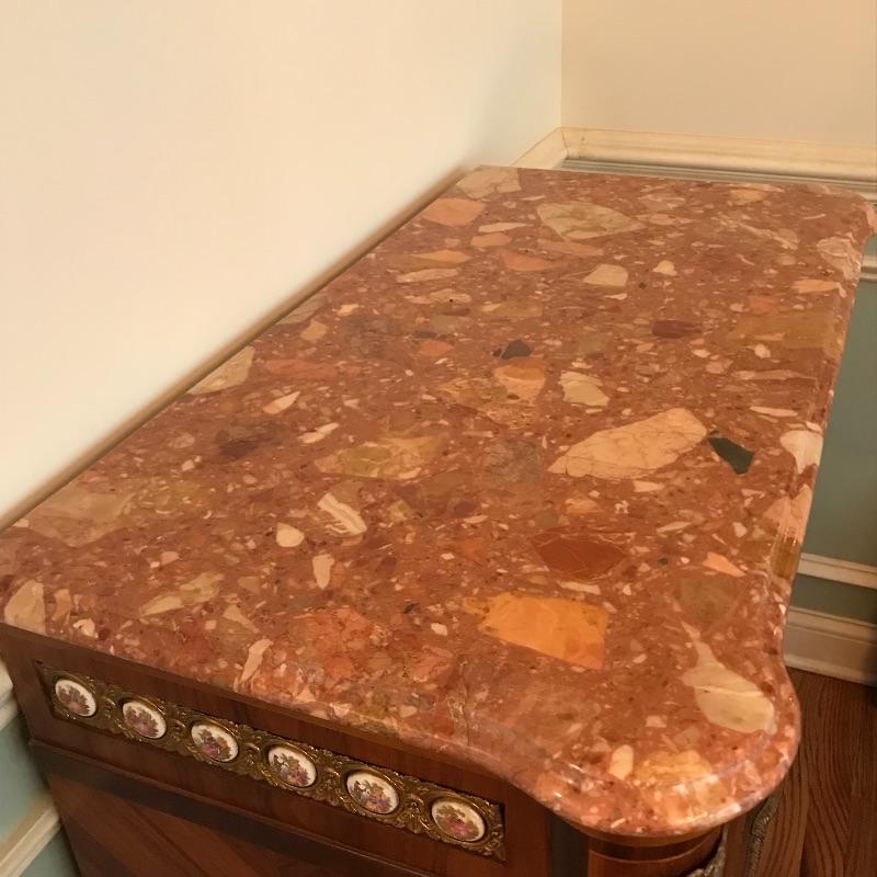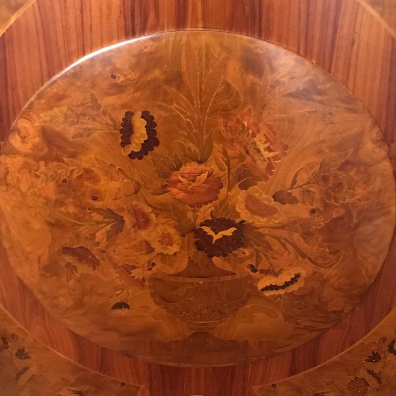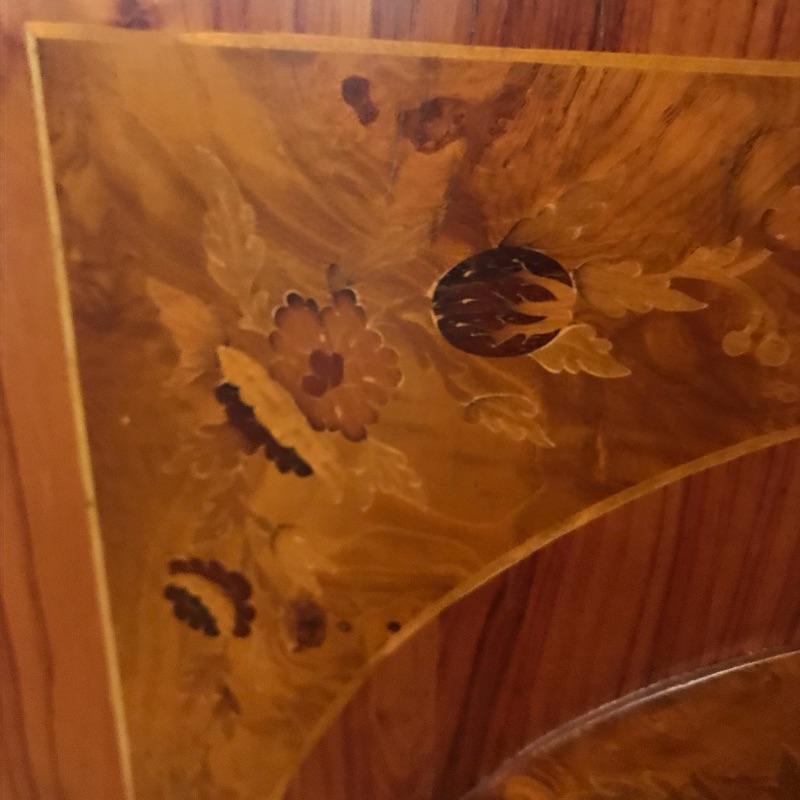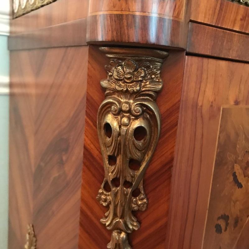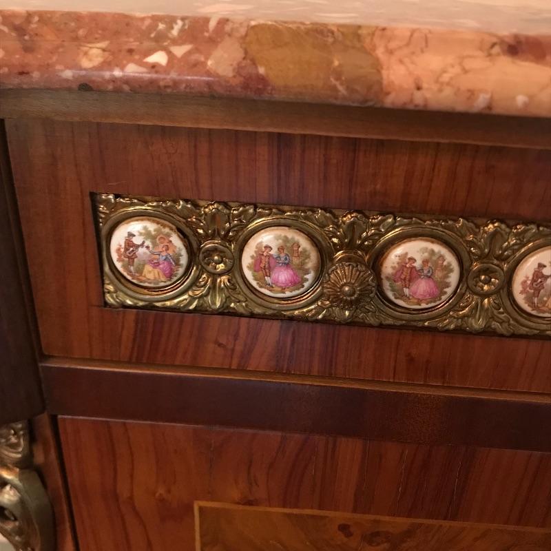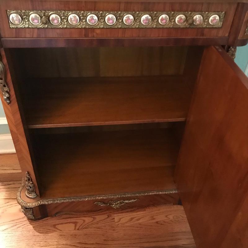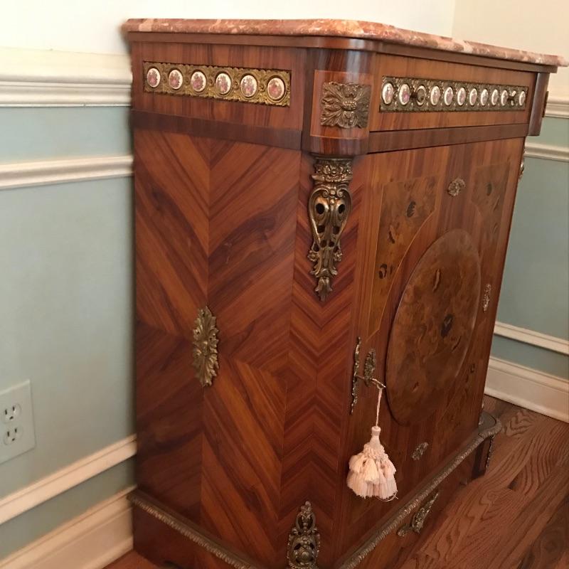 This gorgeous Victorian-style cabinet is in excellent condition and approx. 33.5” x 17.5” x 38.5”. Marble piece sets on top and can be removed for easier transport. Fine details include metal trim, inlaid wood, and china/porcelain accents with Victorian lads and ladies. See pics. Local pickup only.