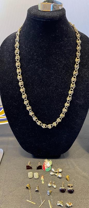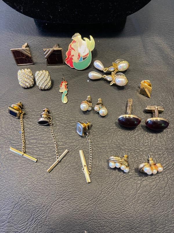 (2) sets of cuff links, (4) pins, seiko watch, (4) pairs of earrings, Disney pendant and pin, necklace.