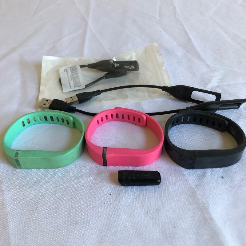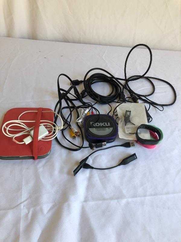The Fitbit powered on when tested and the light came on and we have included 3 different bands for it and 3 charging cables. The Nook also powered on when tested and it comes with the original cable, another spare cable and a pretty dark pink case. The Roku comes with the wires to connect to the TV and more.
