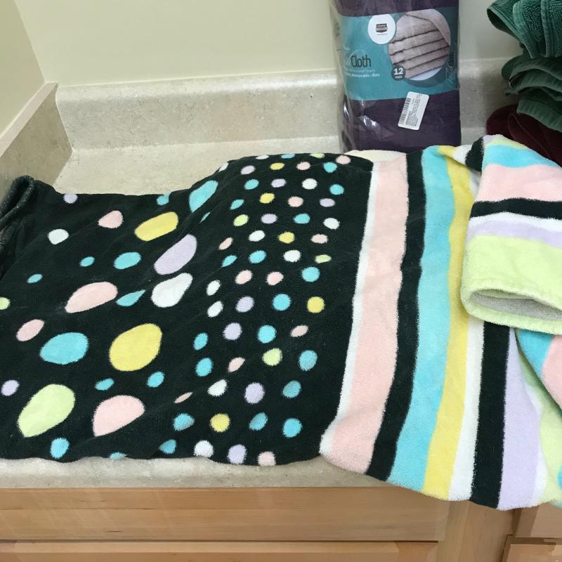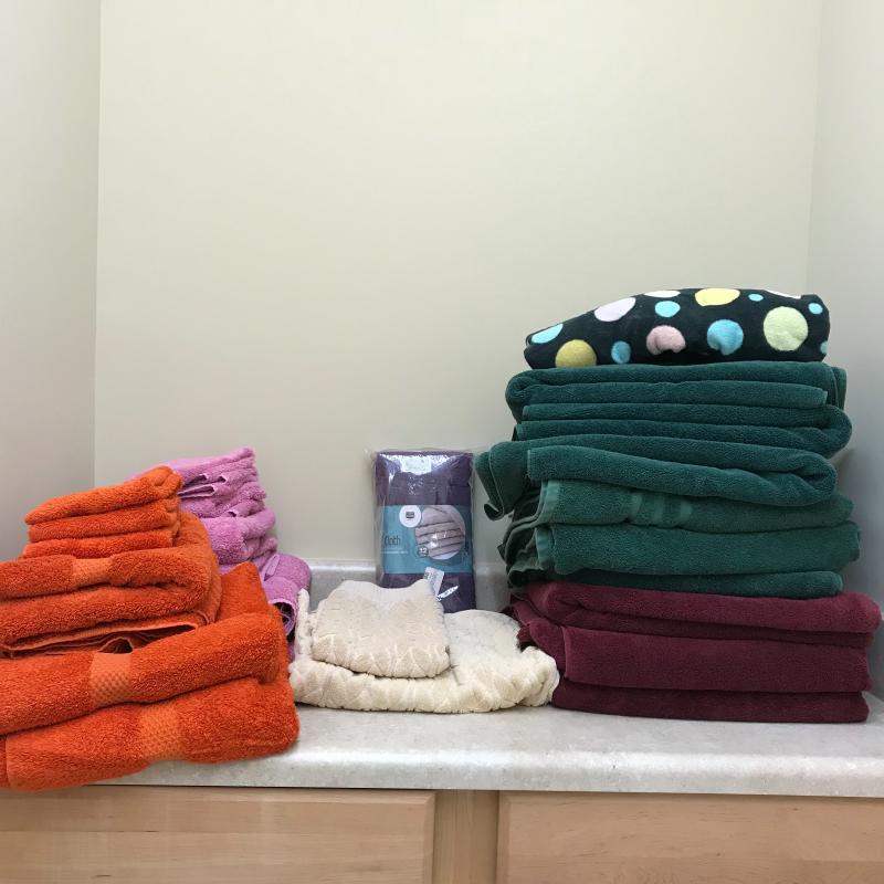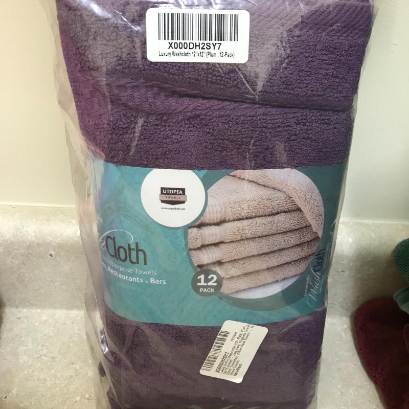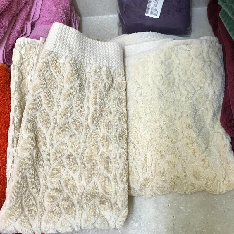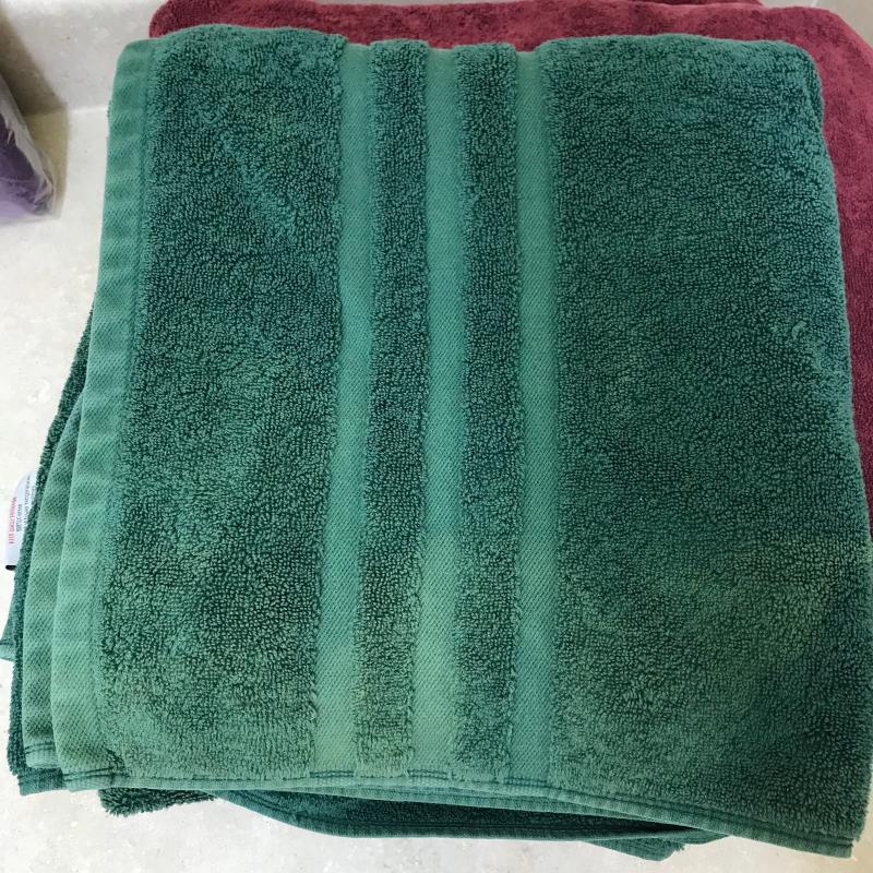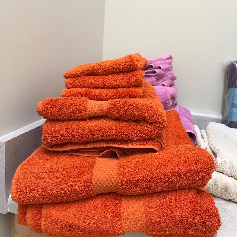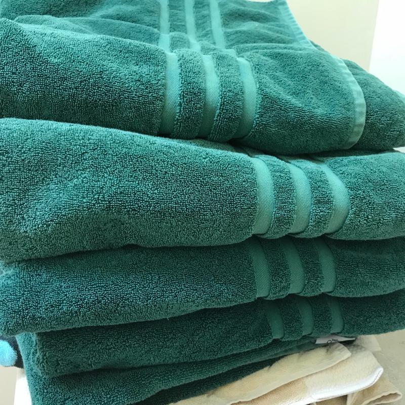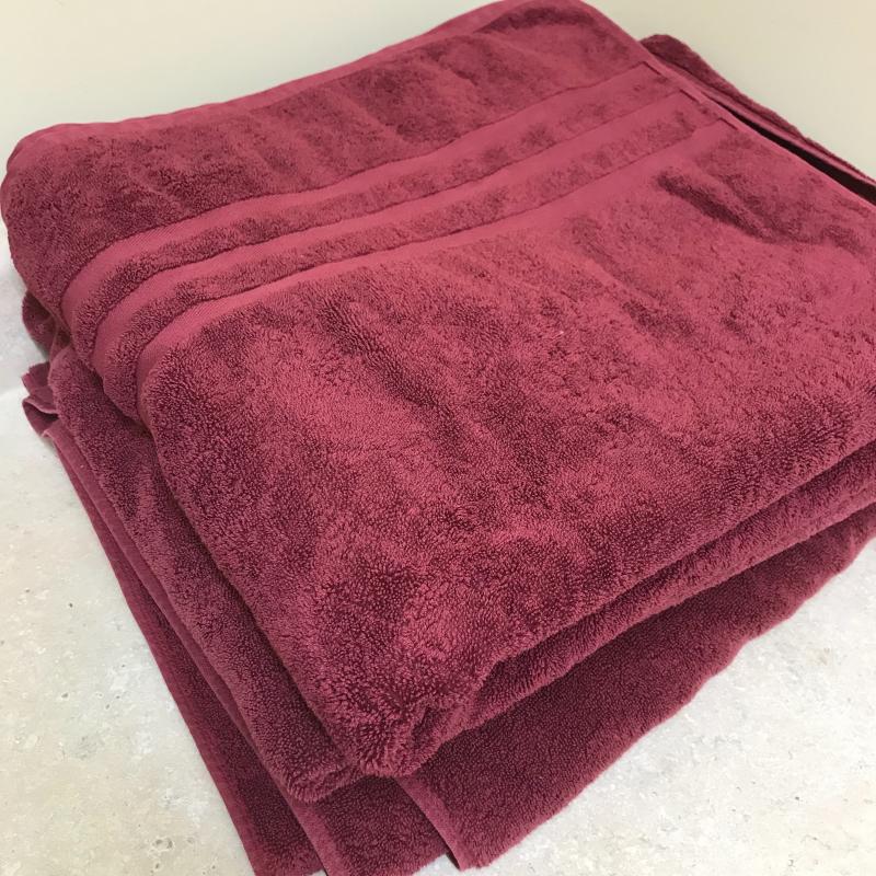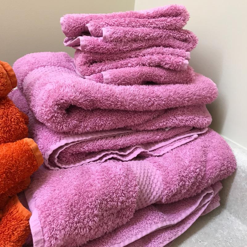 Large collection of bathroom towels. Five forest green and three maroon 100% cotton towels are extra large bath towels. There is an extra matching green towel that is standard size with some slight discoloration. Lot also includes two sets of Yves Delorme guest room towels, one orange and one pink set with three wash cloths, two hand and bath towels each. An unopened pack of purple wash cloths, a spotted and striped beach towel and a matching pale yellow hand and bath towel are also included. See photos. No shipping.