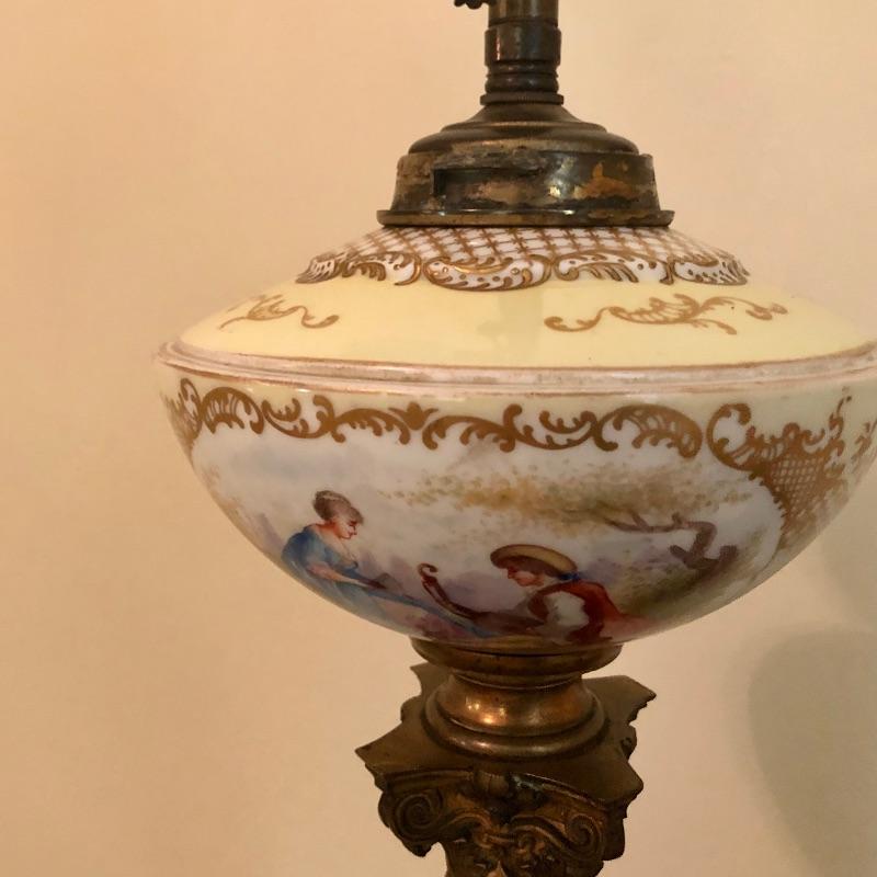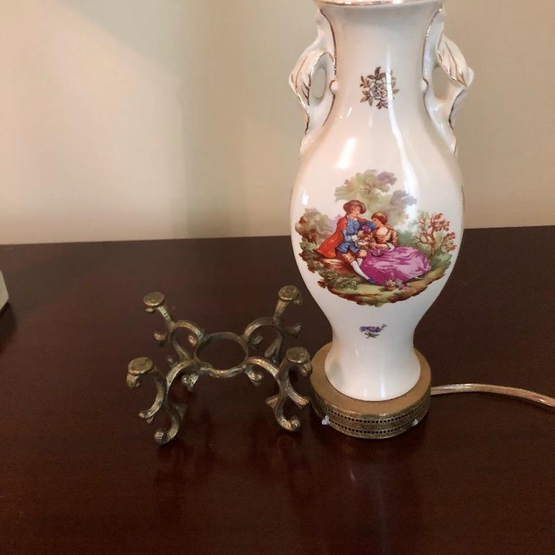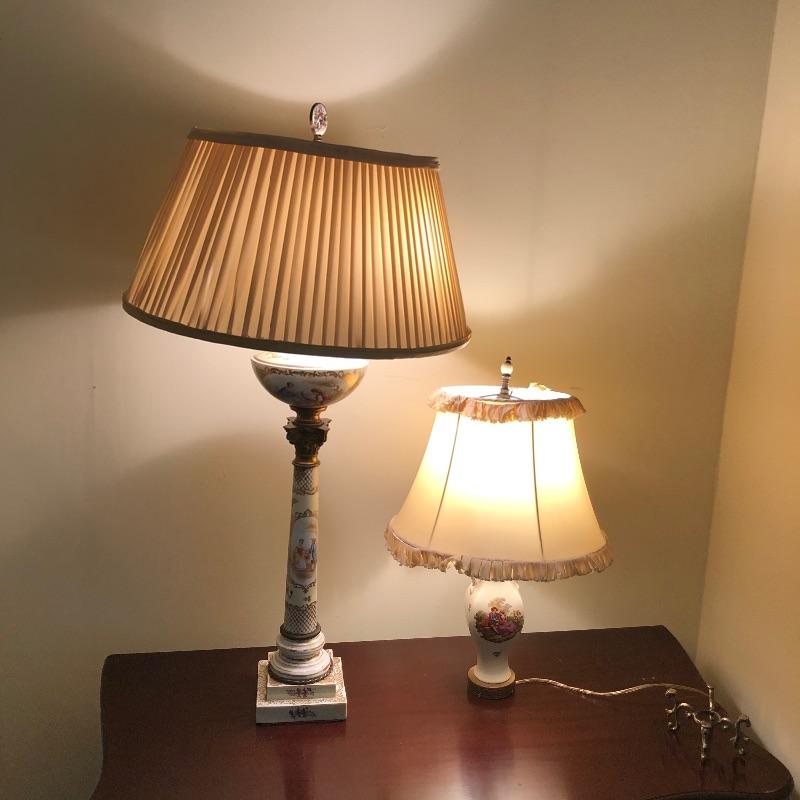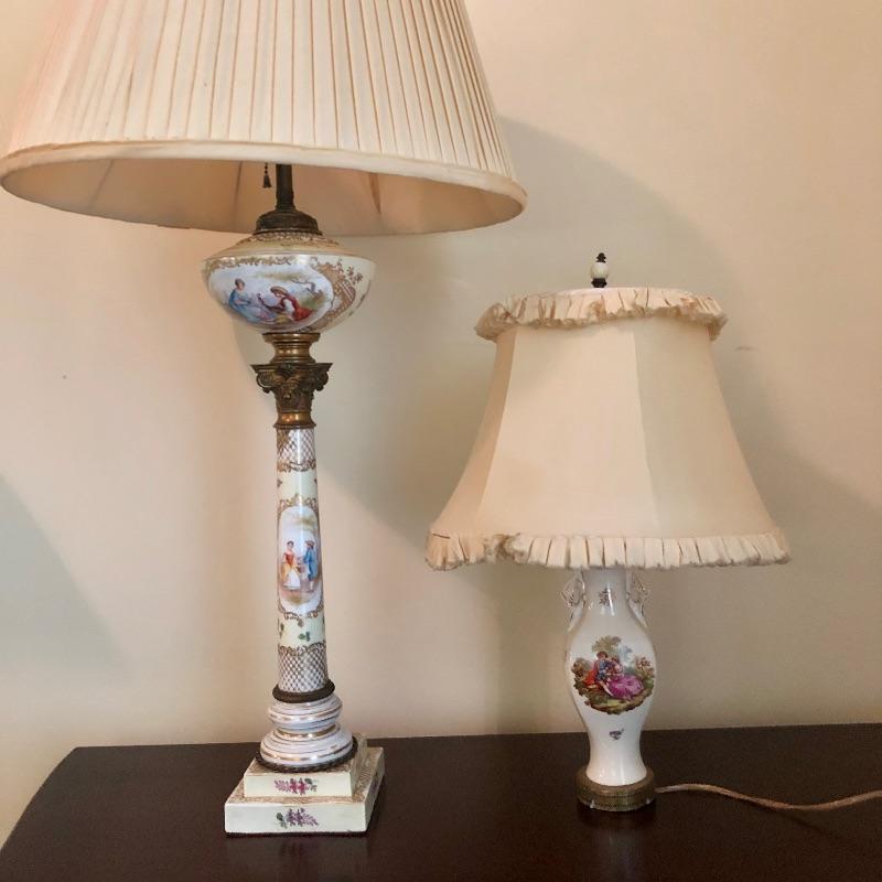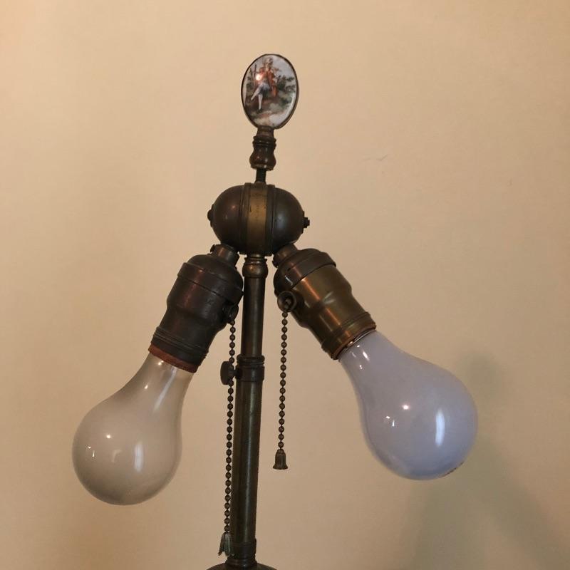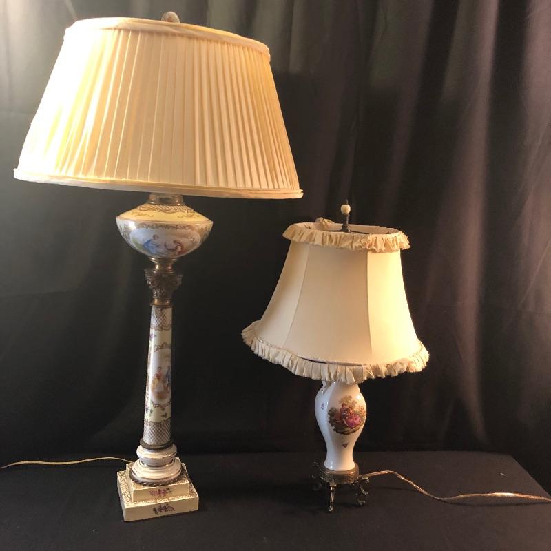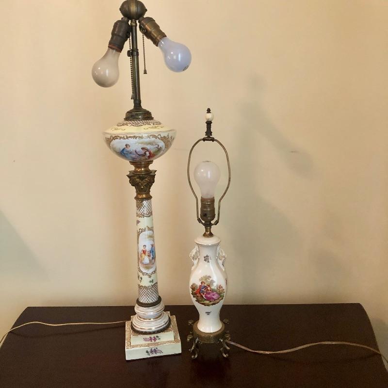 This duo of porcelain and brass lamps are precious. Both shades have seen better days and are probably due for retirement! The taller base measures 36” from base to finial; its porcelain column shaped body is set upon a double plinth coupled with brass elements that makes this an elegant renaissance piece. It houses two independently operated bulbs. The smaller lamp is also made up of porcelain and brass elements with a single bulb. We’ve included a brass stand may not have been originally intended for this lamp but complements it well.